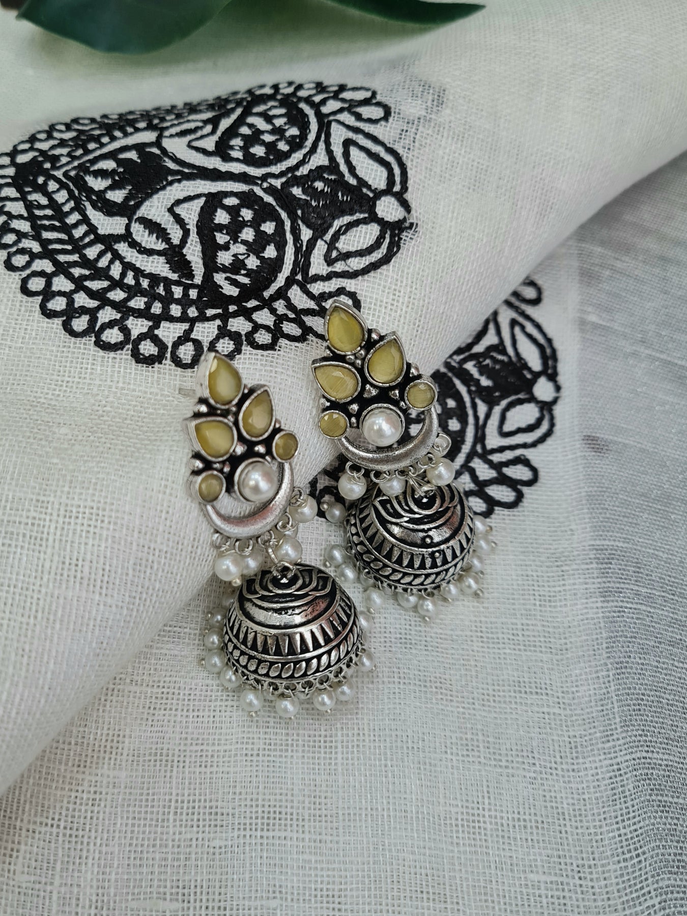 Oxidised Silver Jhumkas ornated with Pearls and Yellow Stones