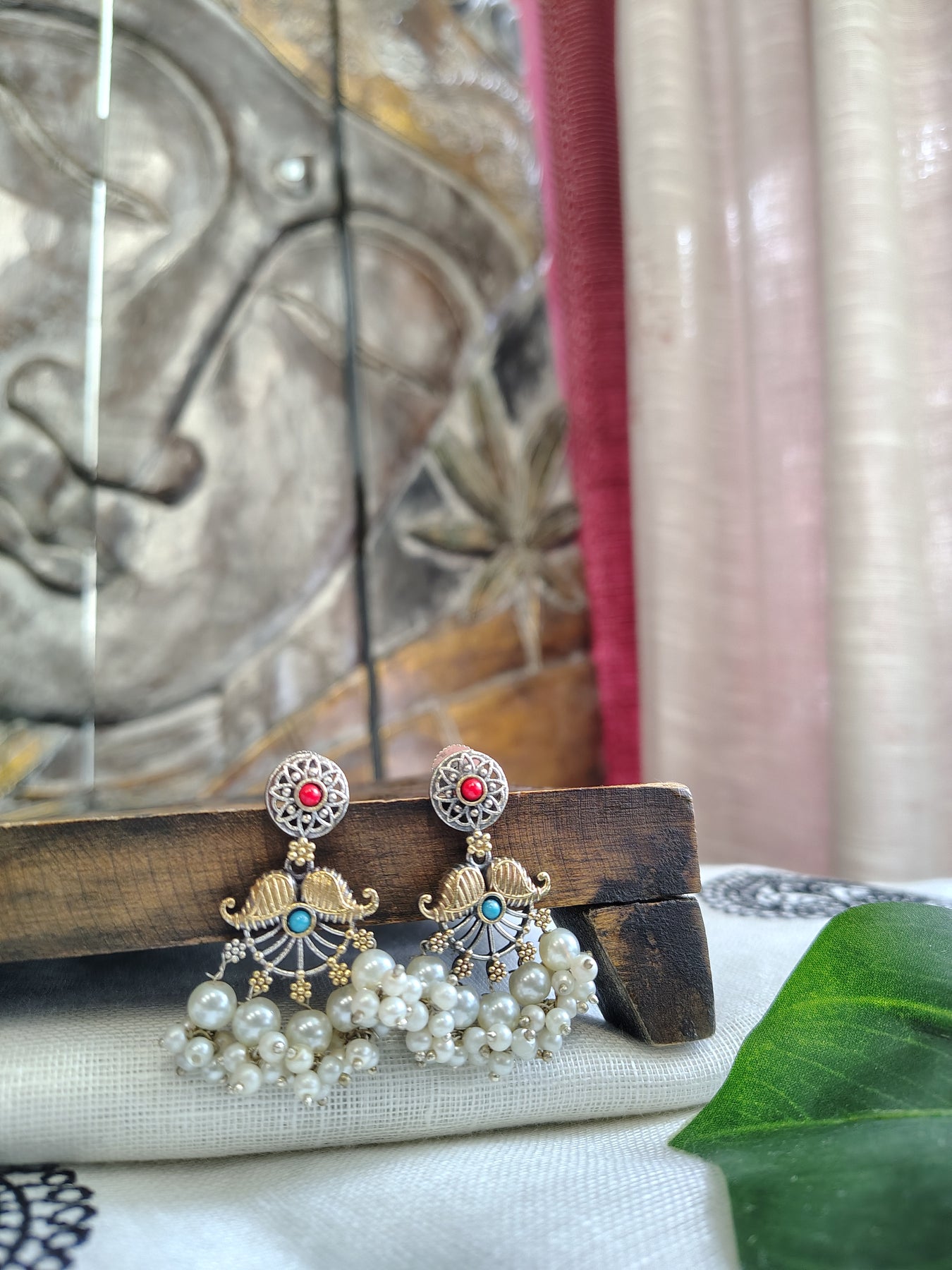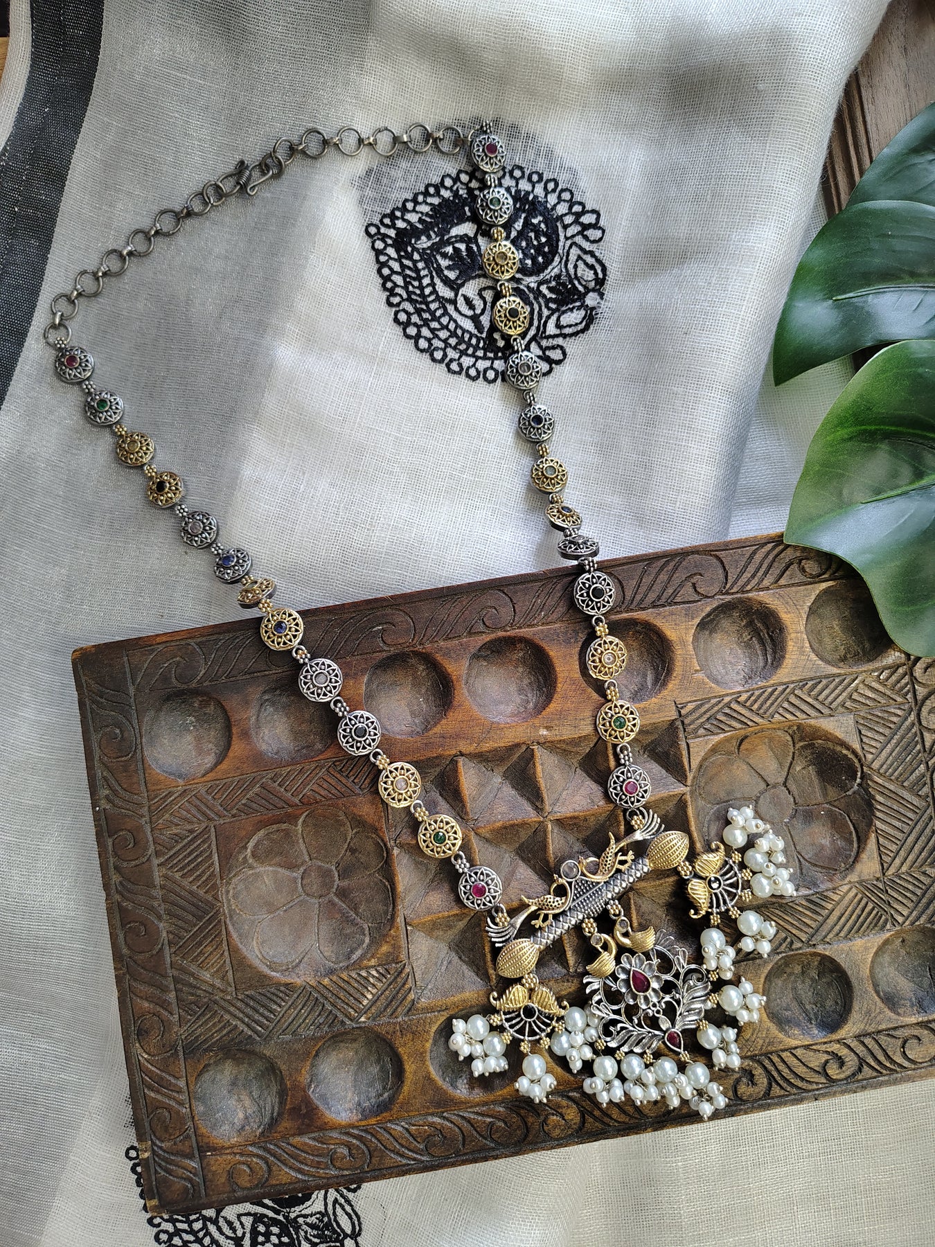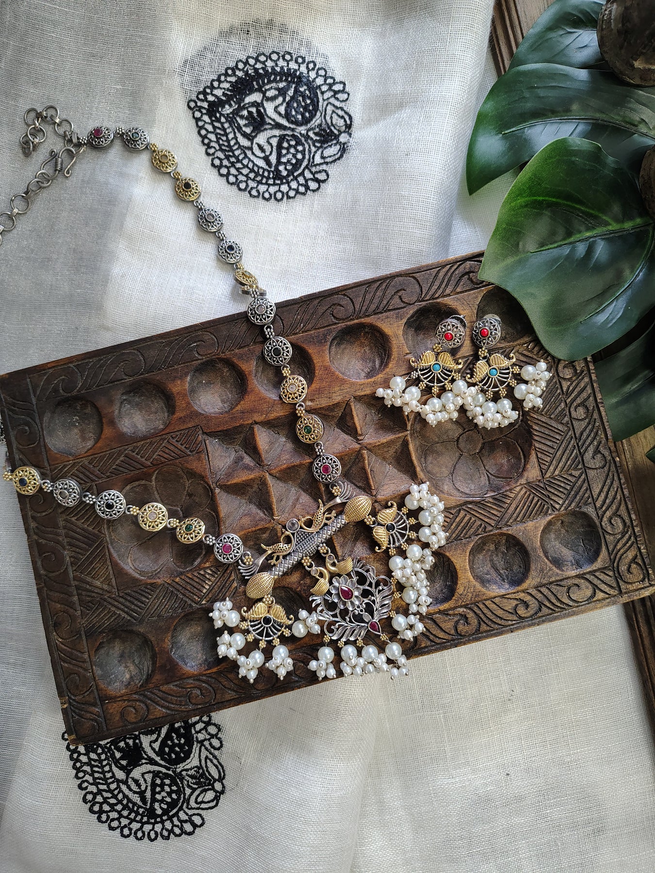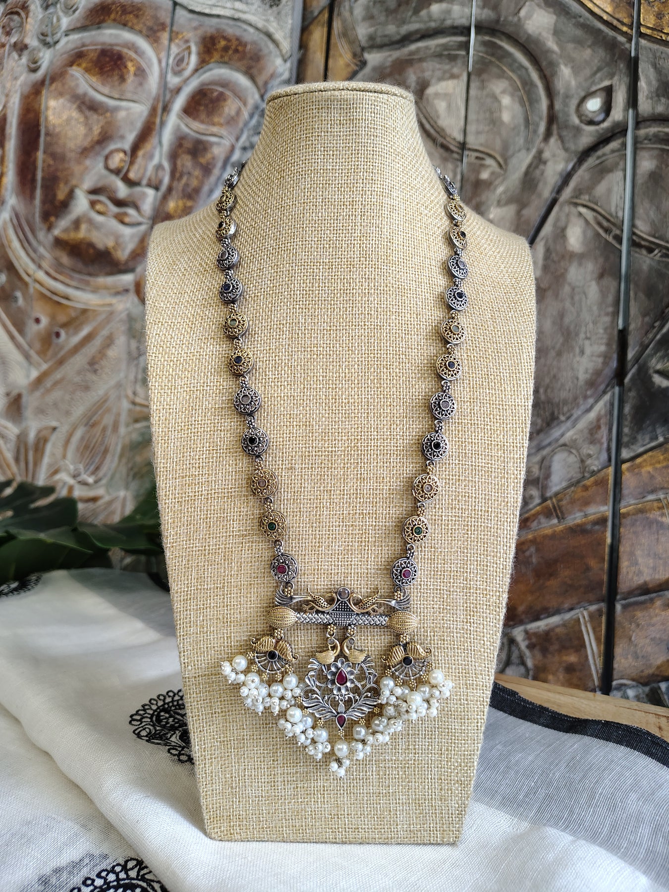 German Silver Statement Necklace ornated with Multicoloured Stones, paired with Earrings