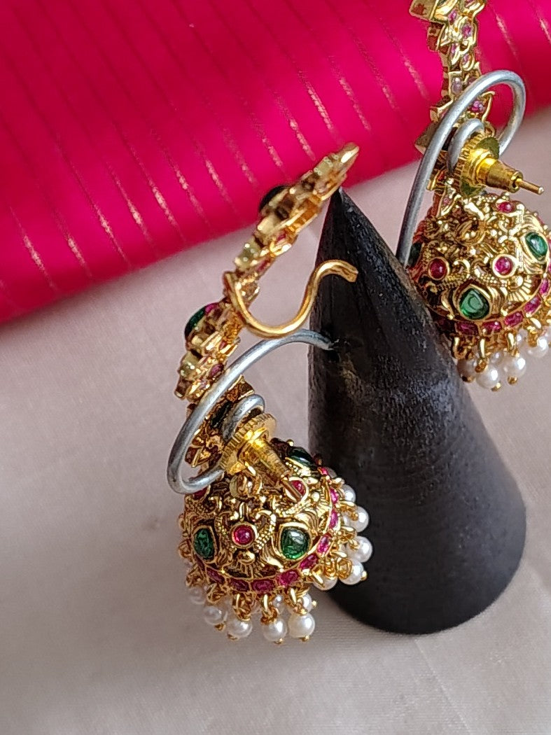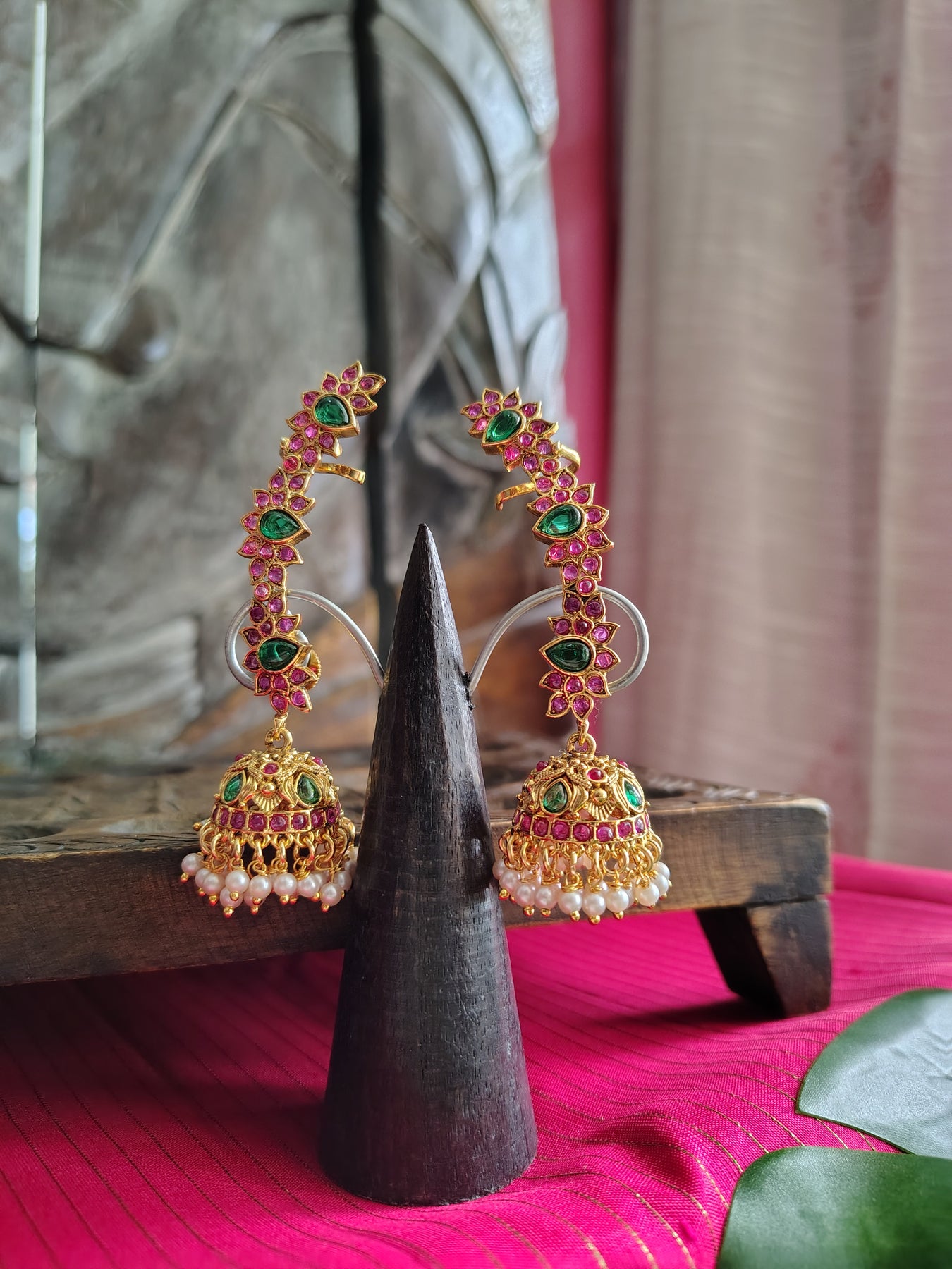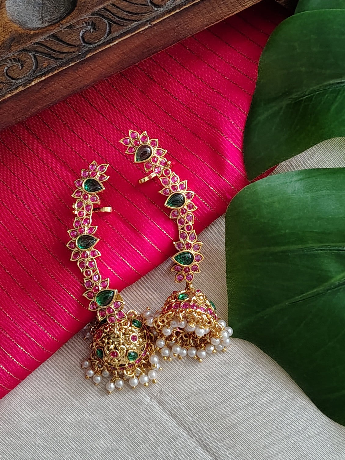 An elegant pair of Gold Kemp Jhumkas with Ear Cuffs