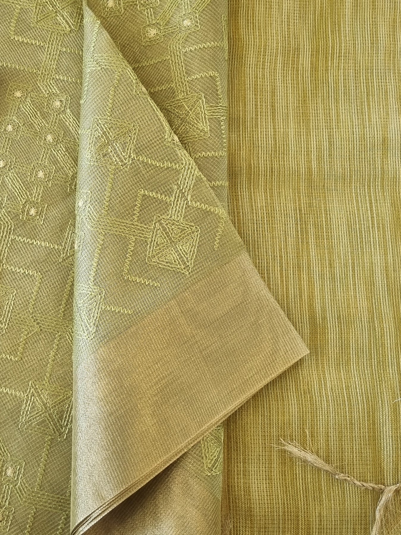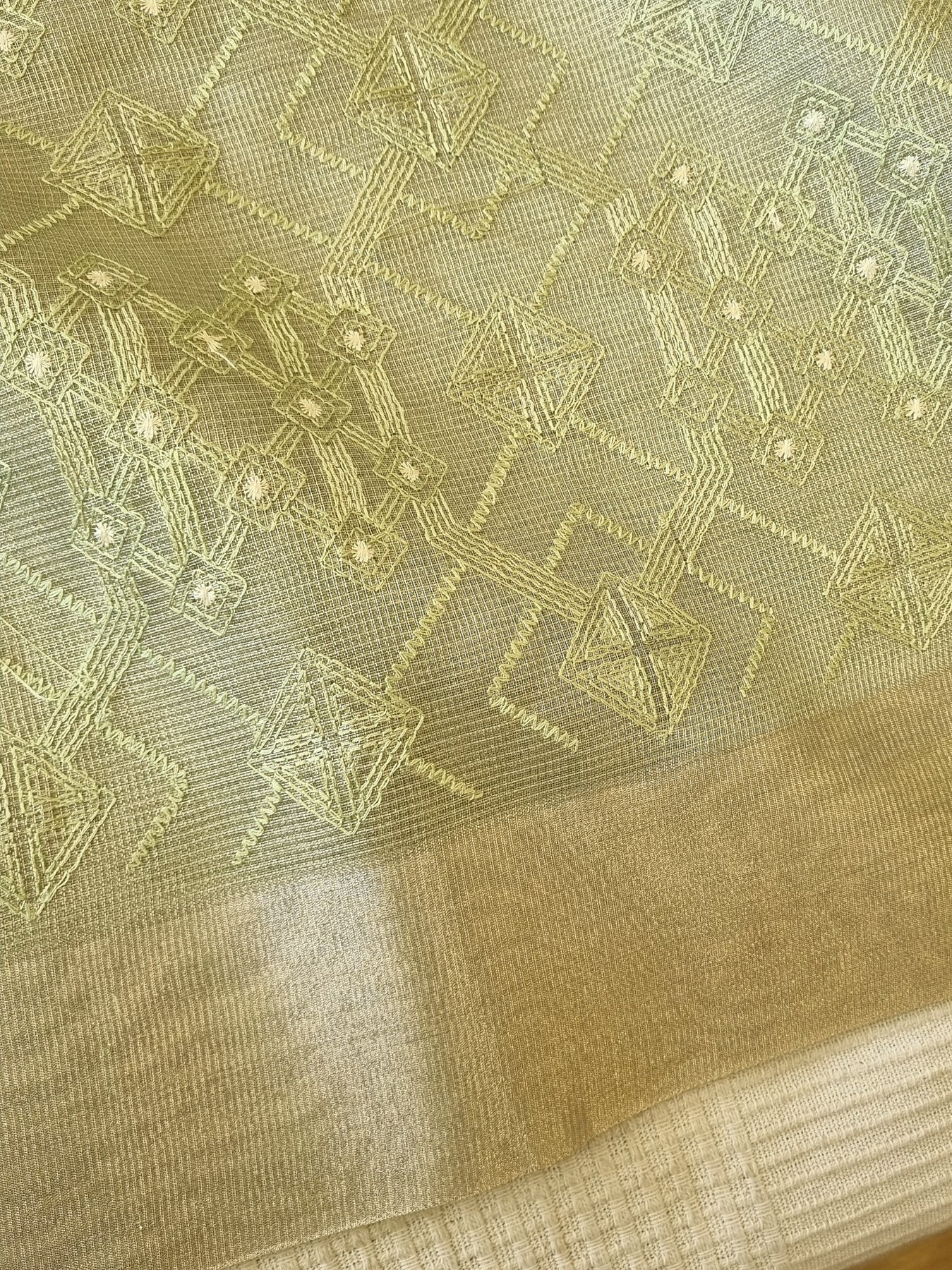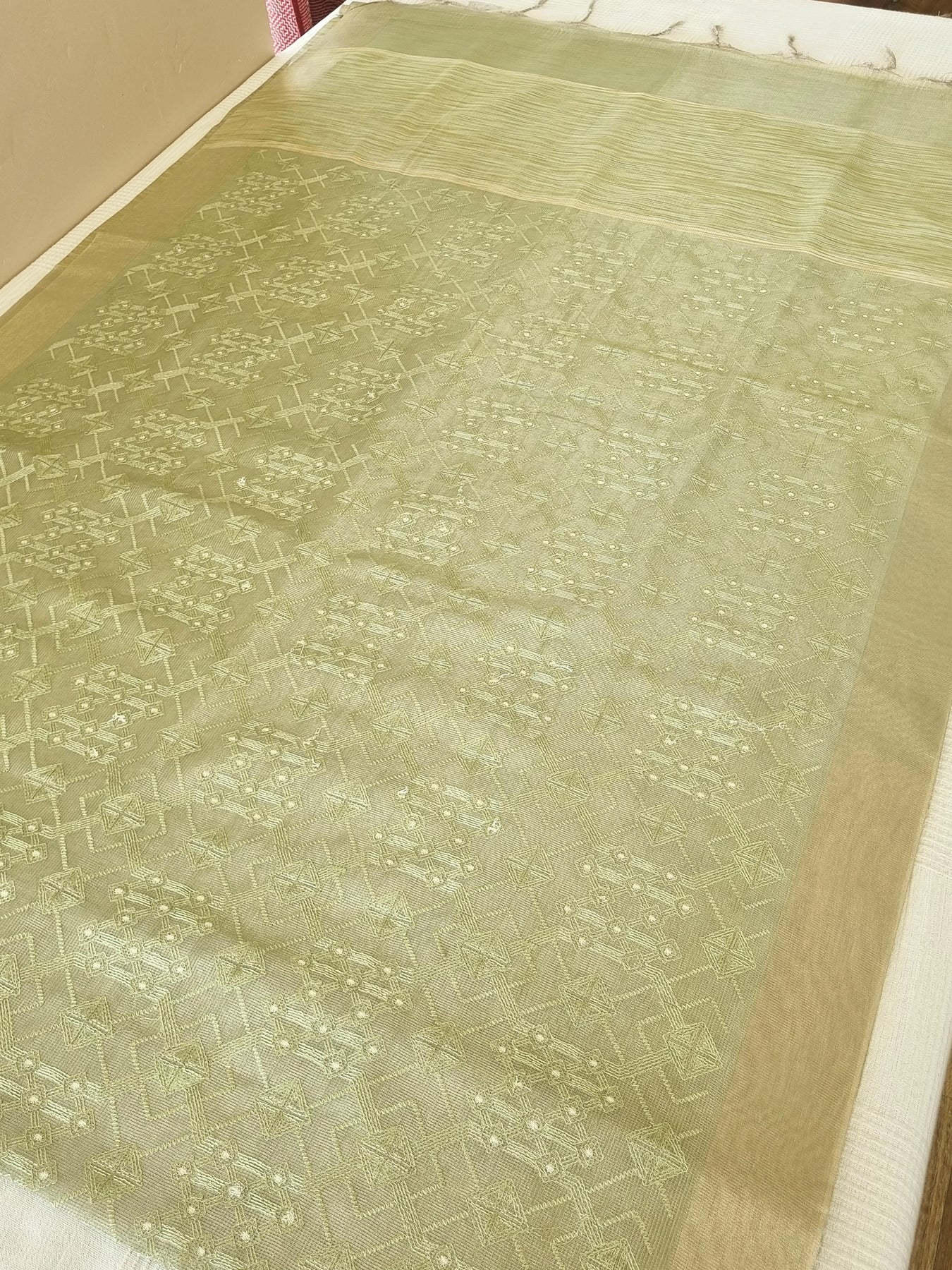 Tissue Saree in Light Green shade with Gold Borders and embroidery