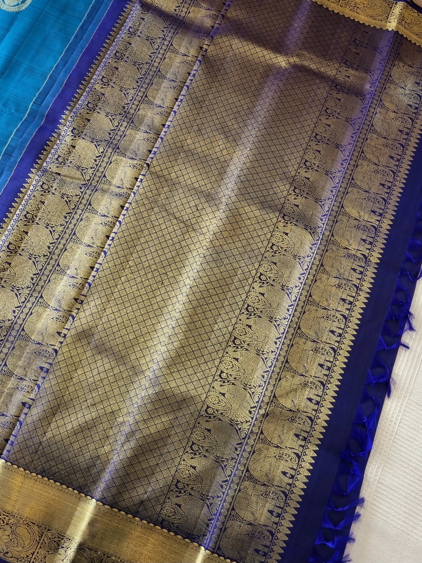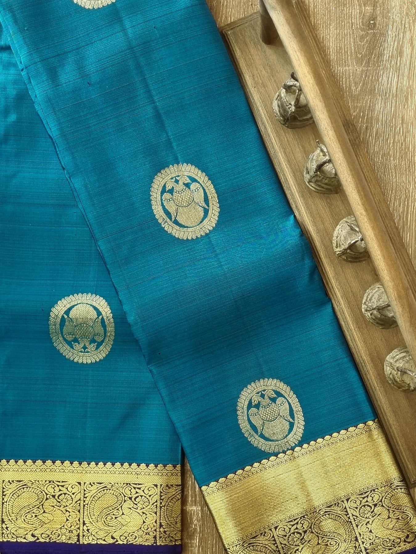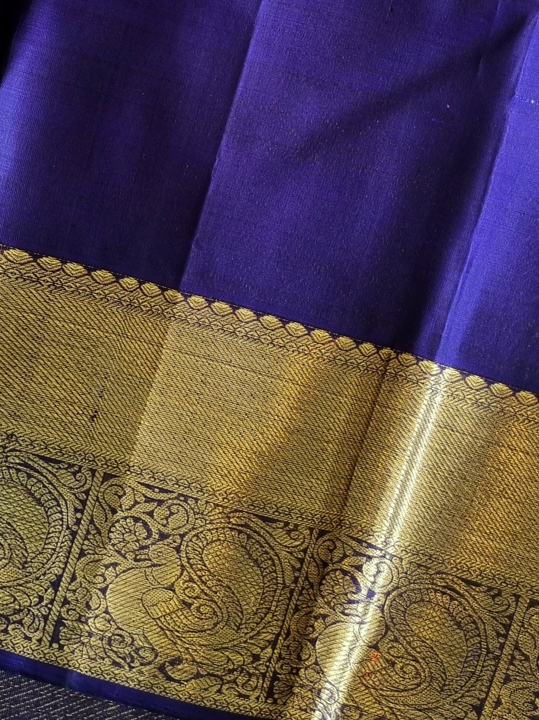 An elegant Kanjivaram Pure Silk Saree with Contrast borders and Gold Motifs on the Body and Pallu.