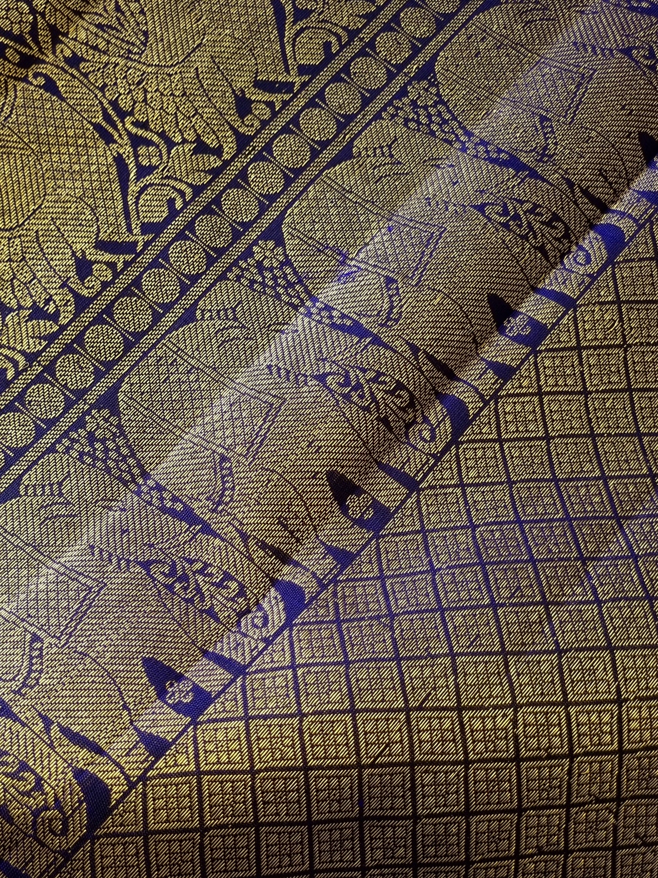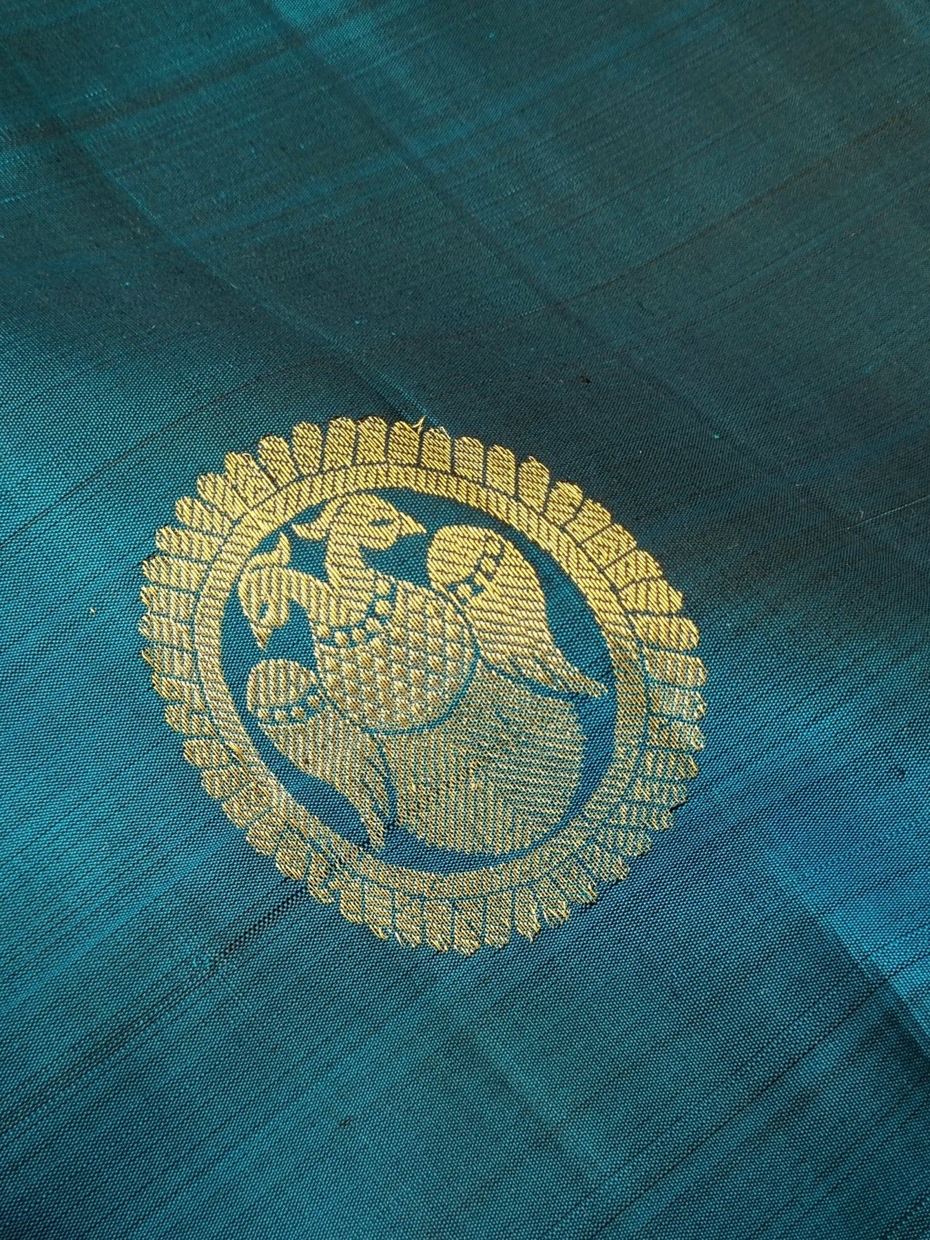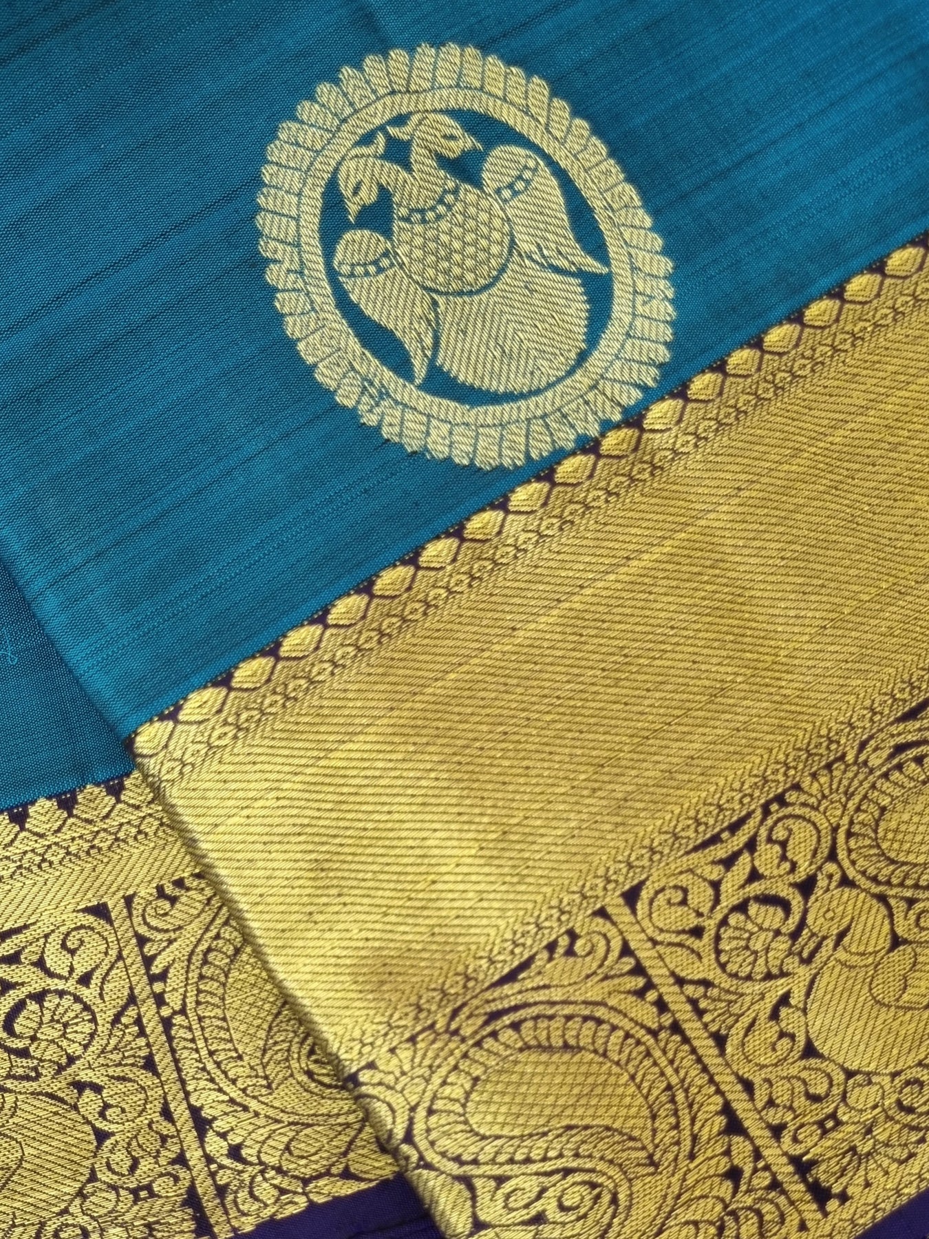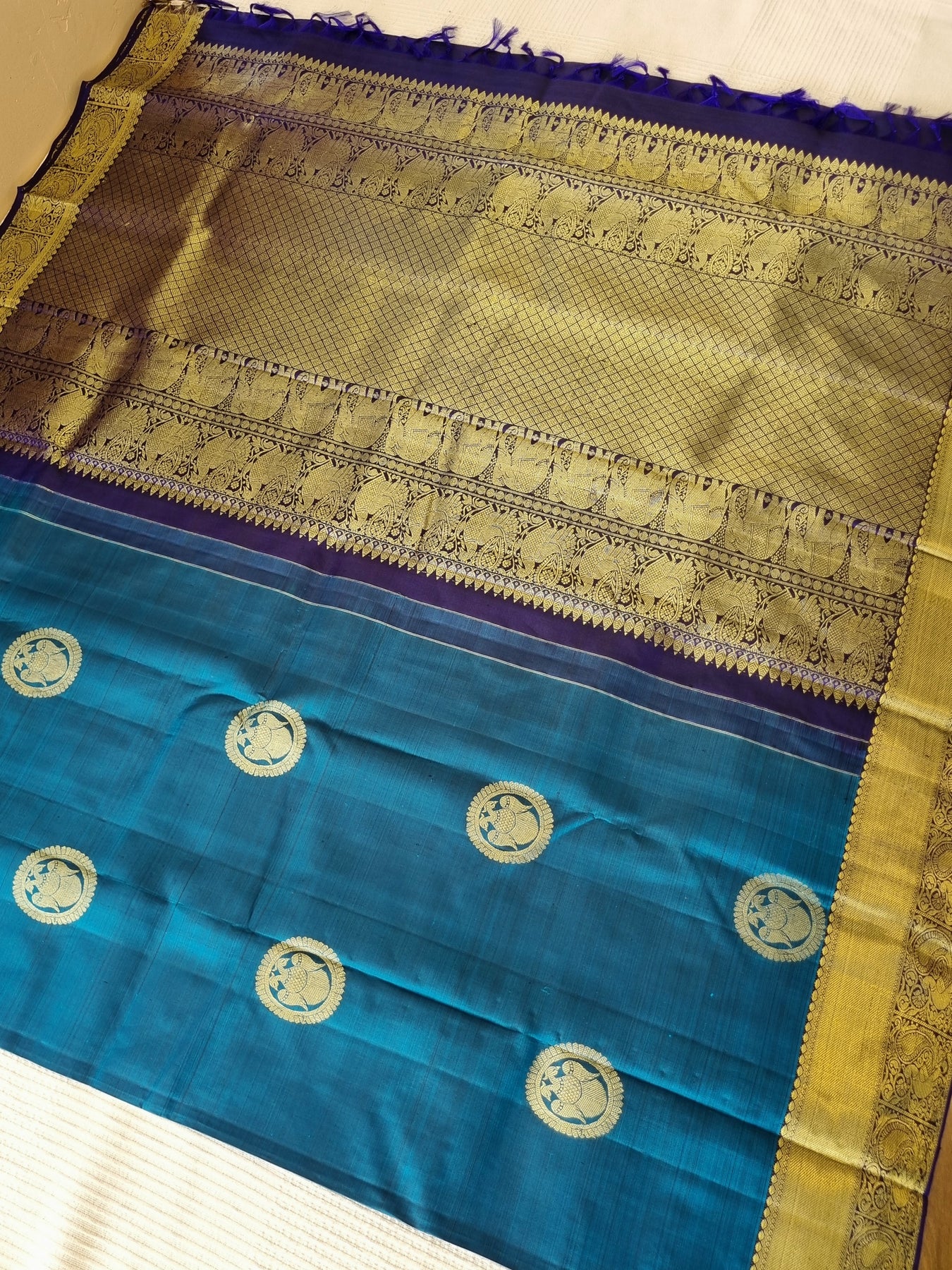 An elegant Kanjivaram Pure Silk Saree with Contrast borders and Gold Motifs on the Body and Pallu.
