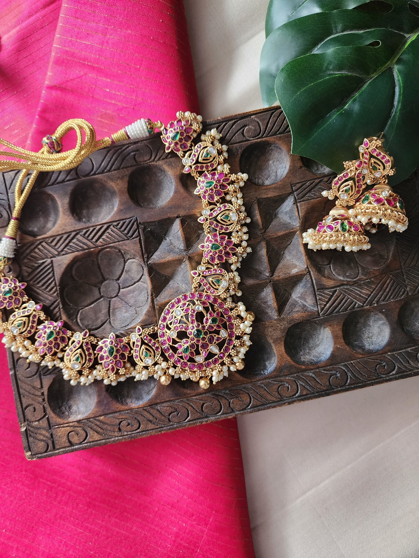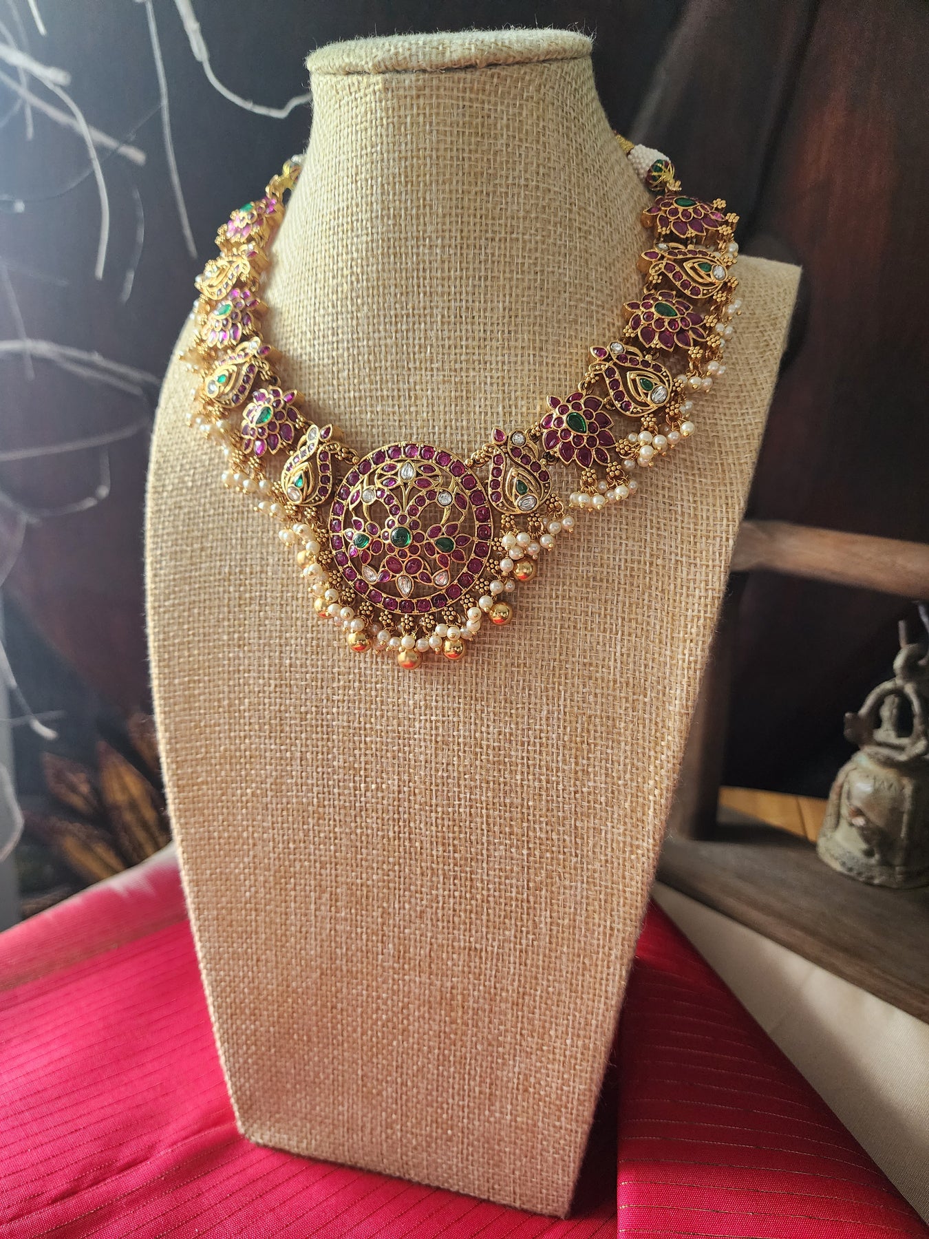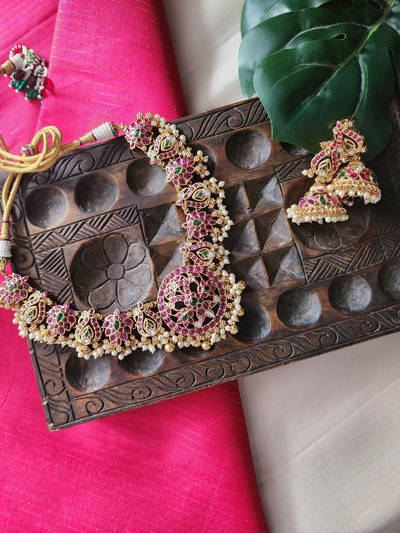 A beautiful necklace ornated with Premium Quality Real Kemp Stones, paired with Jhumkas