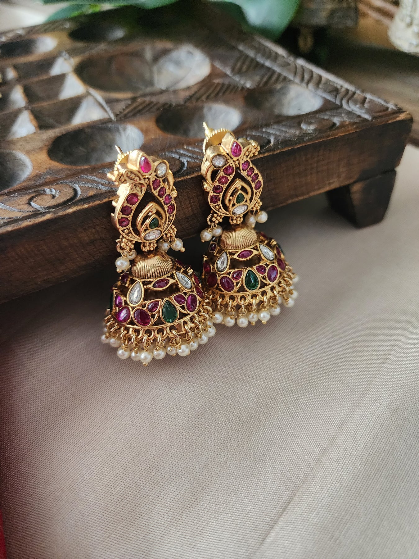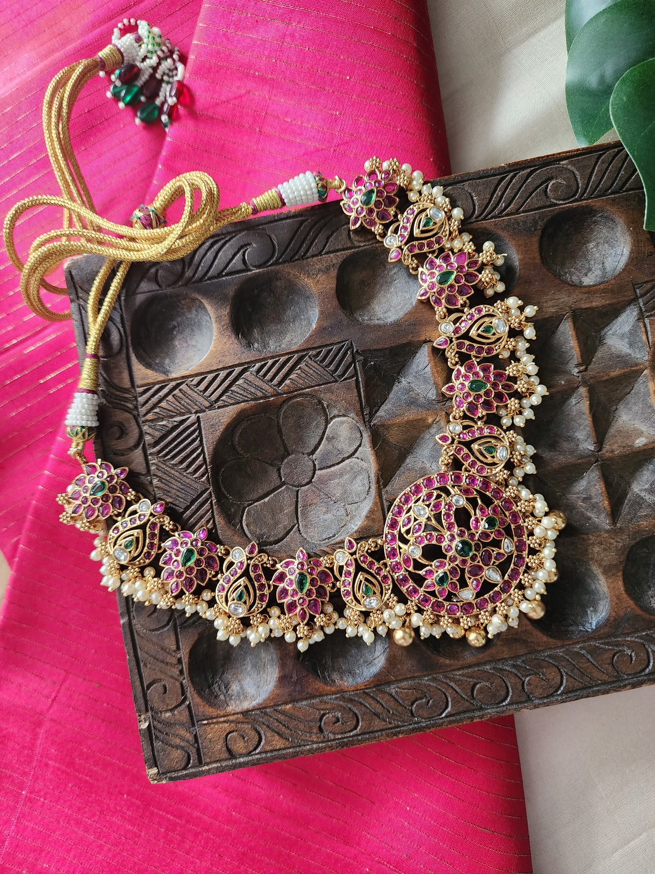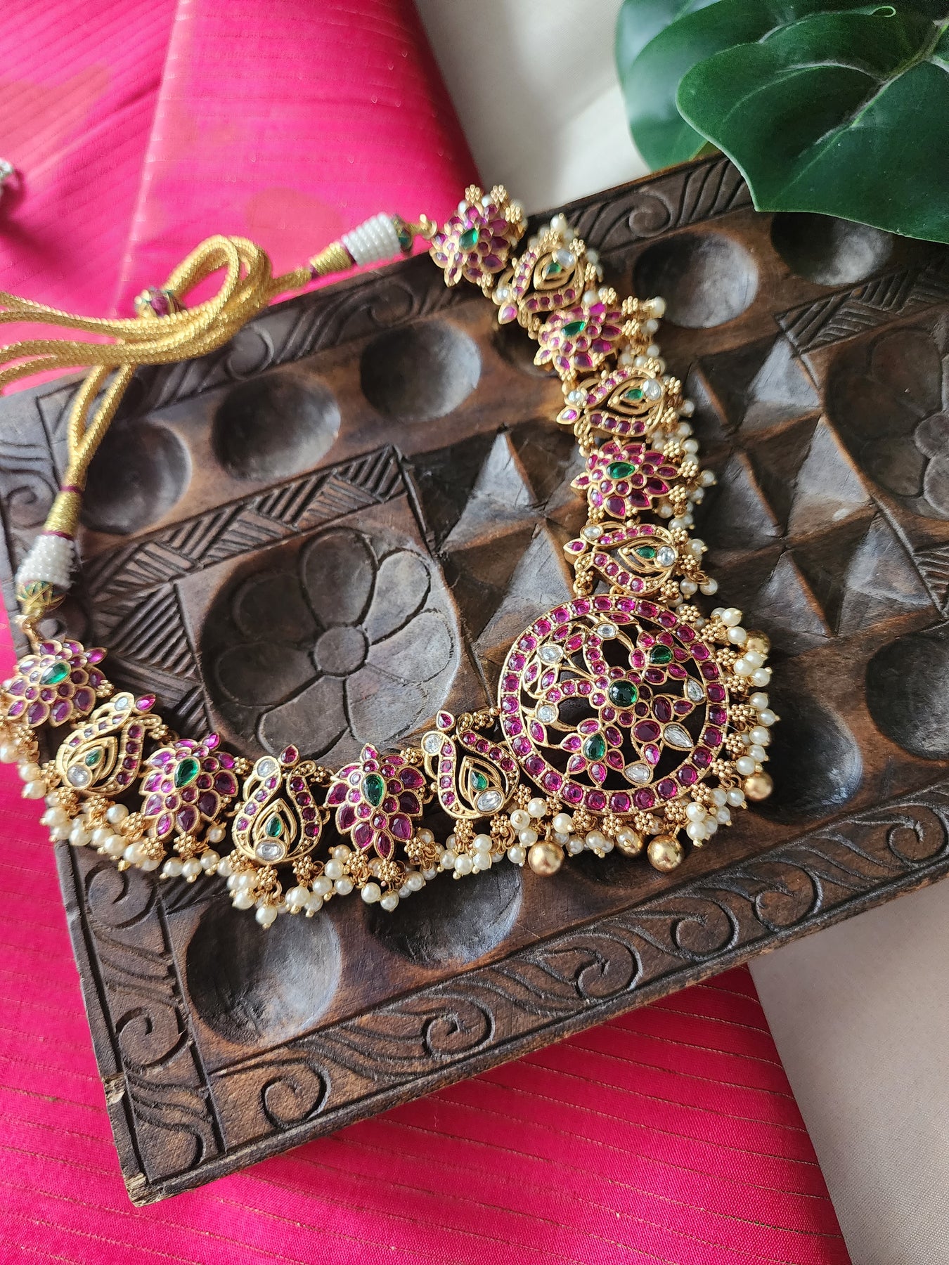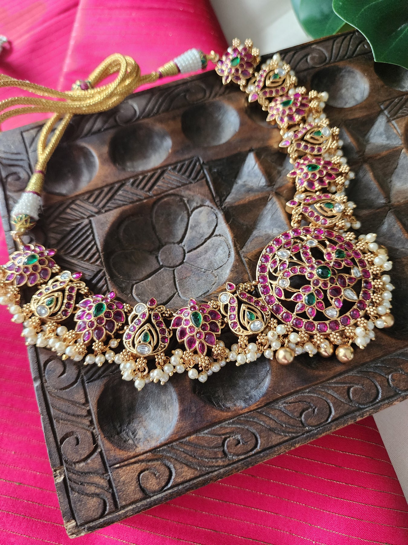 A beautiful necklace ornated with Premium Quality Real Kemp Stones, paired with Jhumkas