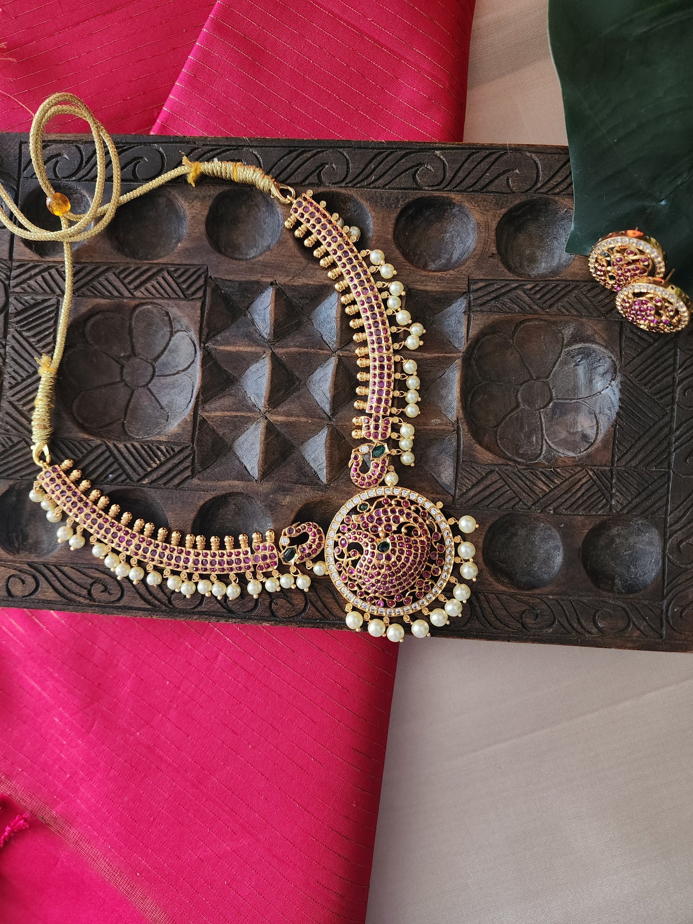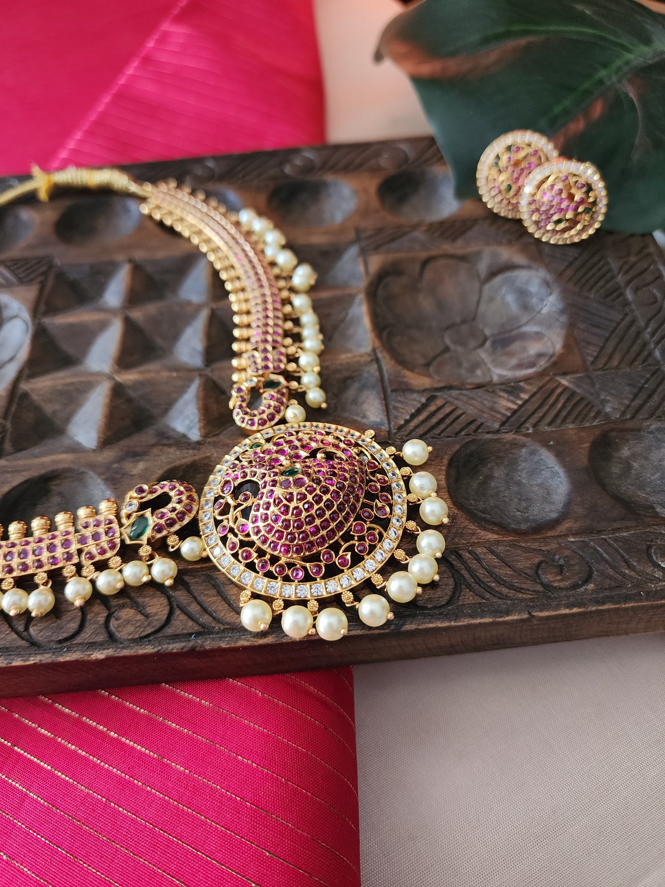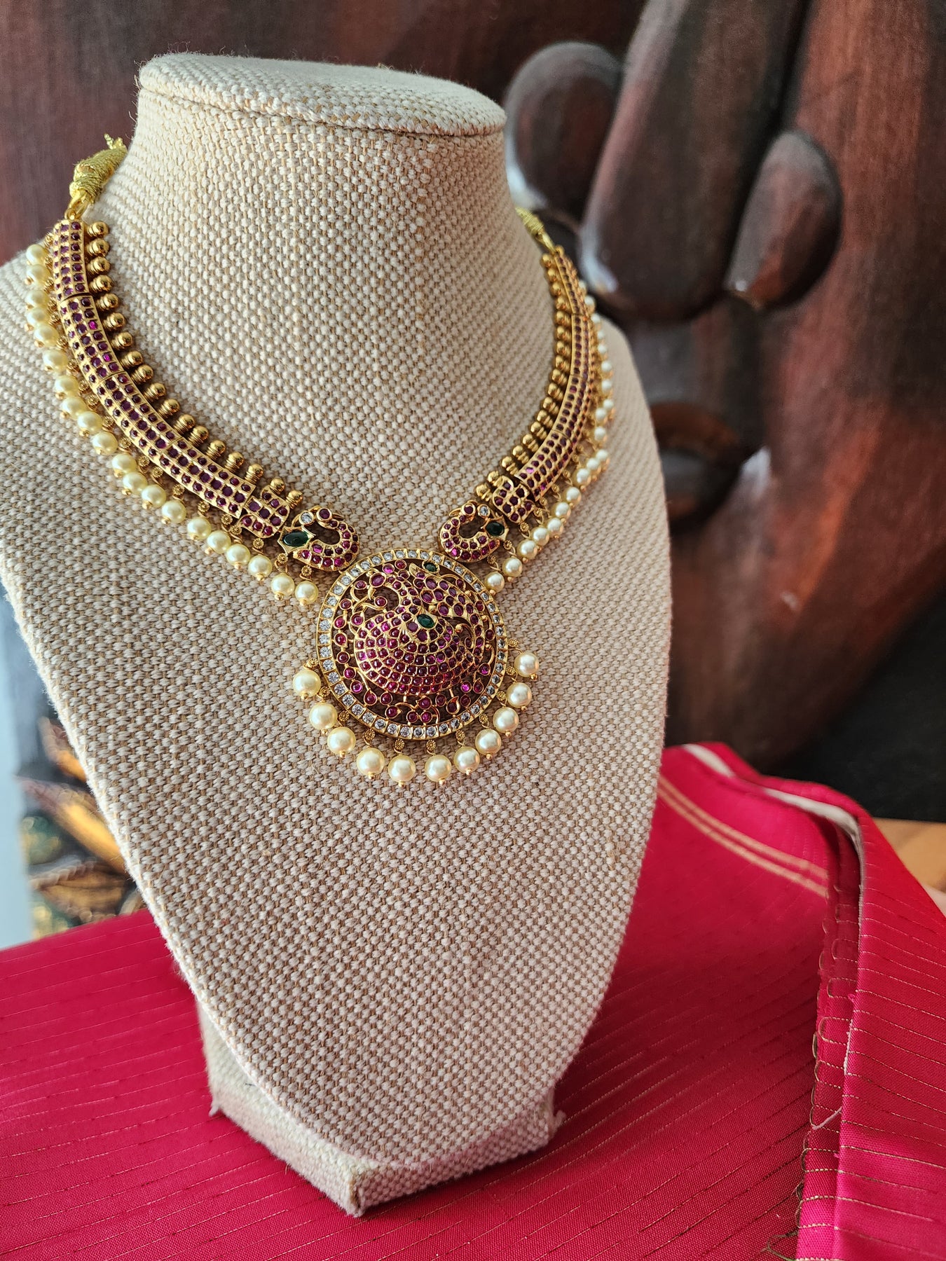 A beautiful necklace ornated with Premium Quality Kemp Stones and beautifully finished with Pearls, paired with Studs