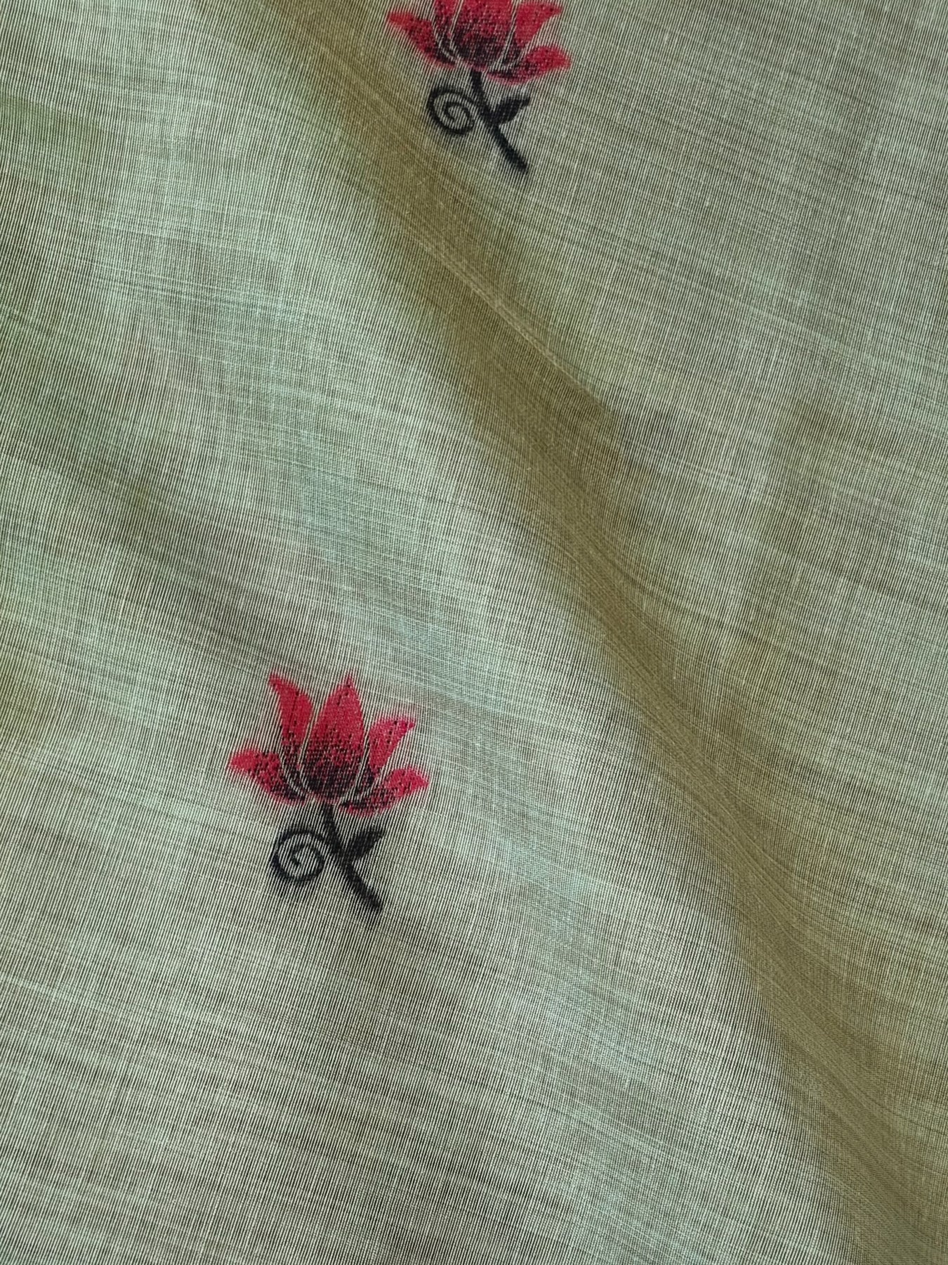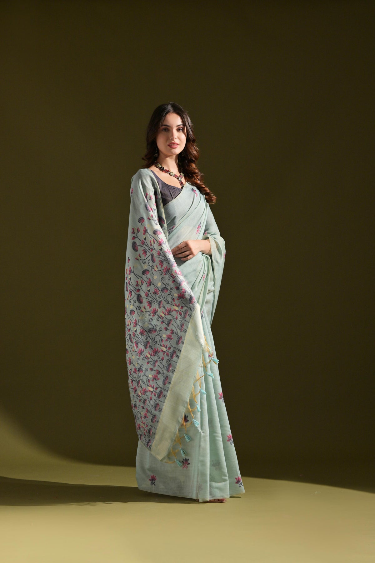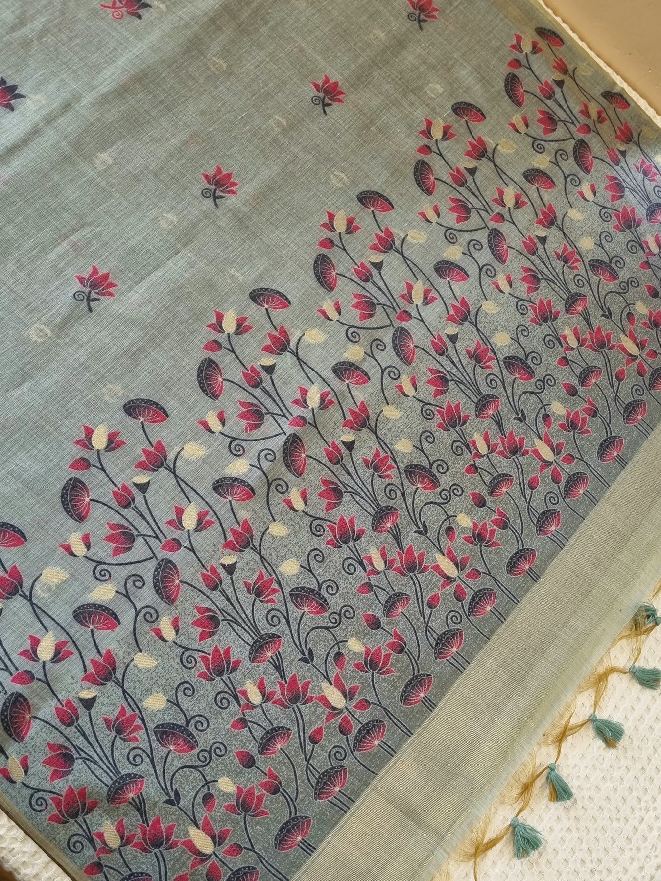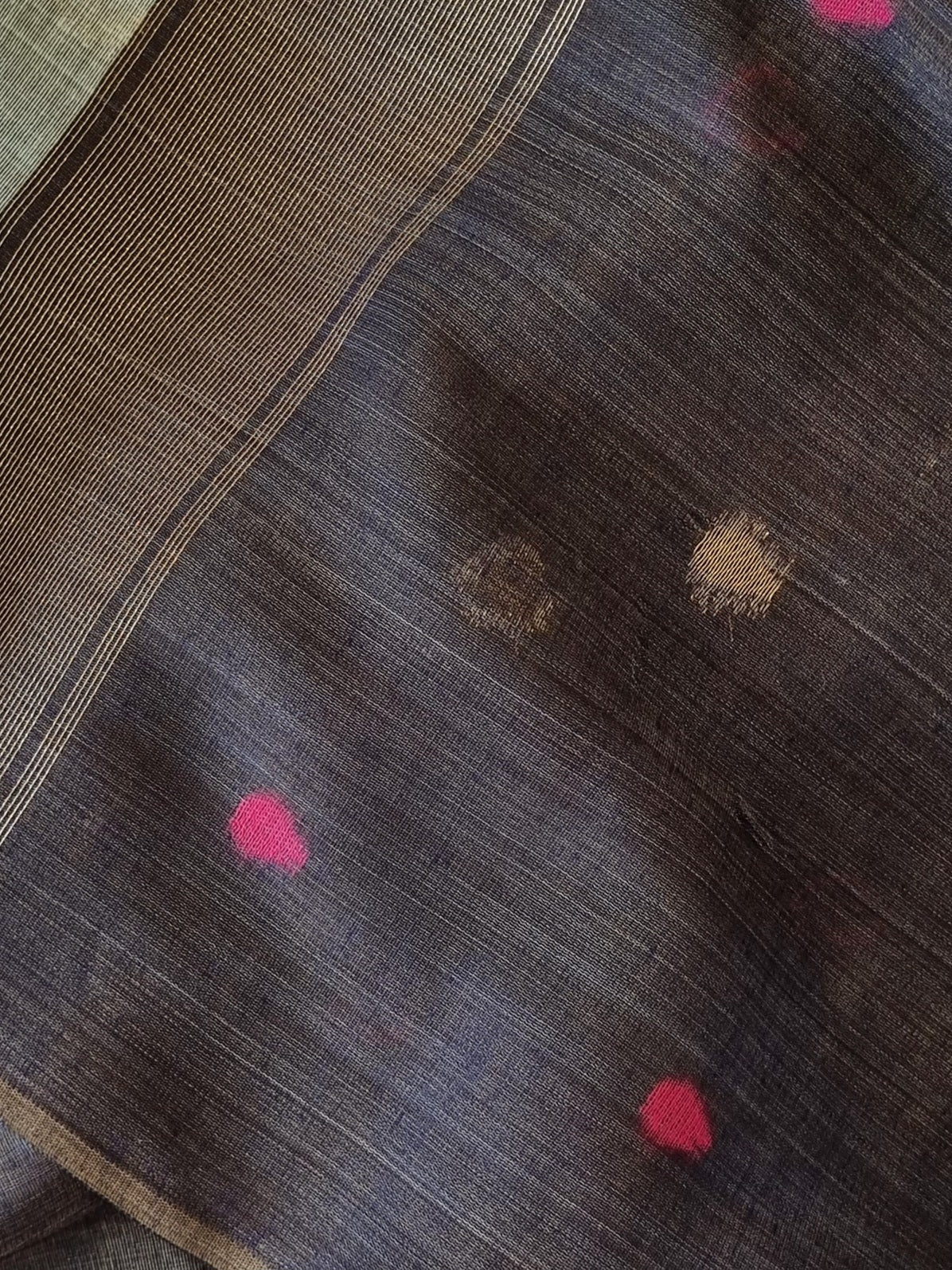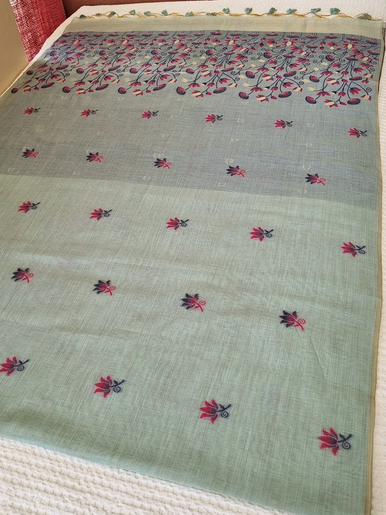 Linen Cotton Saree, with woven designs on the body and pallu, beautifully finished with tassels