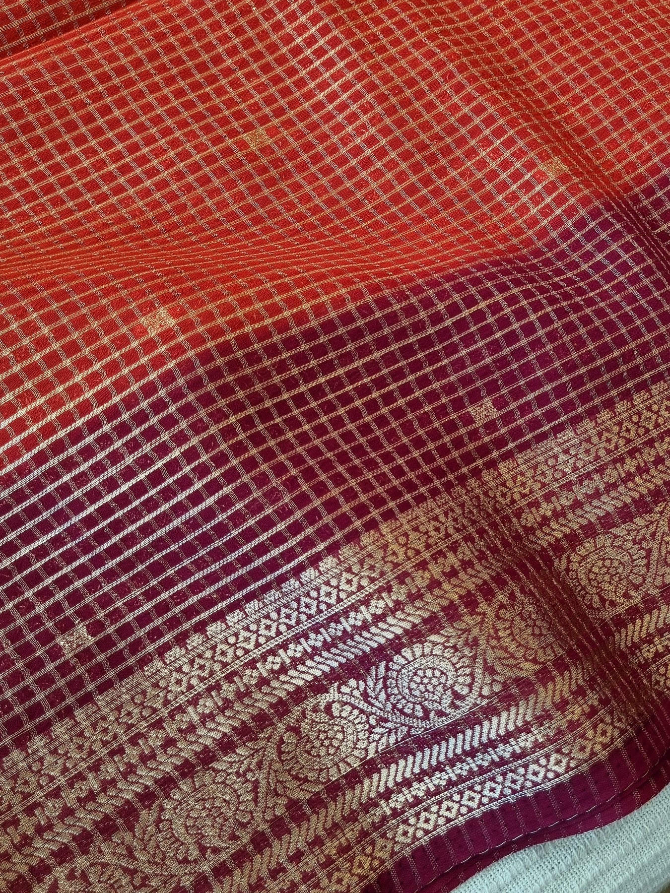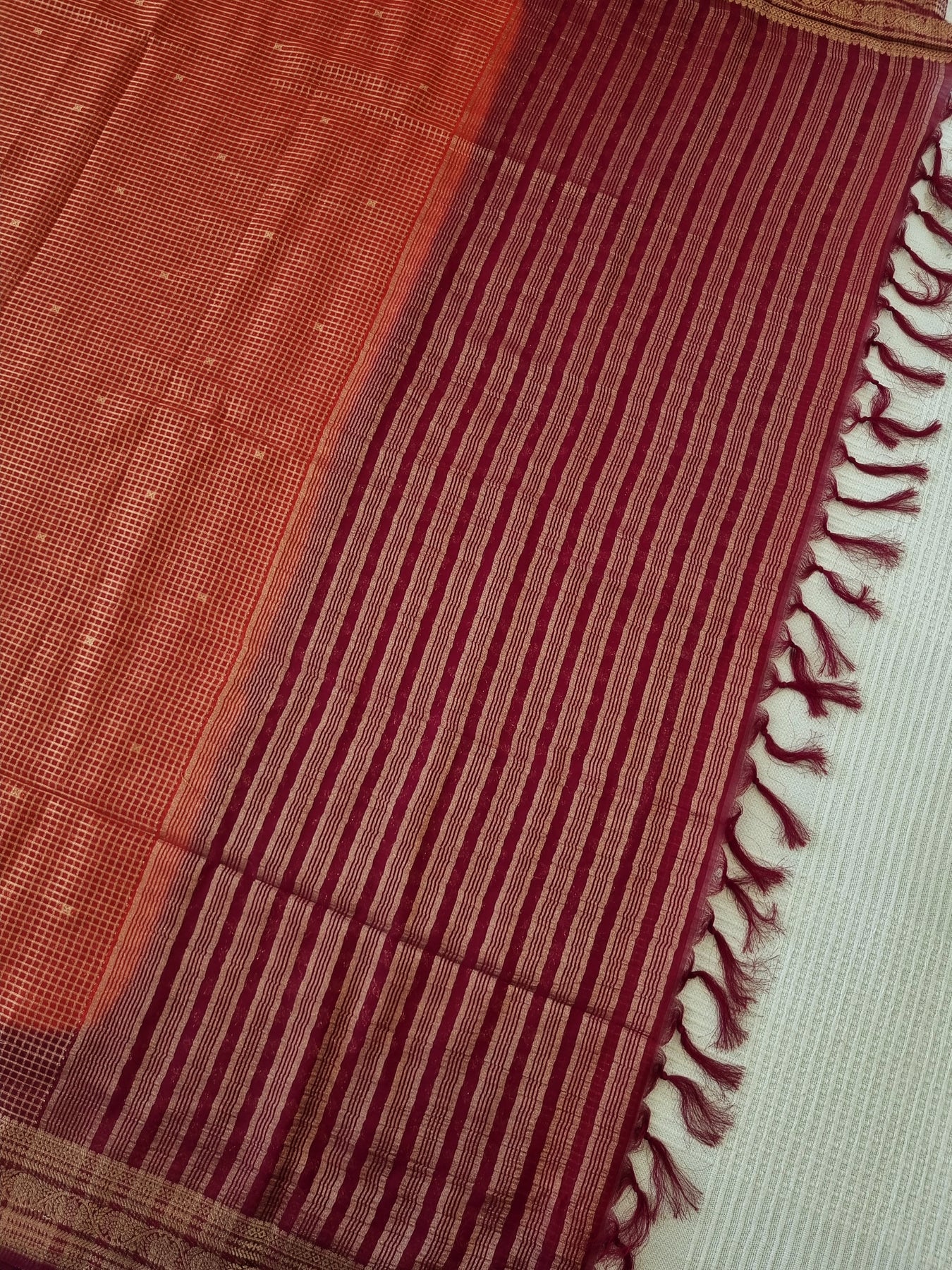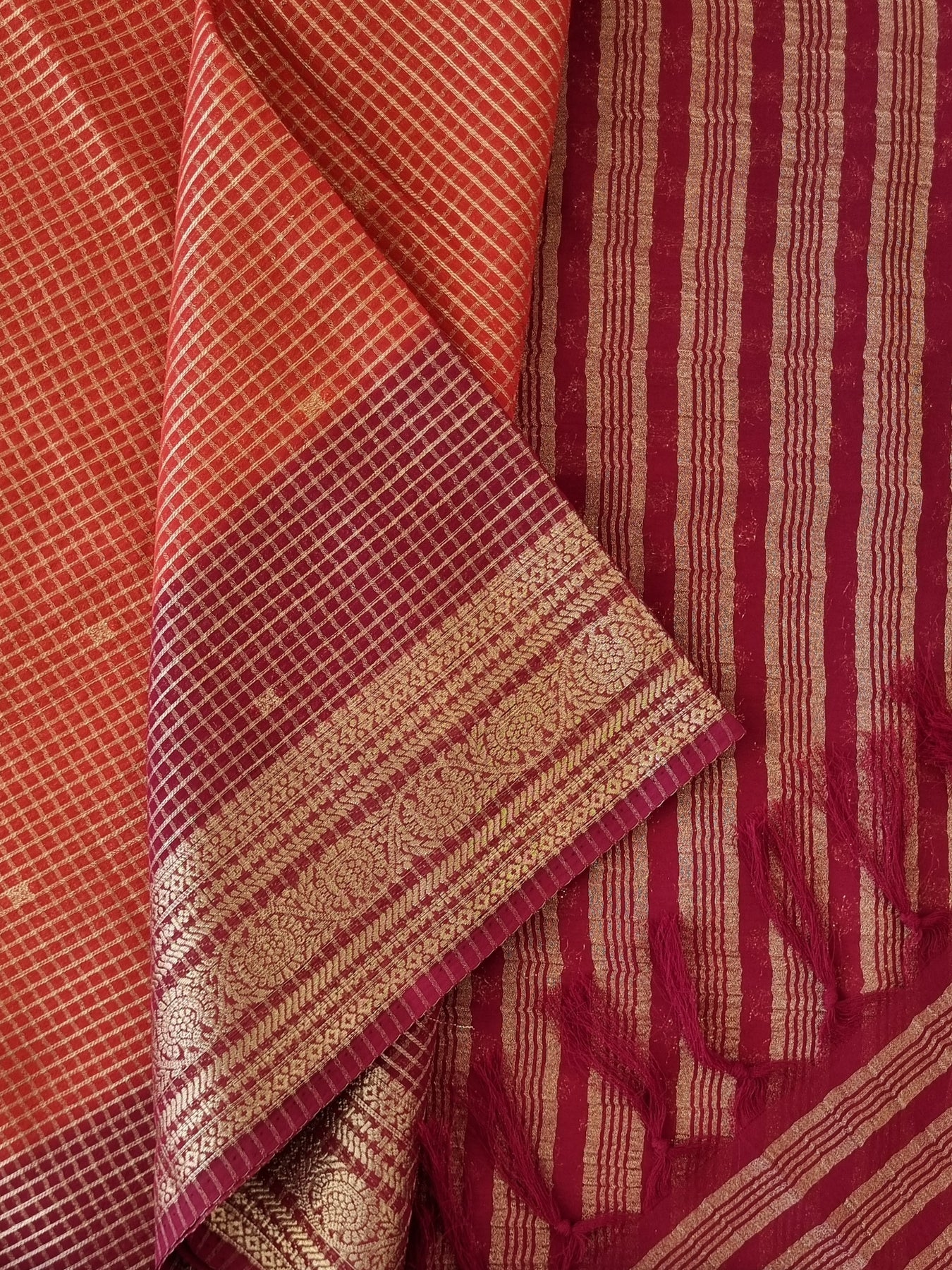 The elegant checked pattern and Striped pallu elevate the style quotient