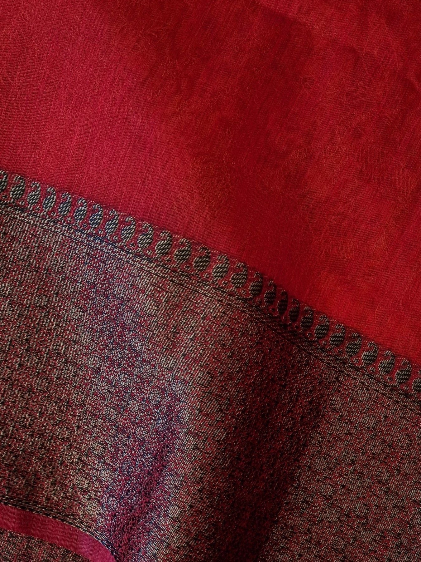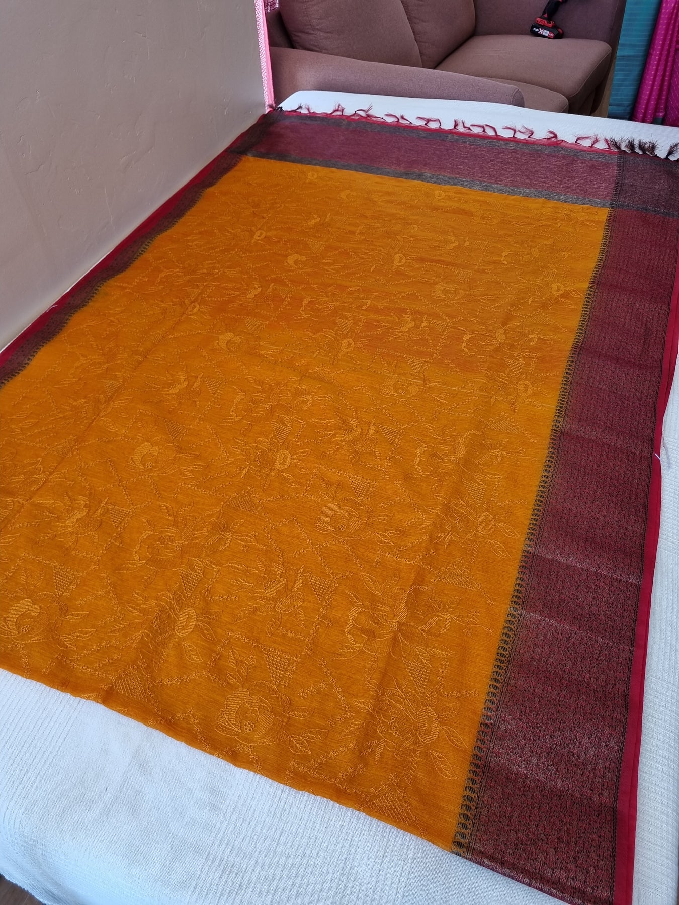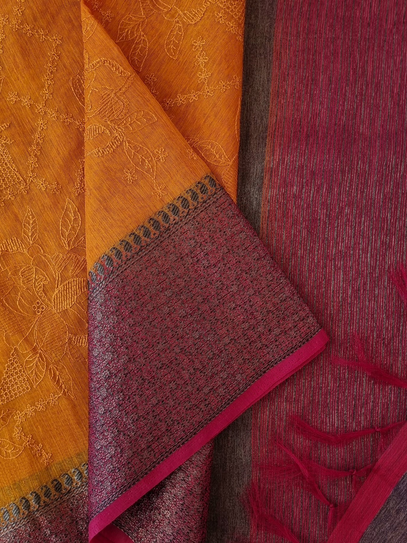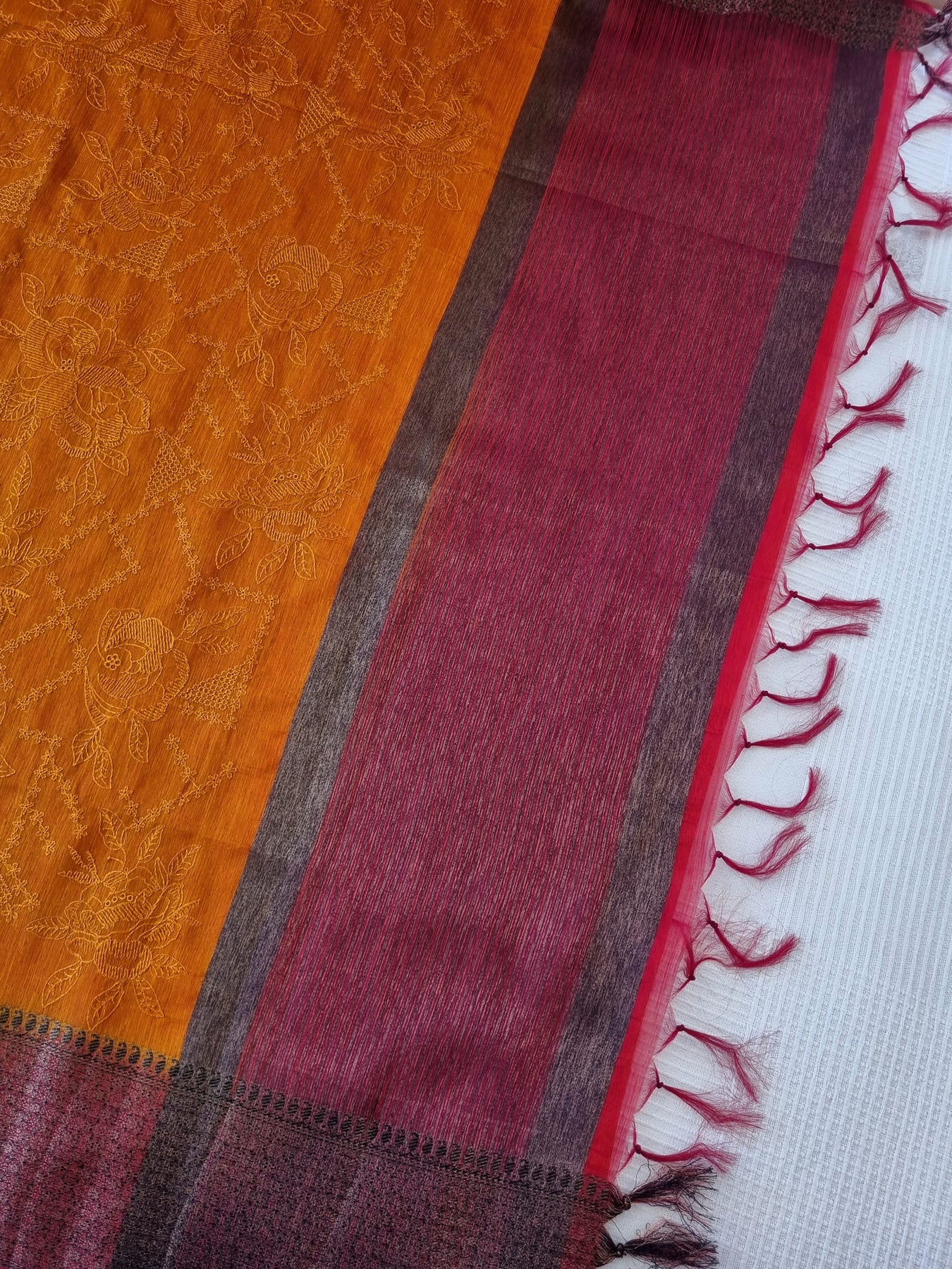 An elegant Semi Raw Silk Saree with floral embroidery designs on the body