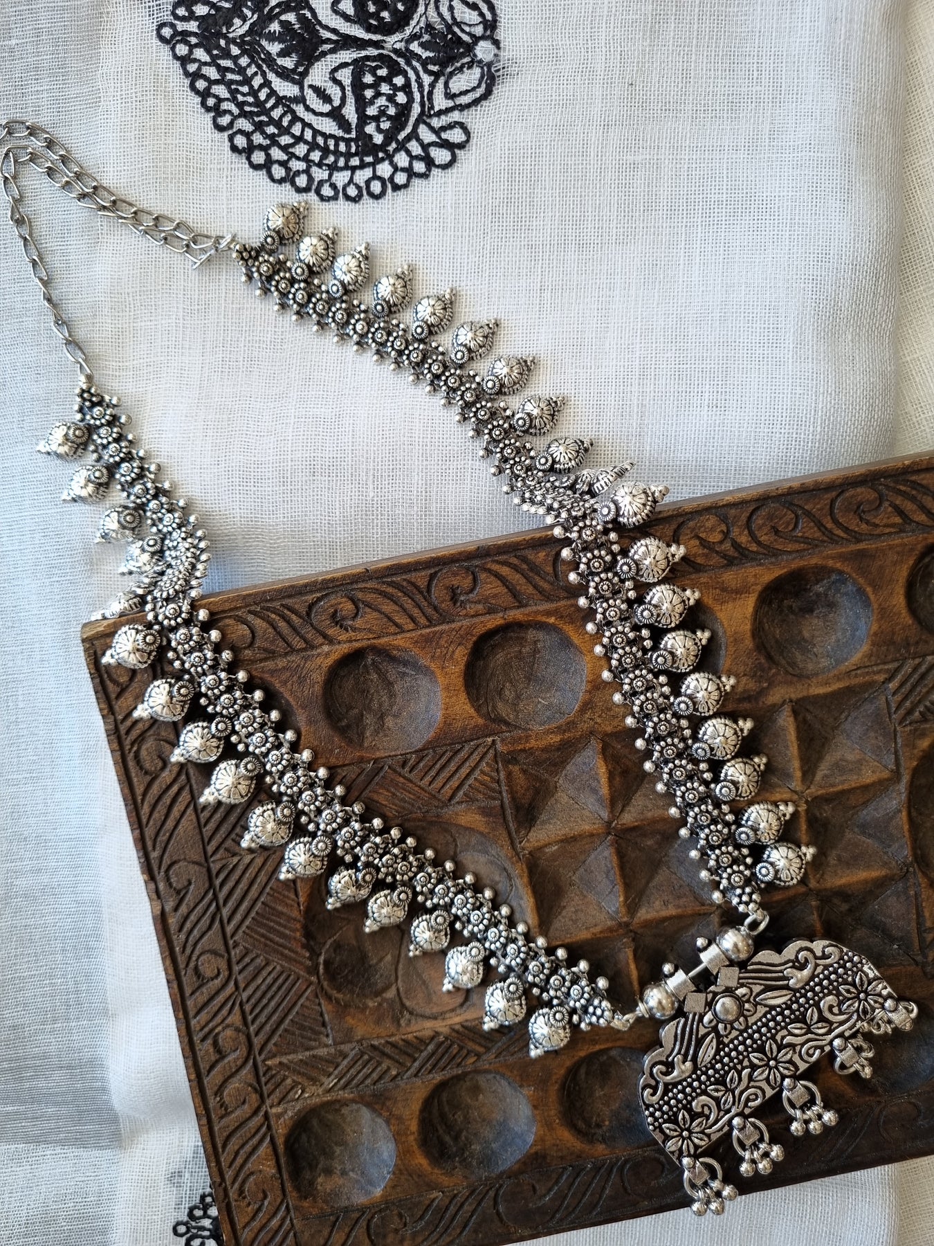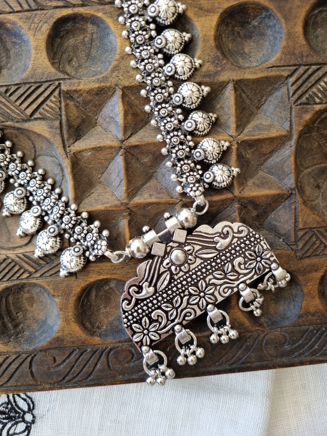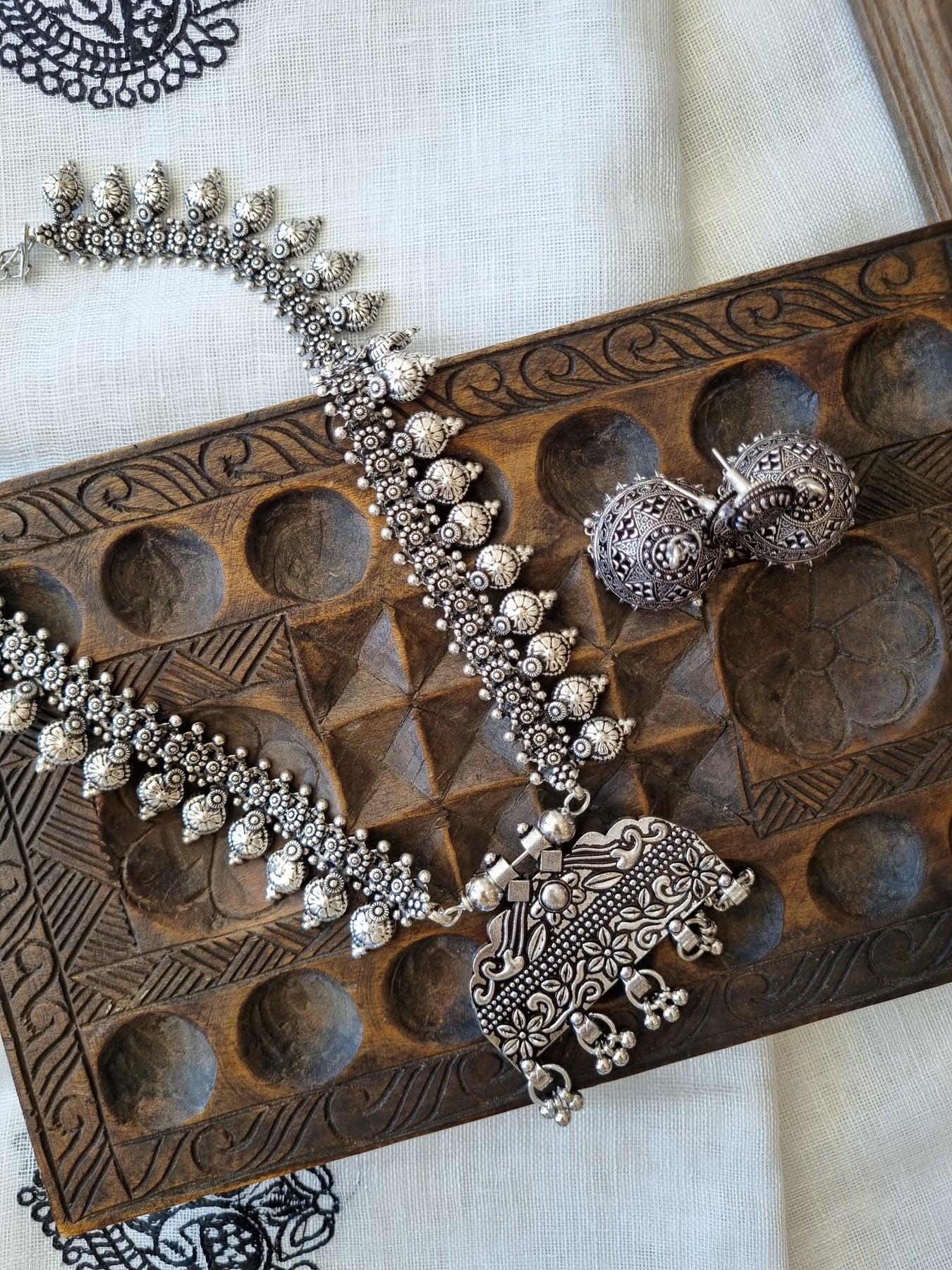 [{"id":46748312535272,"title":"Default Title","option1":"Default Title","option2":null,"option3":null,"sku":null,"requires_shipping":true,"taxable":true,"featured_image":null,"available":false,"name":"Oxidised Necklace \u0026 Jhumkas","public_title":null,"options":["Default Title"],"price":7500,"weight":300,"compare_at_price":null,"inventory_quantity":0,"inventory_management":"shopify","inventory_policy":"deny","barcode":null,"requires_selling_plan":false,"selling_plan_allocations":[]}]