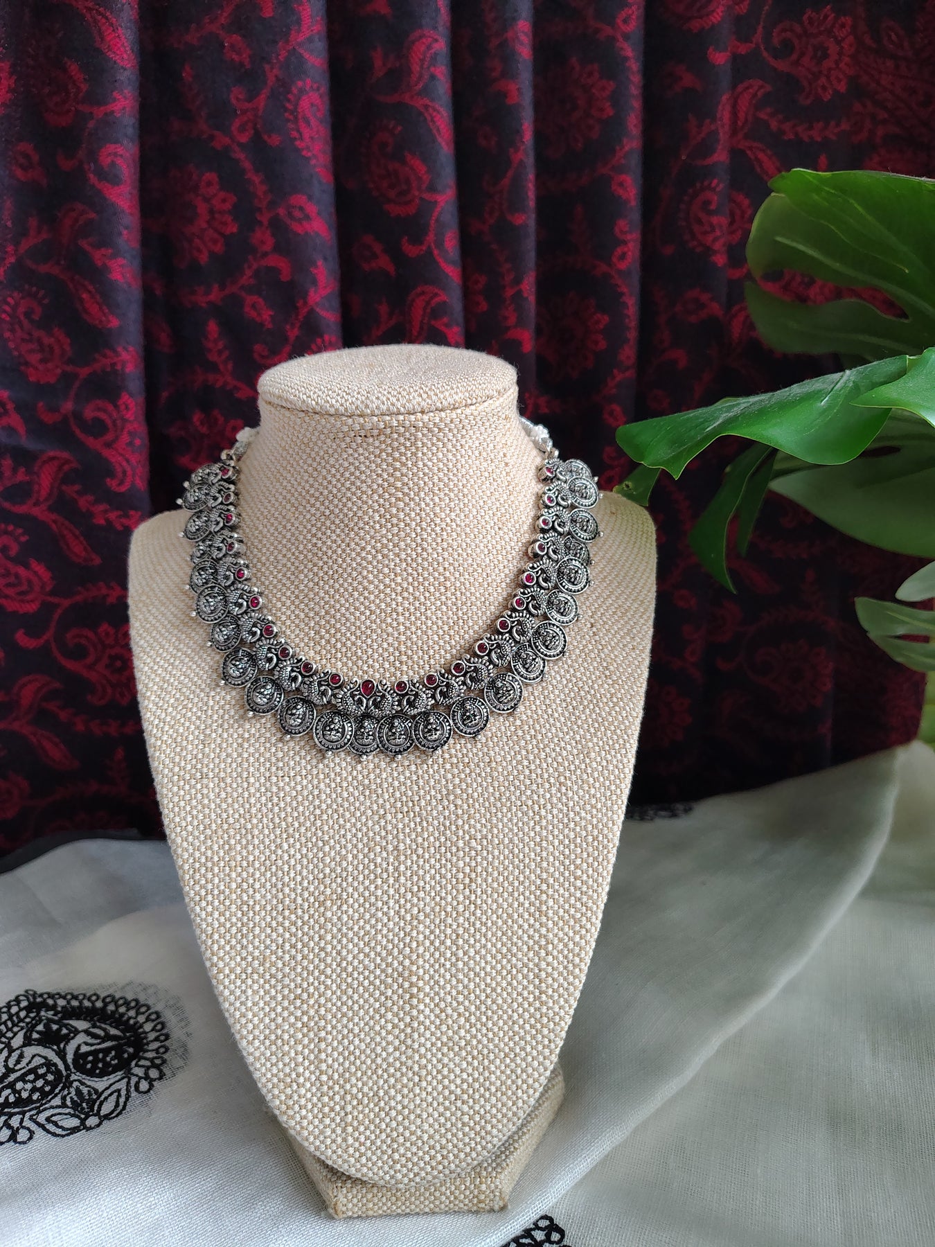 Oxidised Silver Lakshmi Stone Necklace with Red stones and pearls paired with matching Earrings