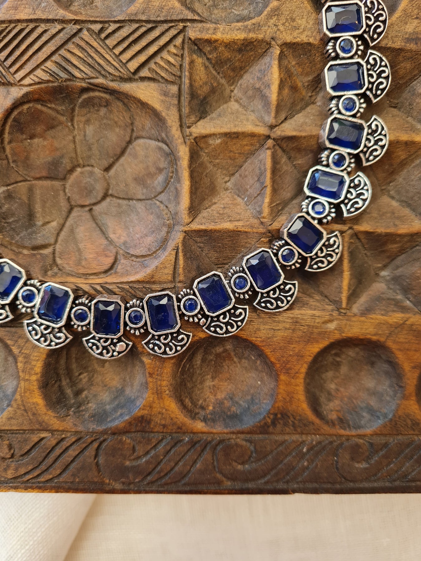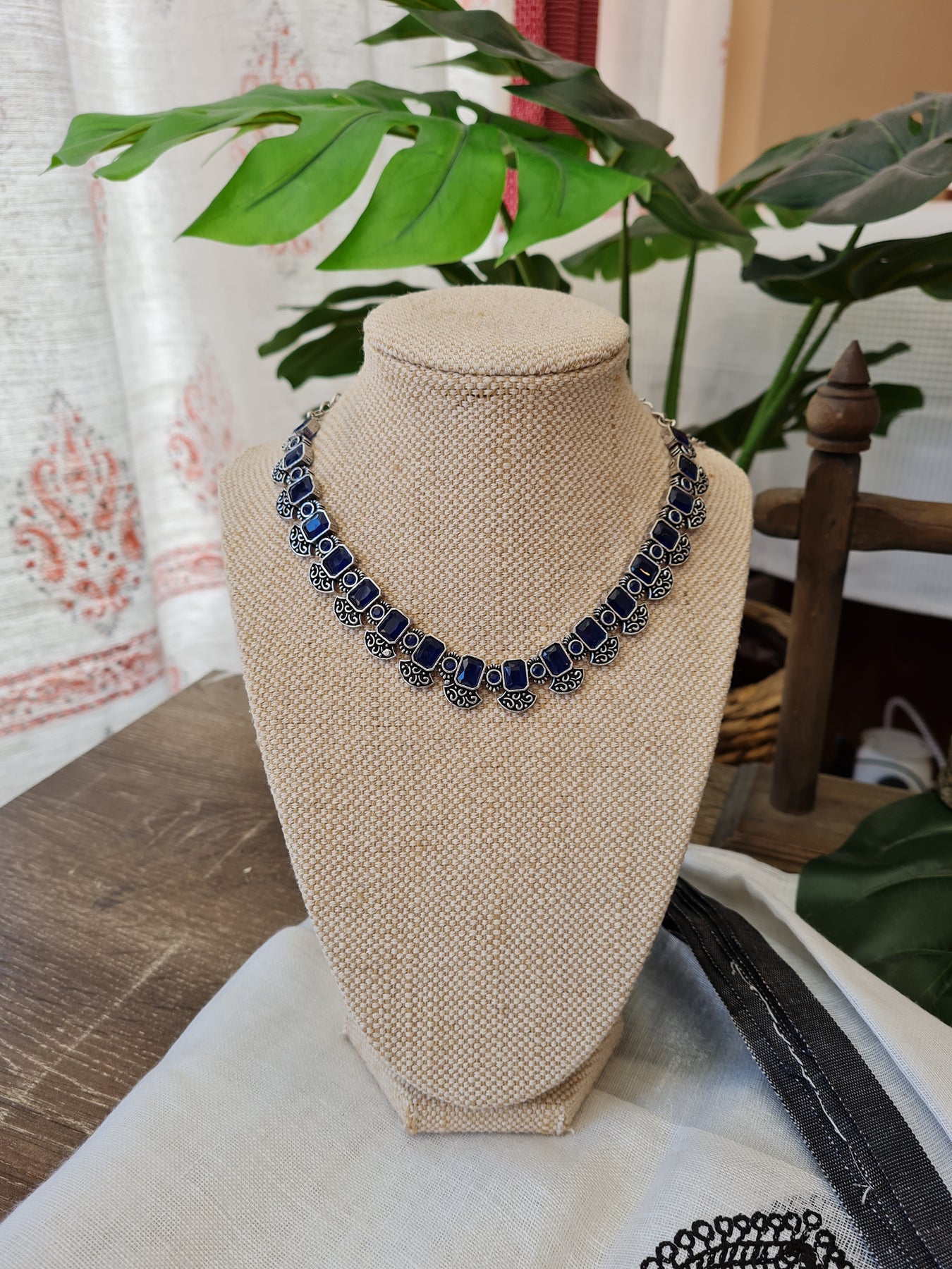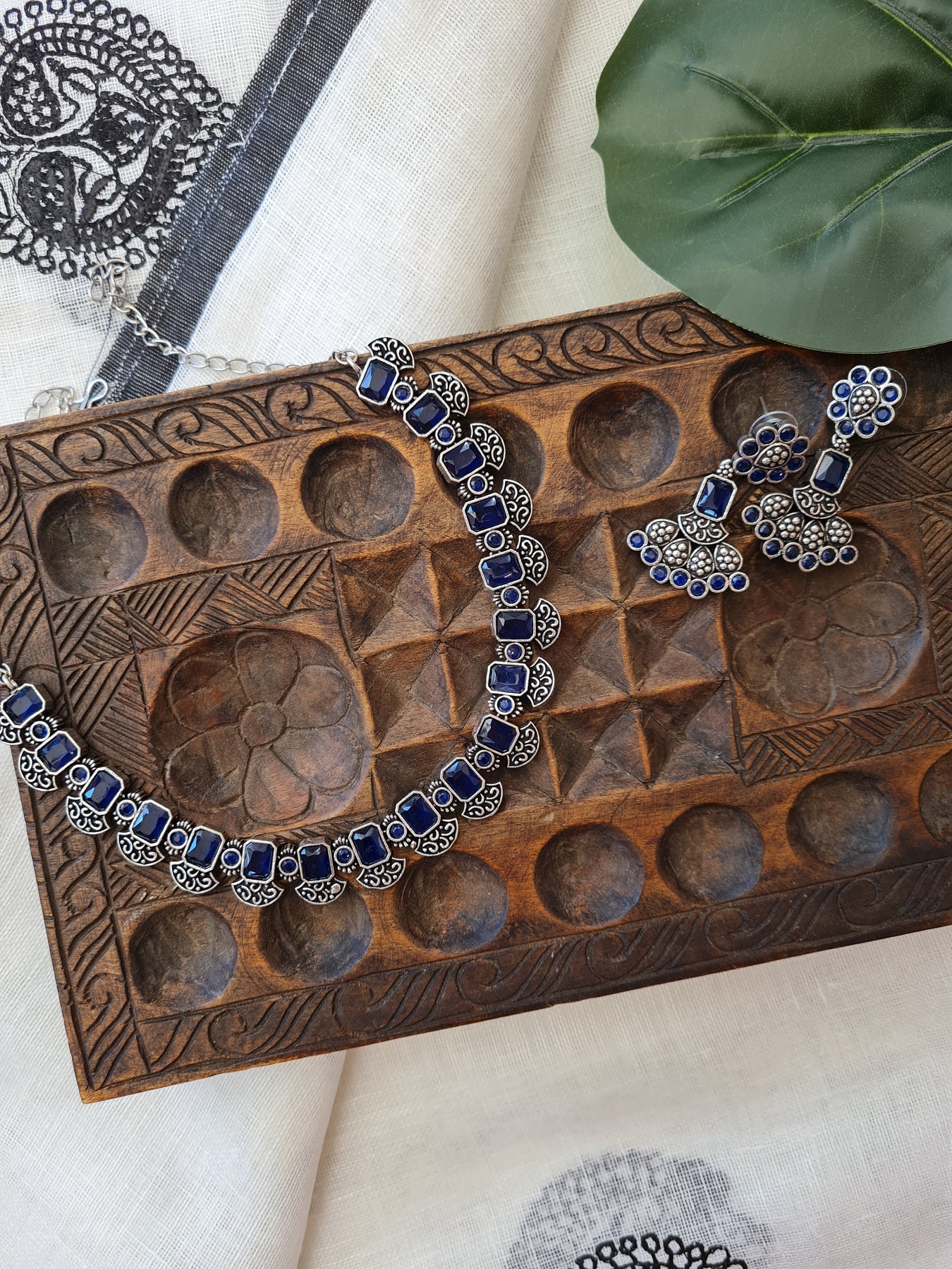 Oxidized Silver Necklace with Blue stones paired with matching Earrings