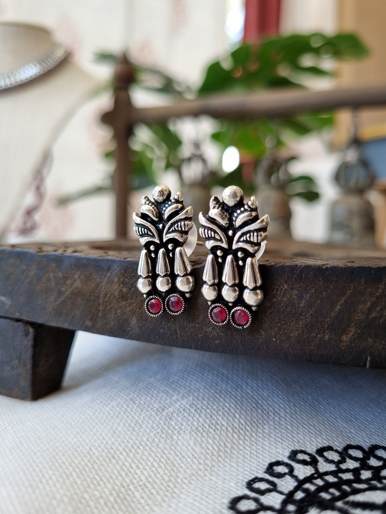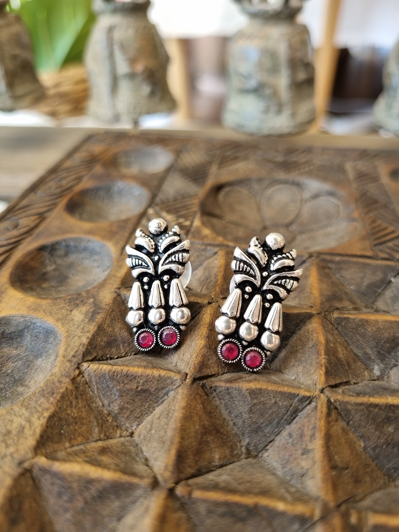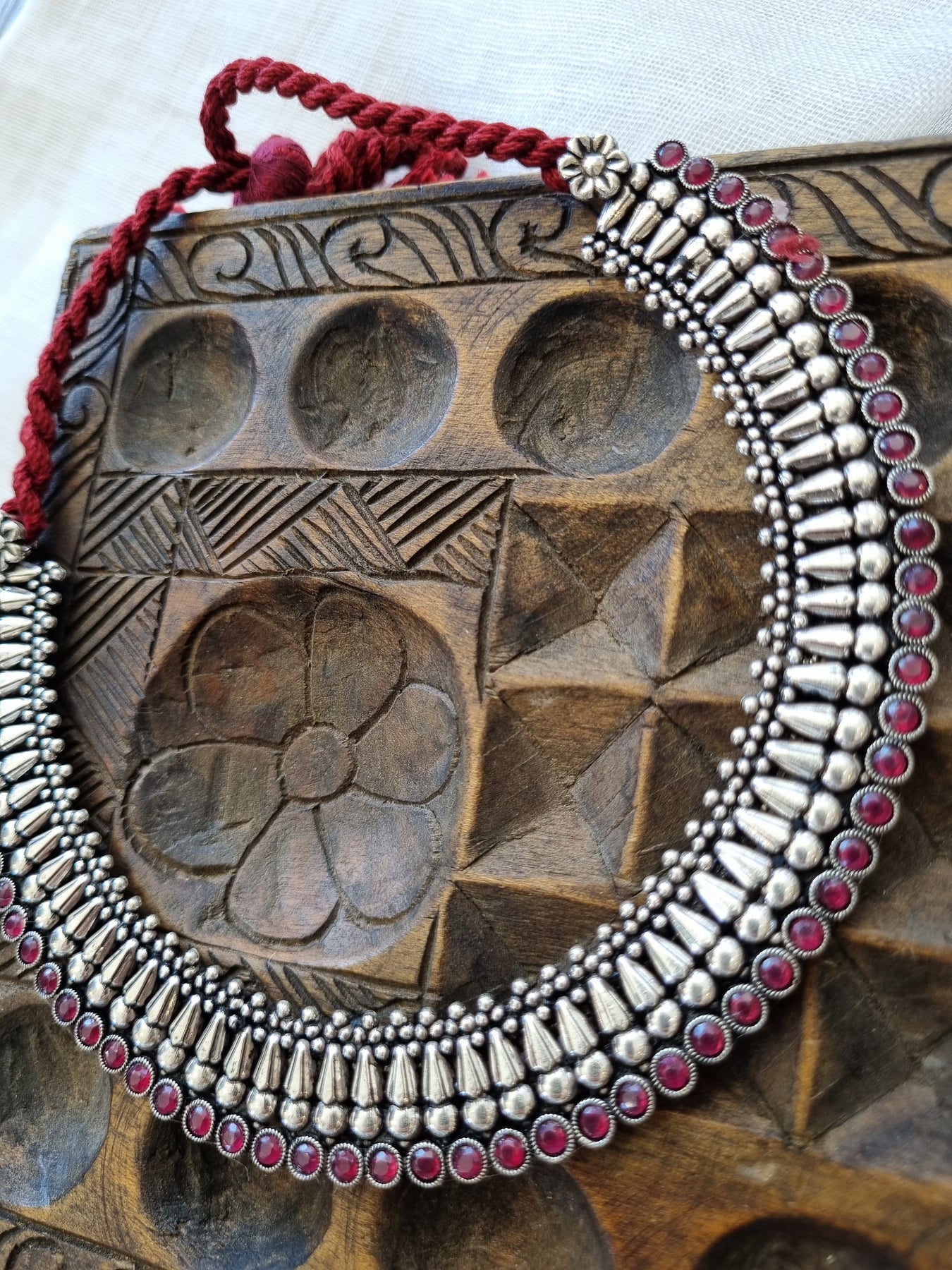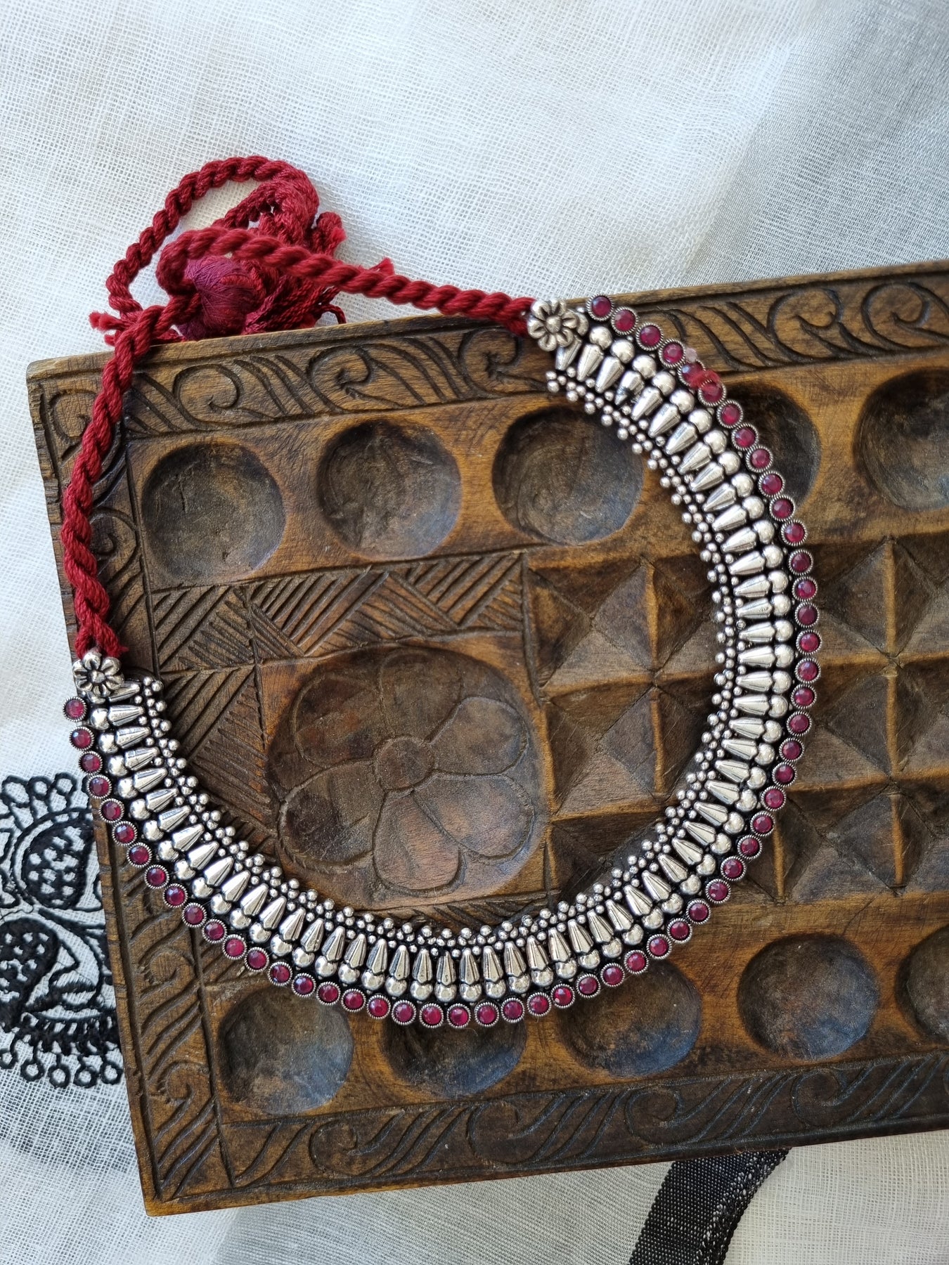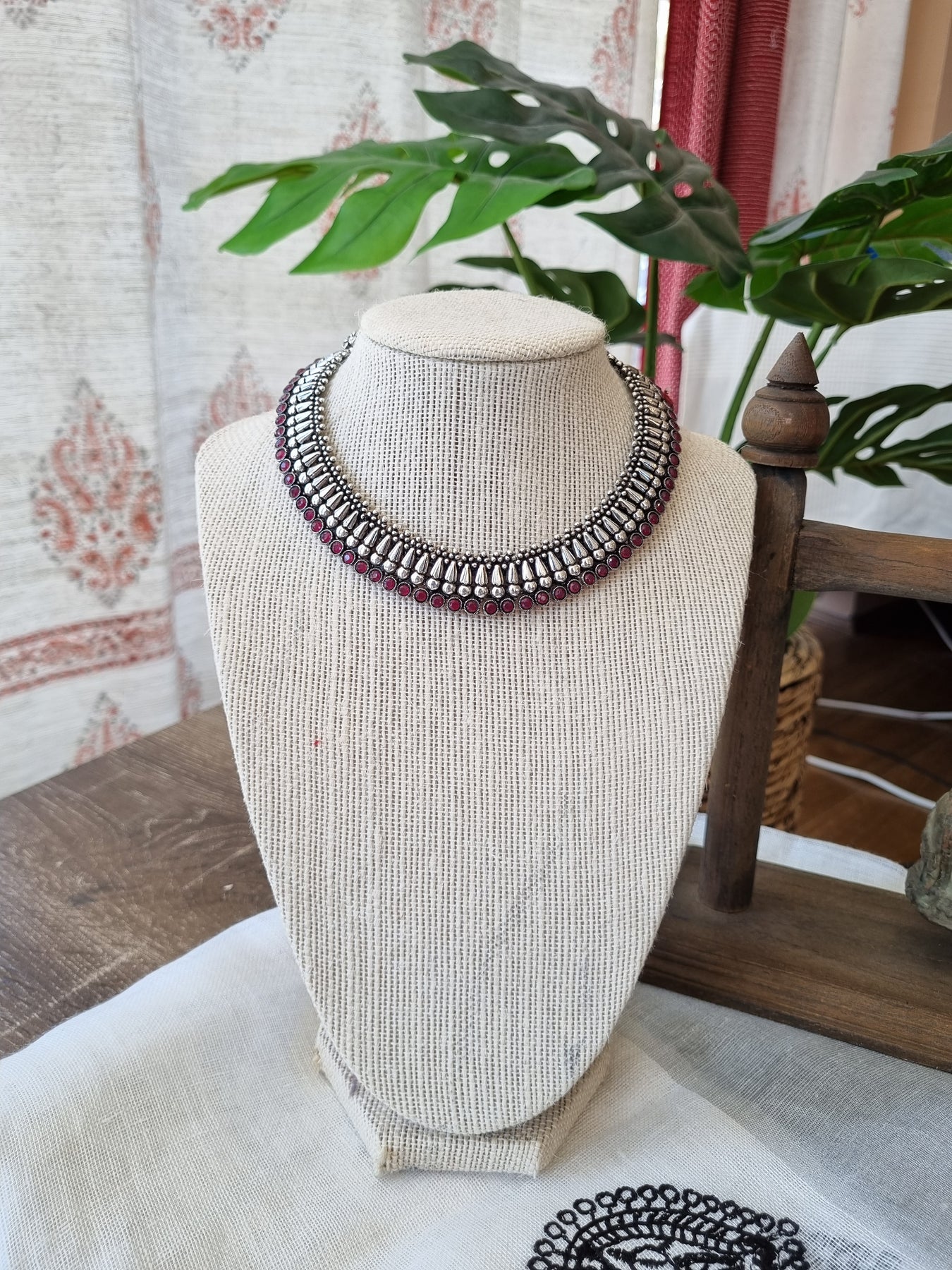 Oxidized Silver Necklace with pink stones paired with matching Earrings