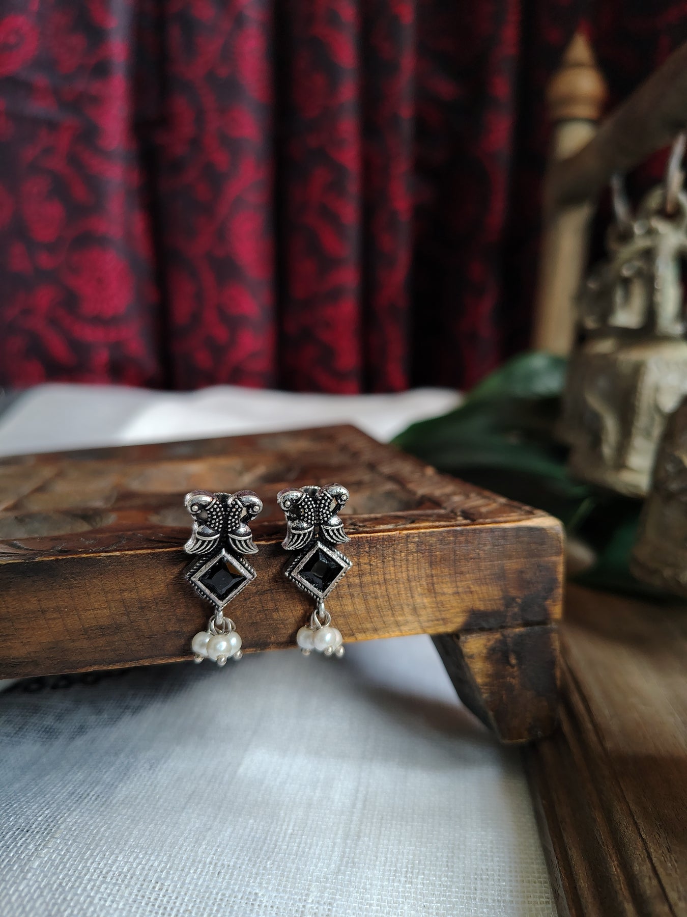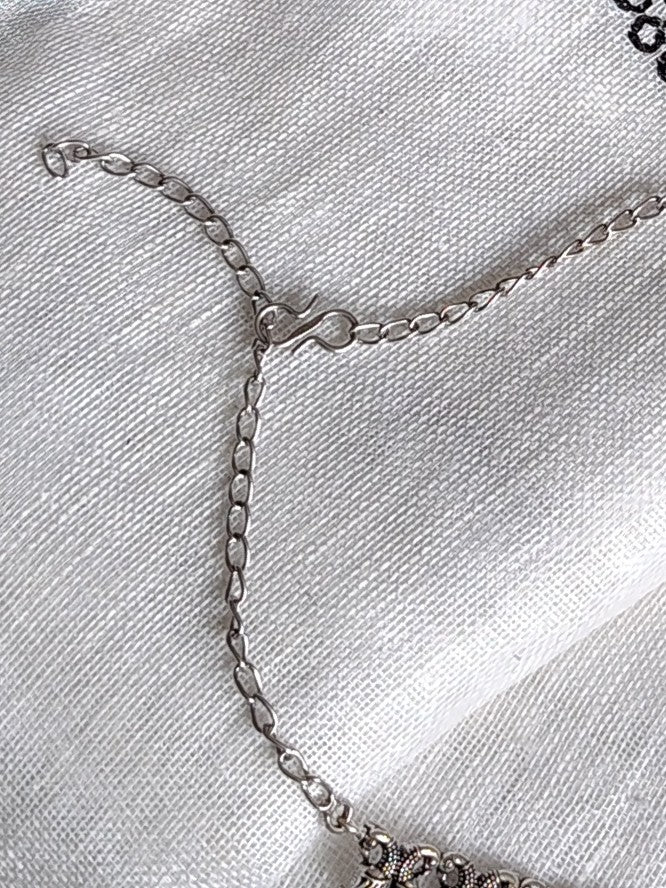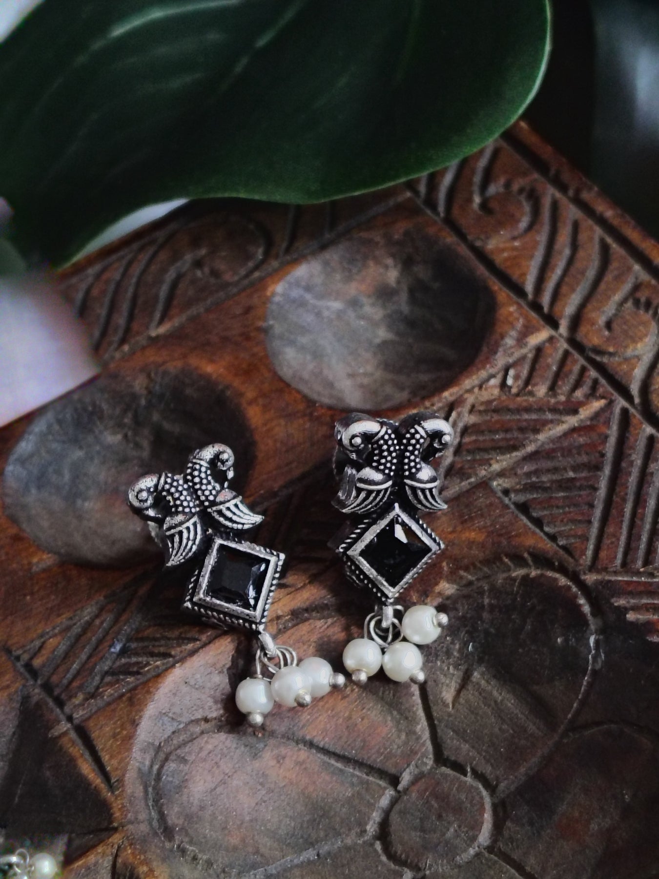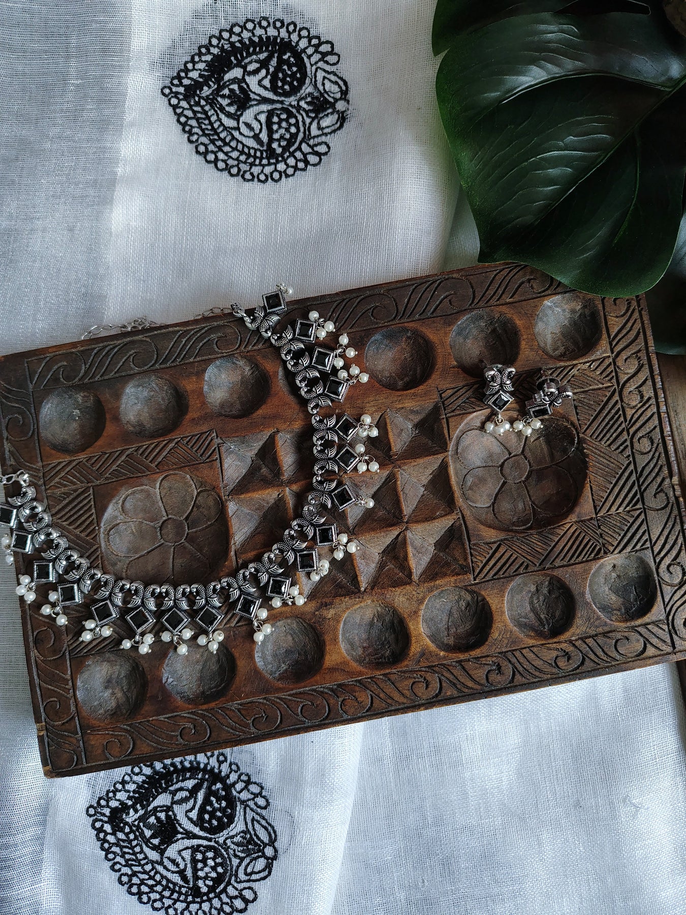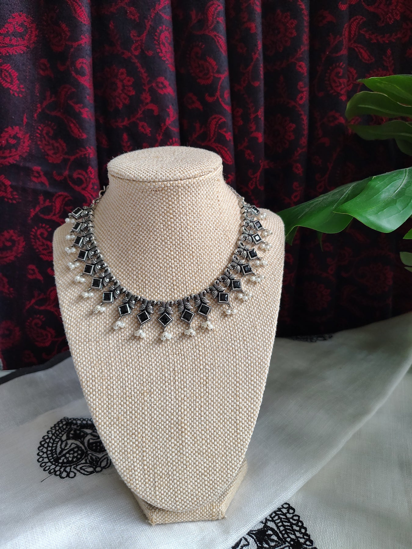 • Oxidised Silver Stone Necklace with black Stones paired with matching Earrings