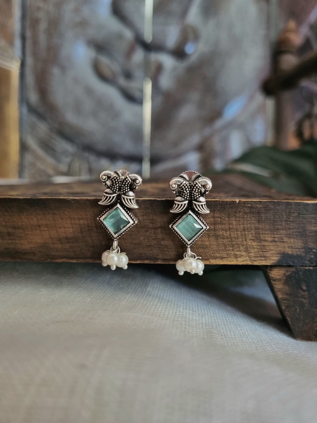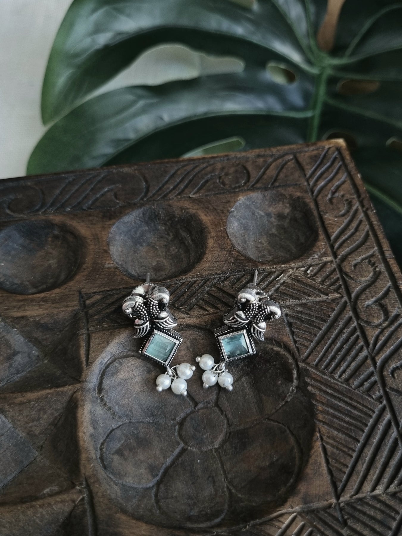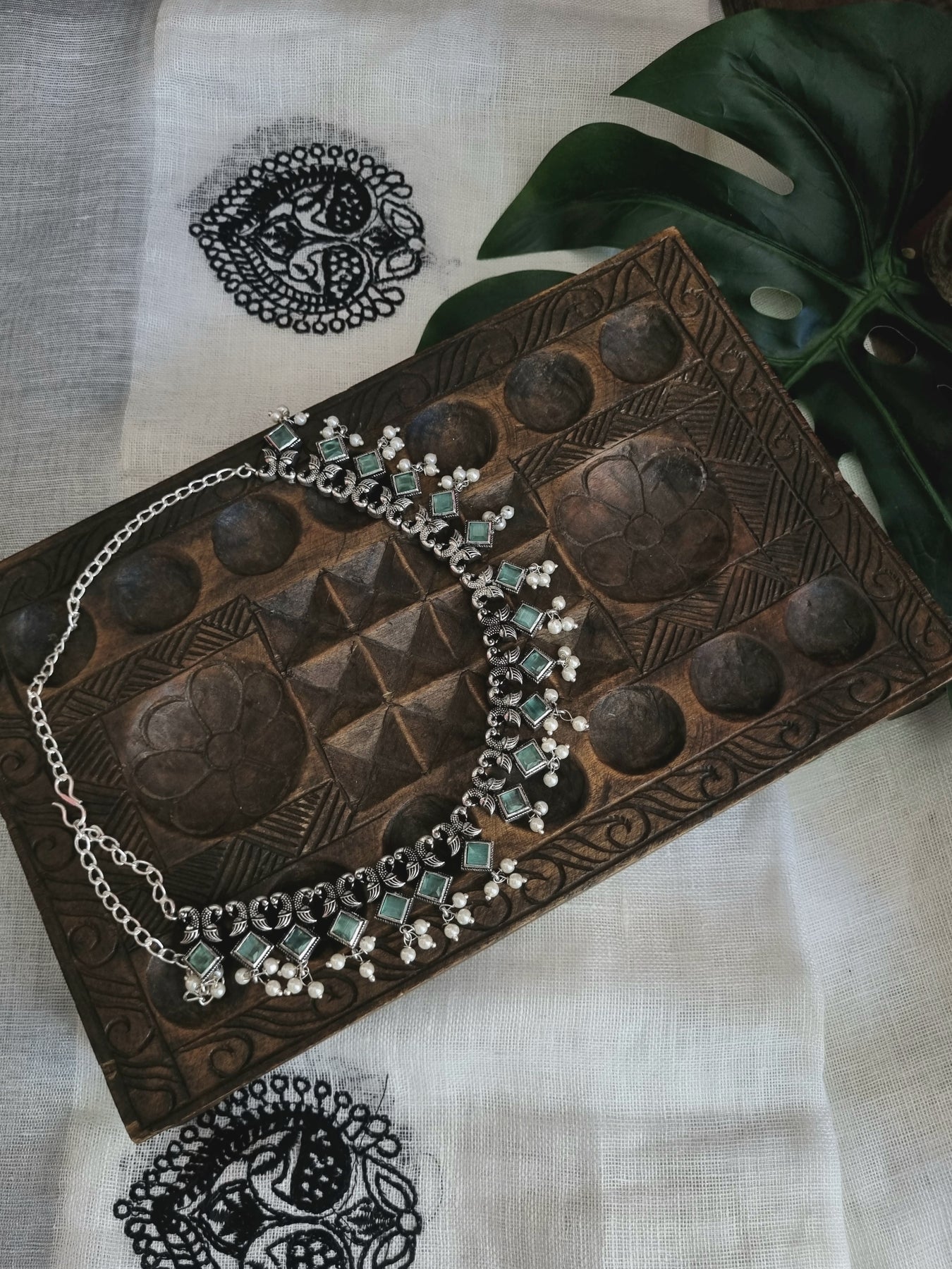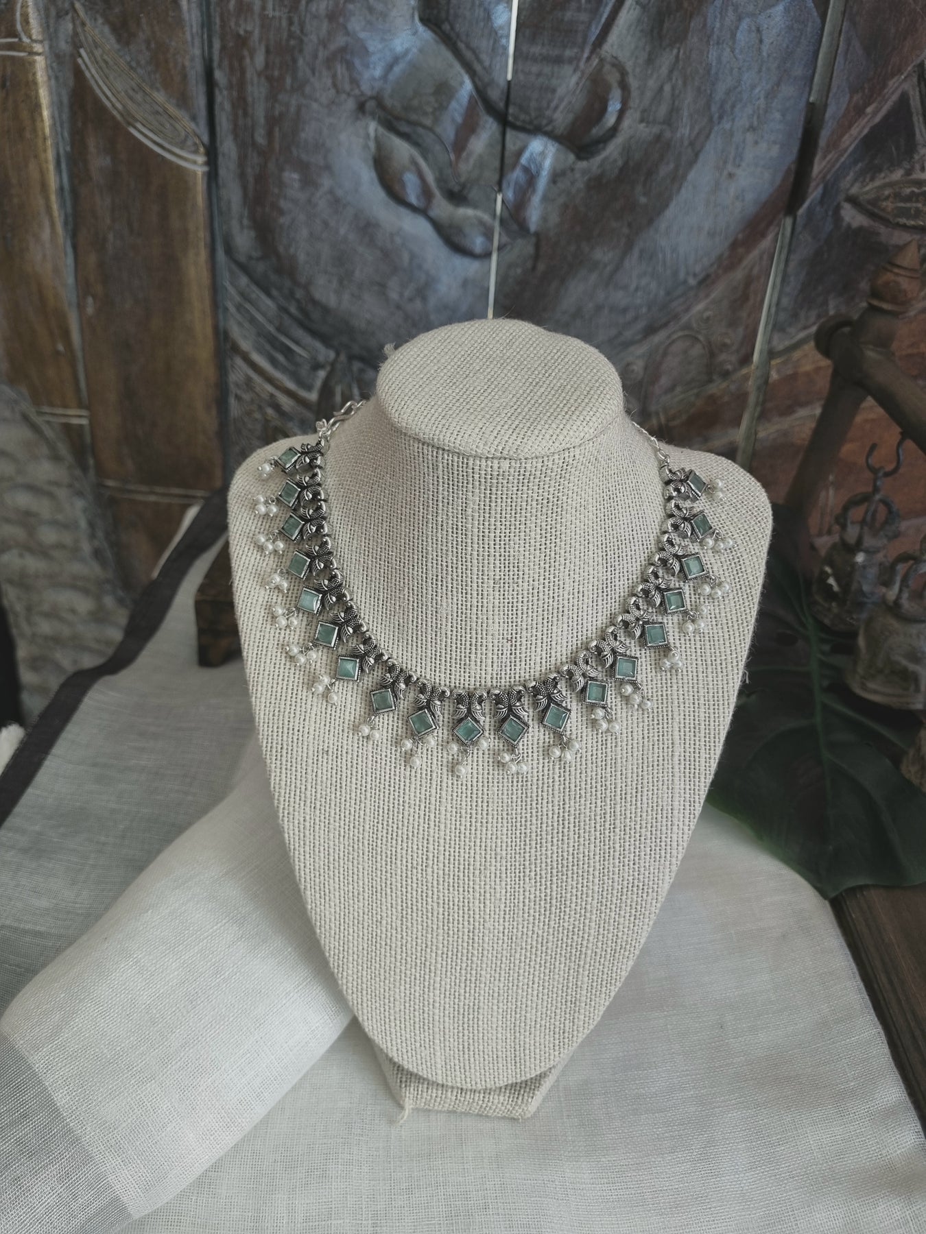 Oxidised Silver Stone Necklace with teal stones paired with matching Earrings
