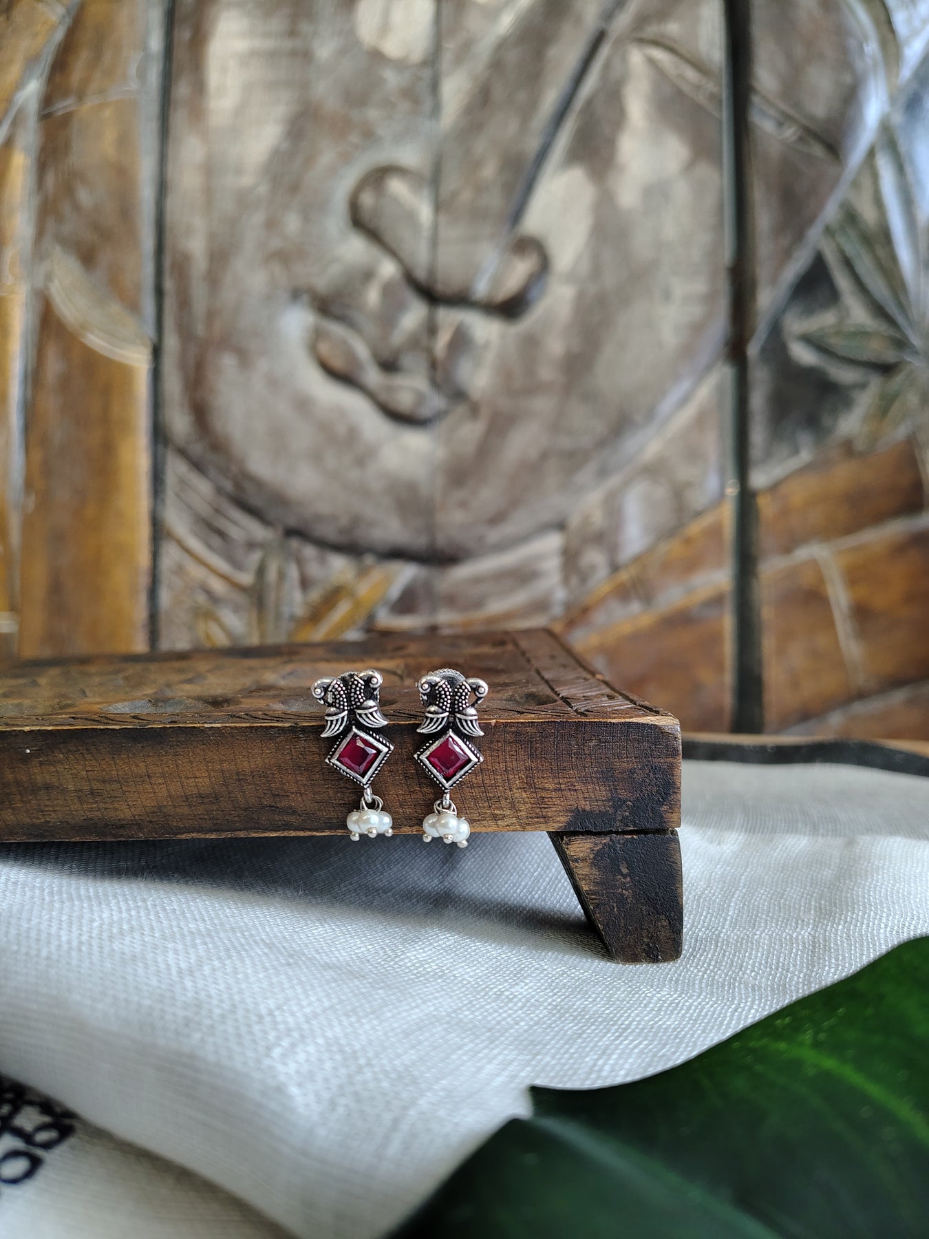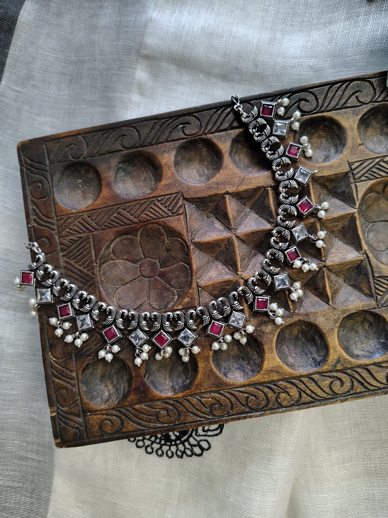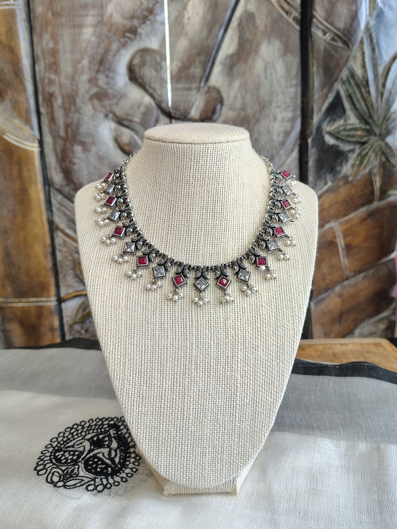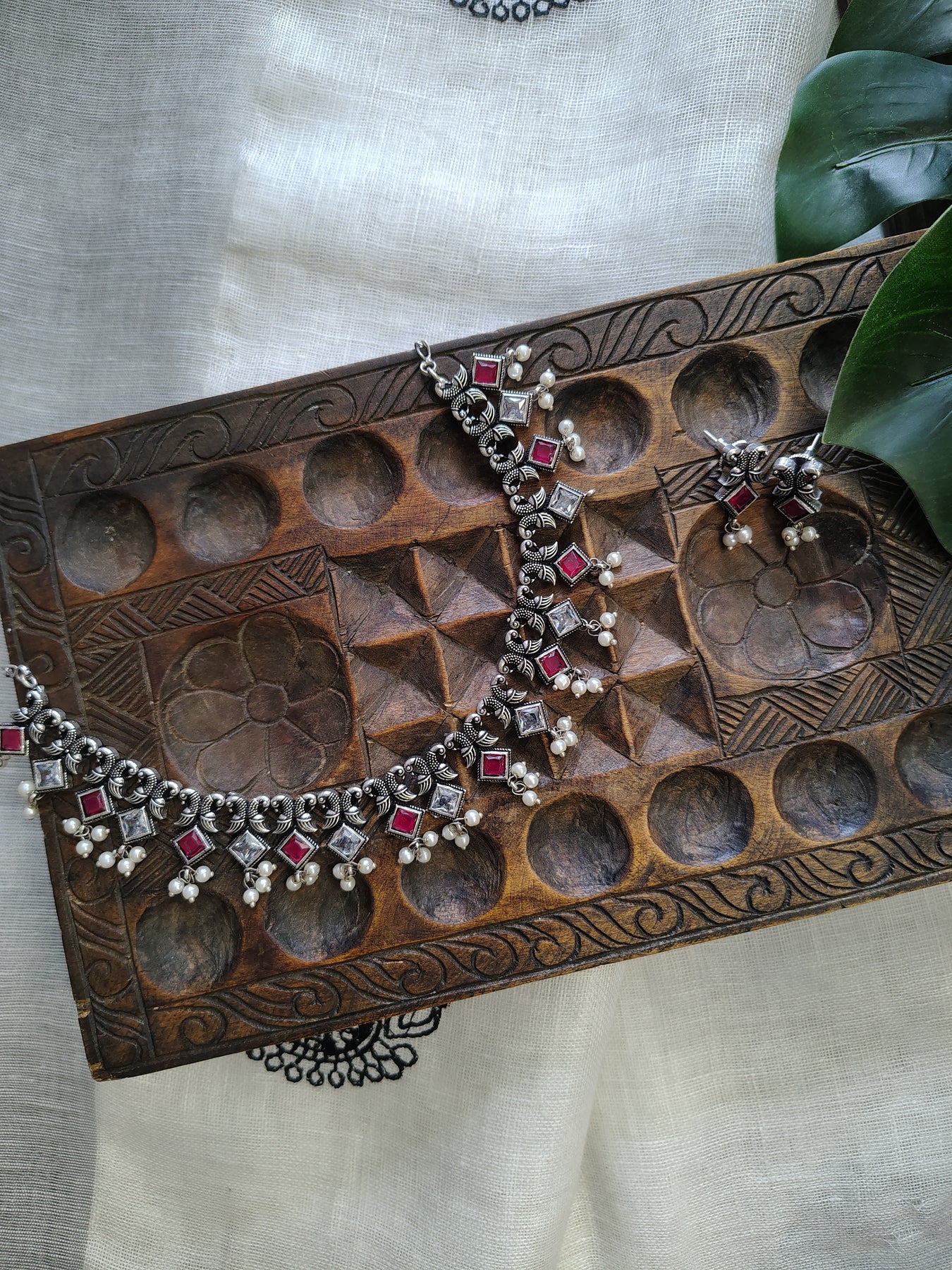 Oxidised Silver Stone Necklace with Pink Stones and pearls paired with matching Earrings