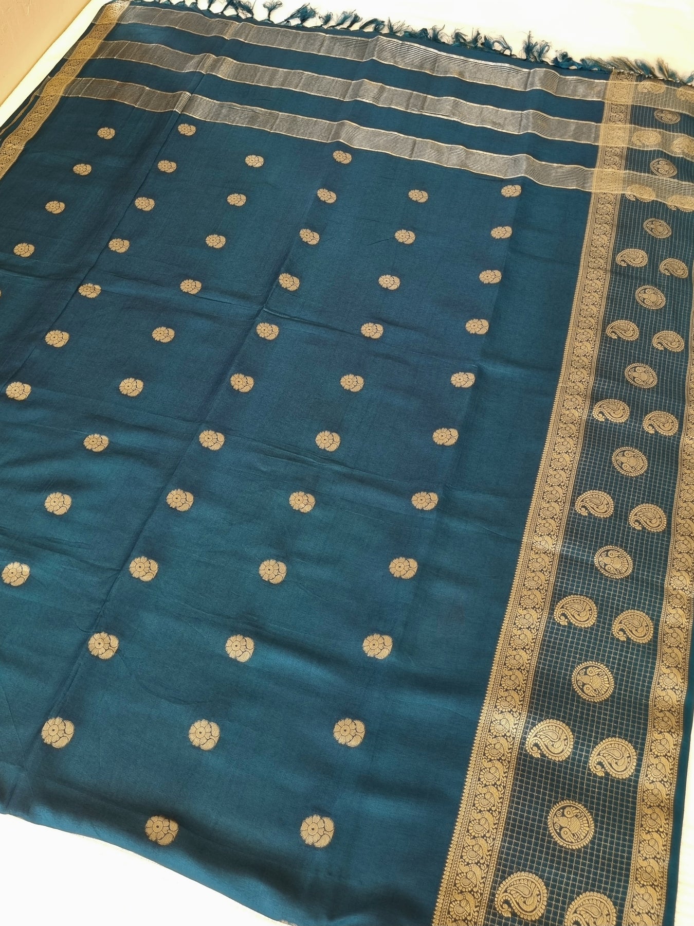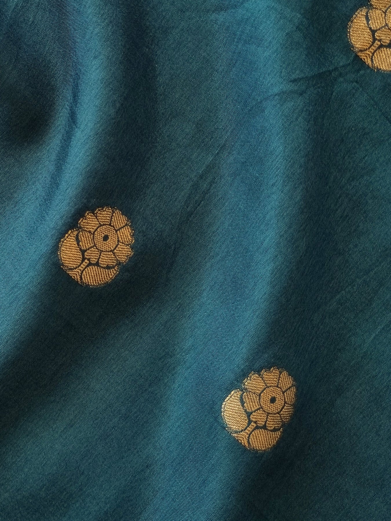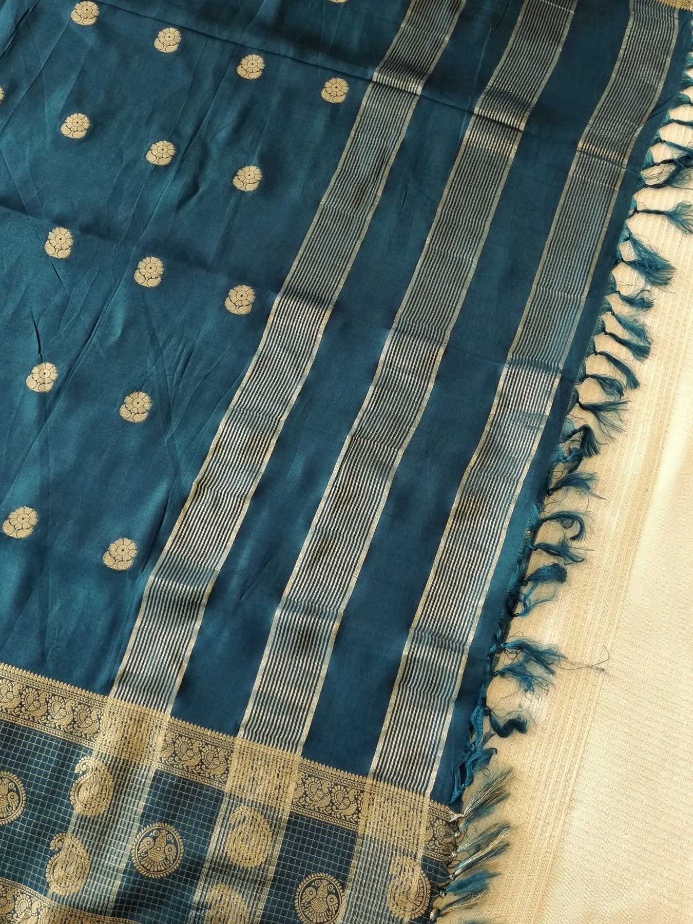 An elegant Teal Crepe Silk Saree with Gold Borders and gold motifs on Body of the saree