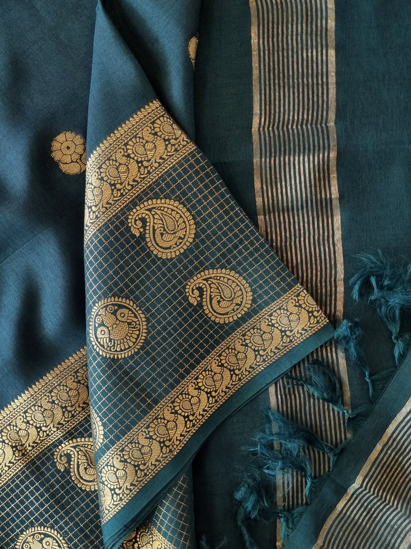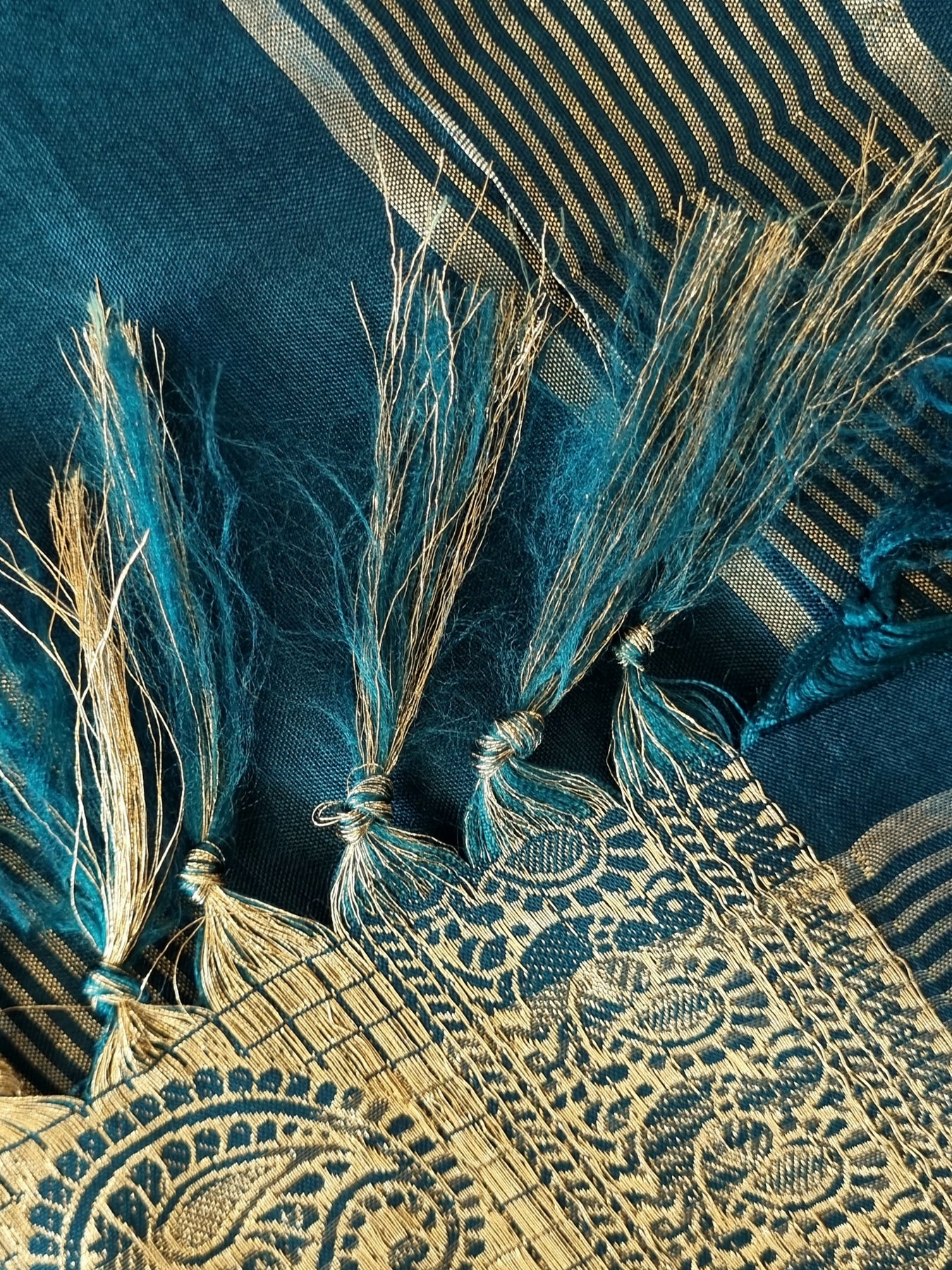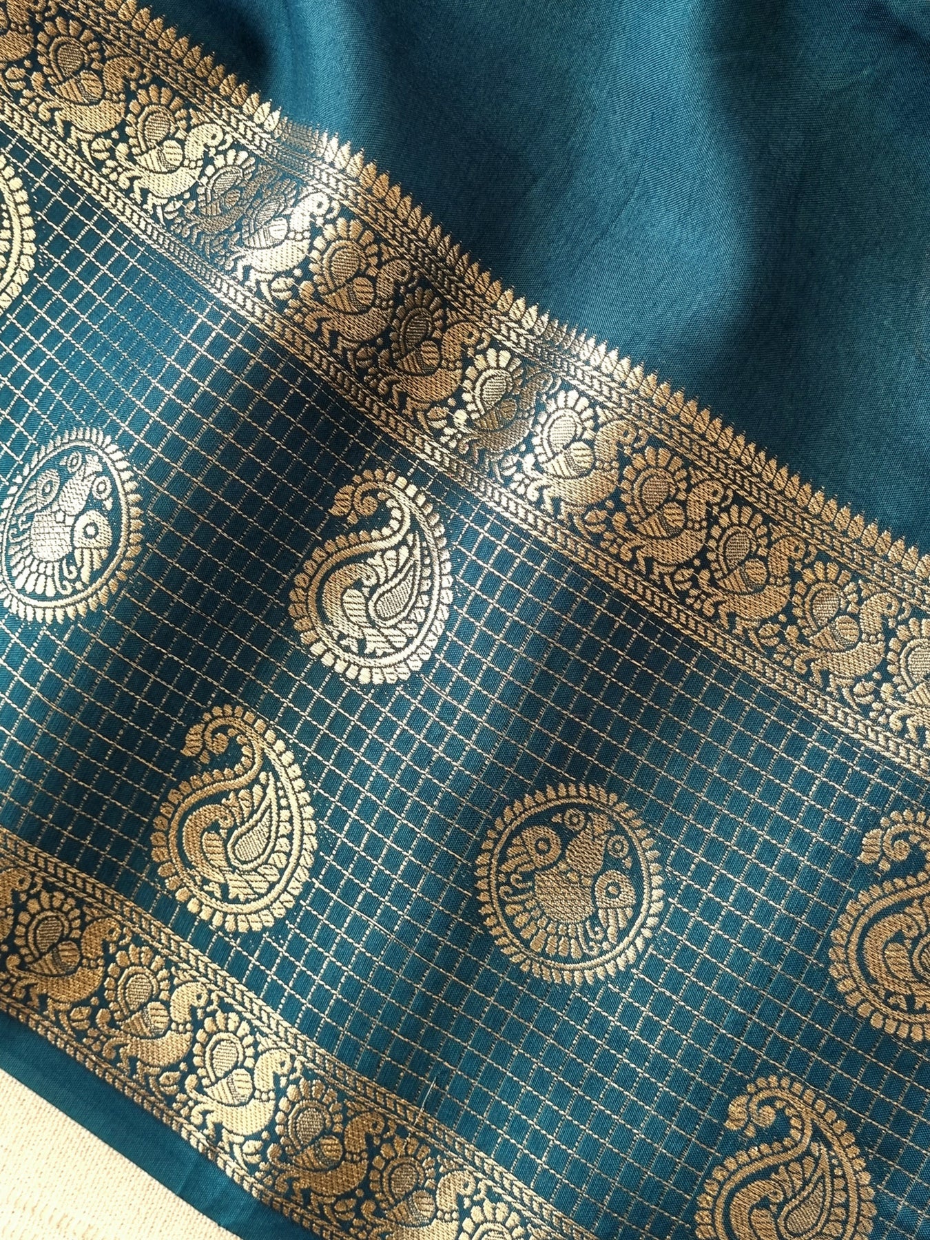 An elegant Teal Crepe Silk Saree with Gold Borders and gold motifs on Body of the saree