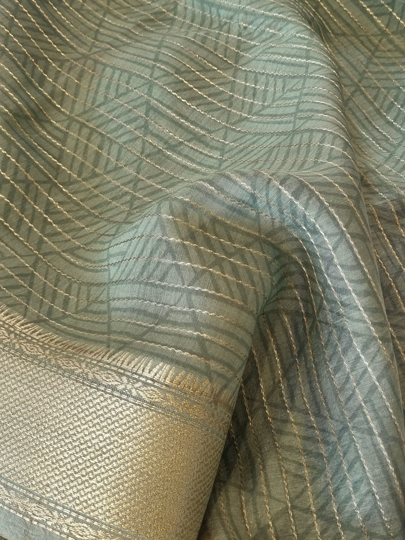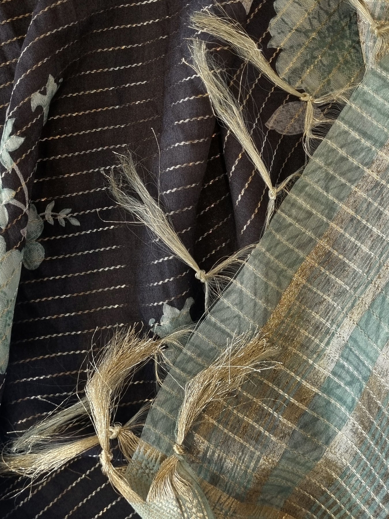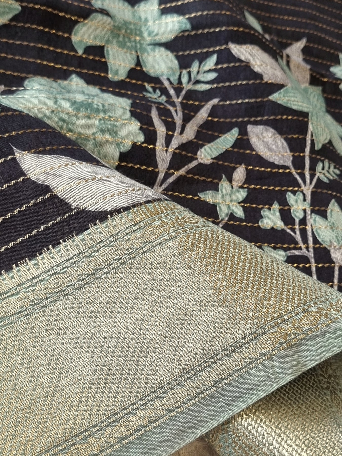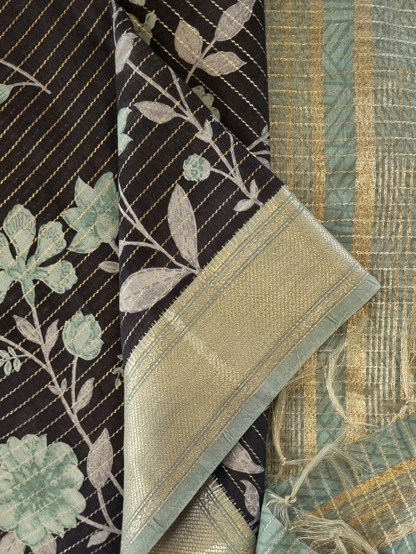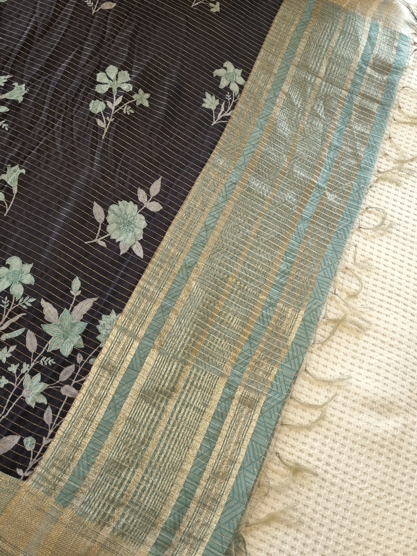 • Semi Silk Saree with floral prints on the body, gold borders, and a woven pallu, beautifully finished with tassels