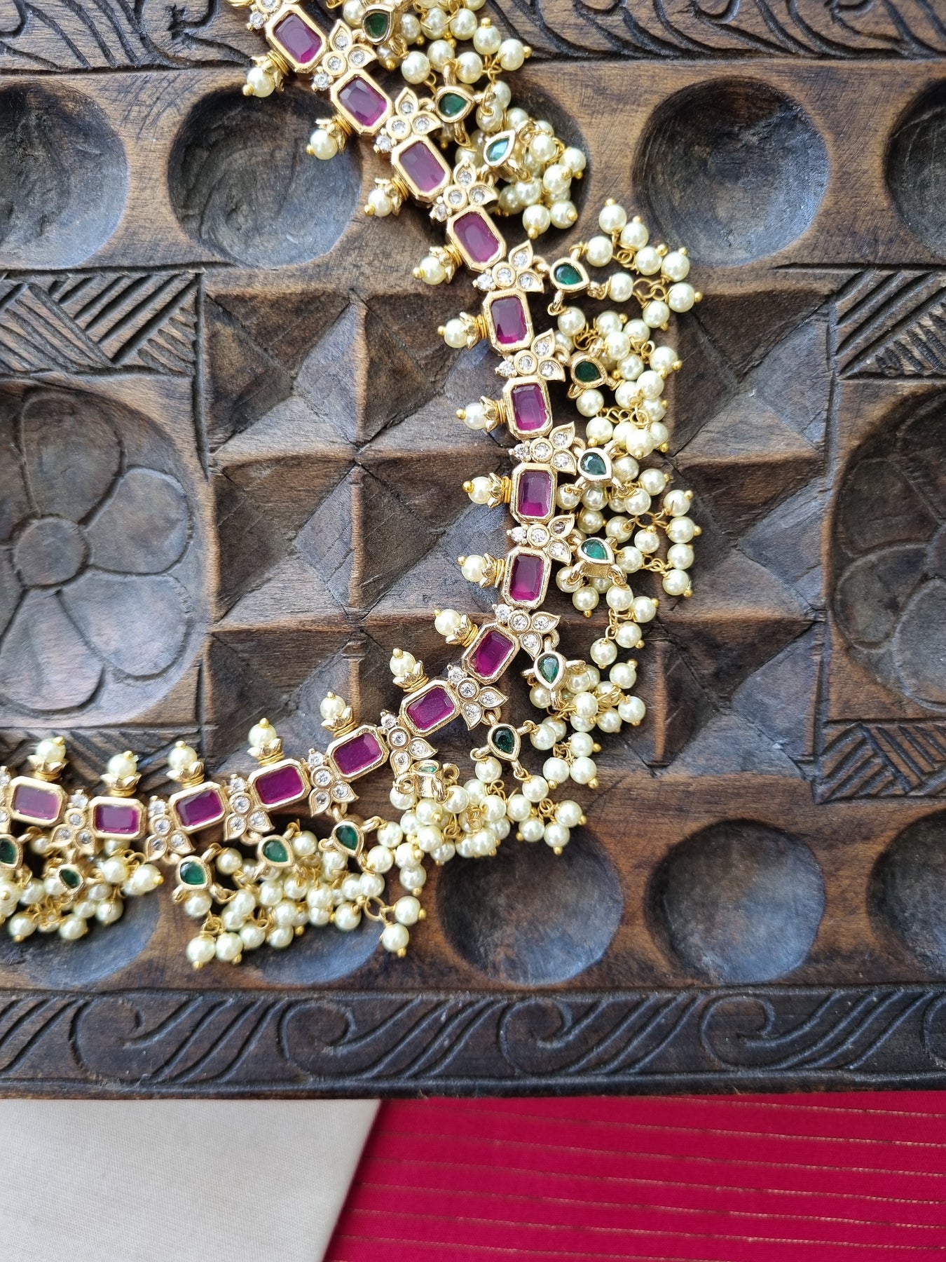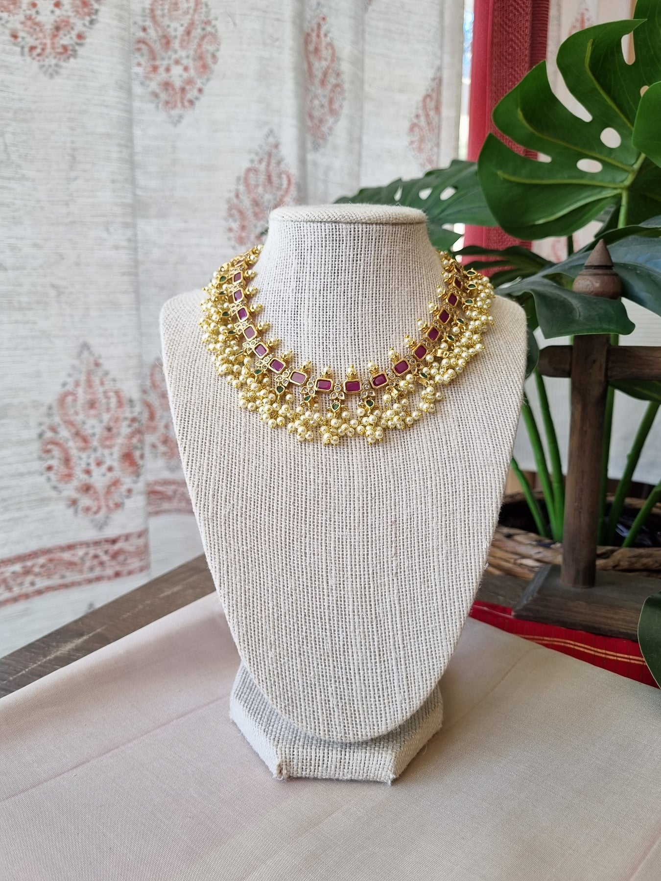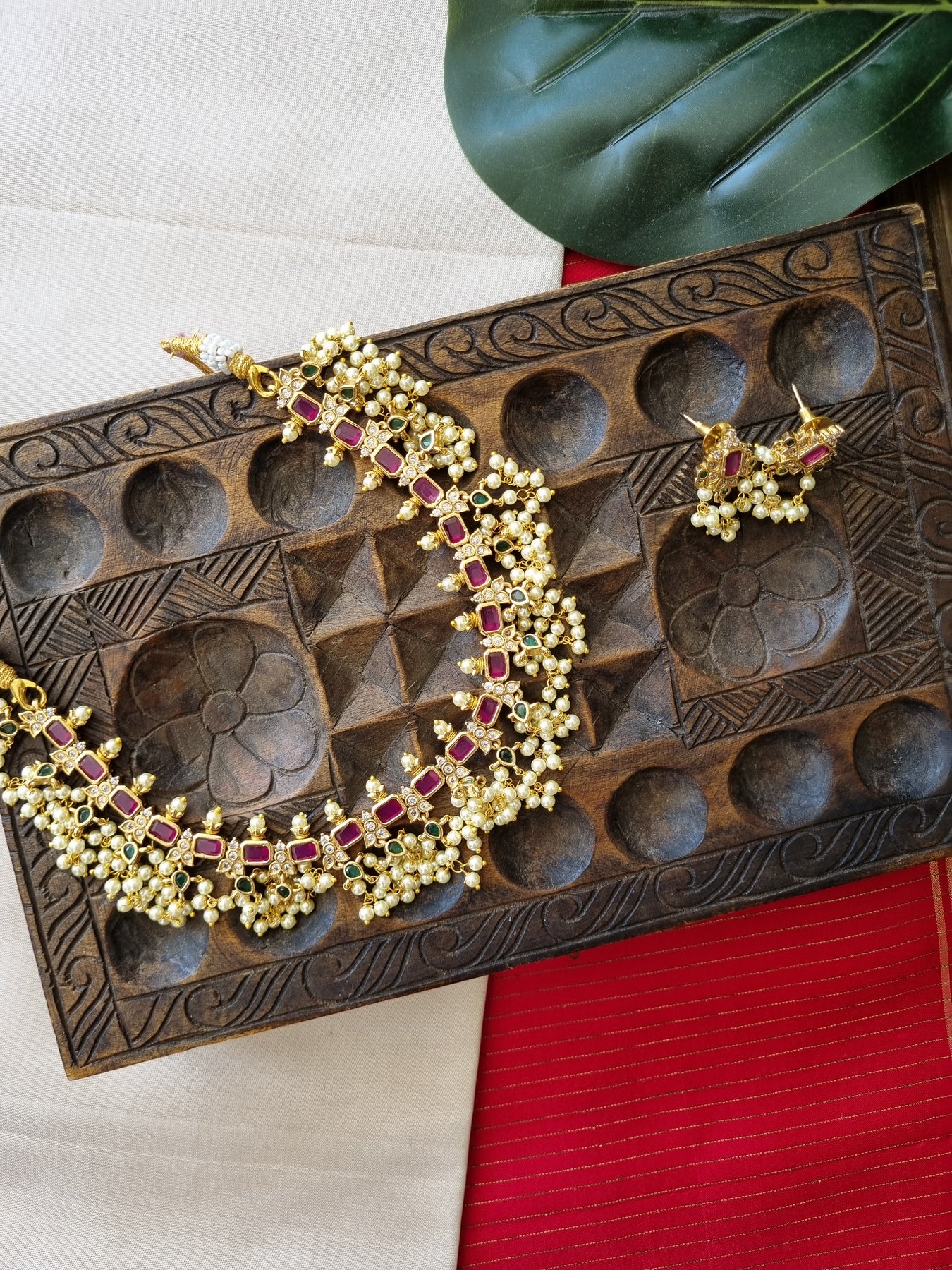 A beautiful necklace ornated with Pink stones and pearls, paired with Earrings