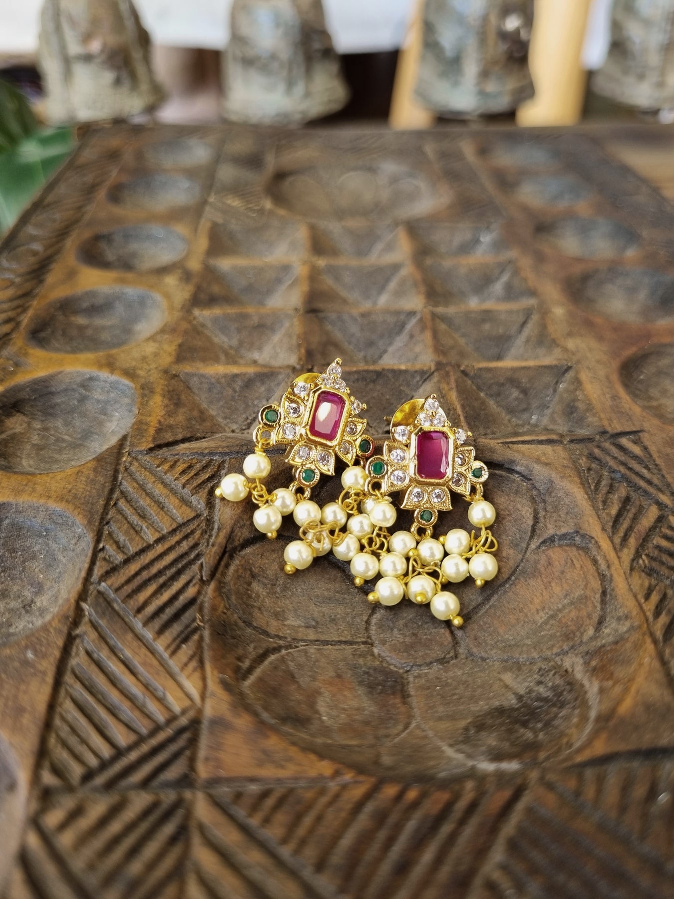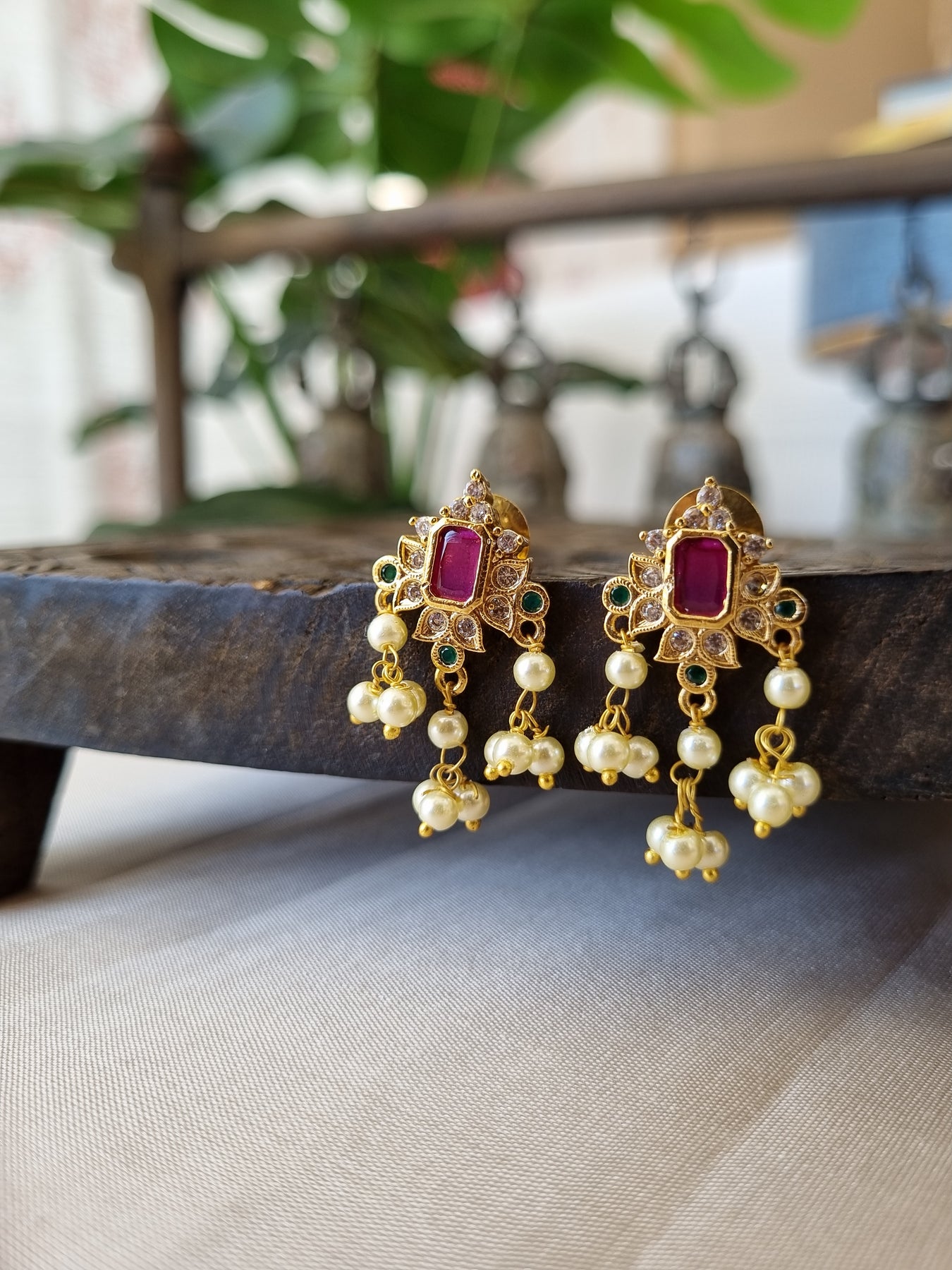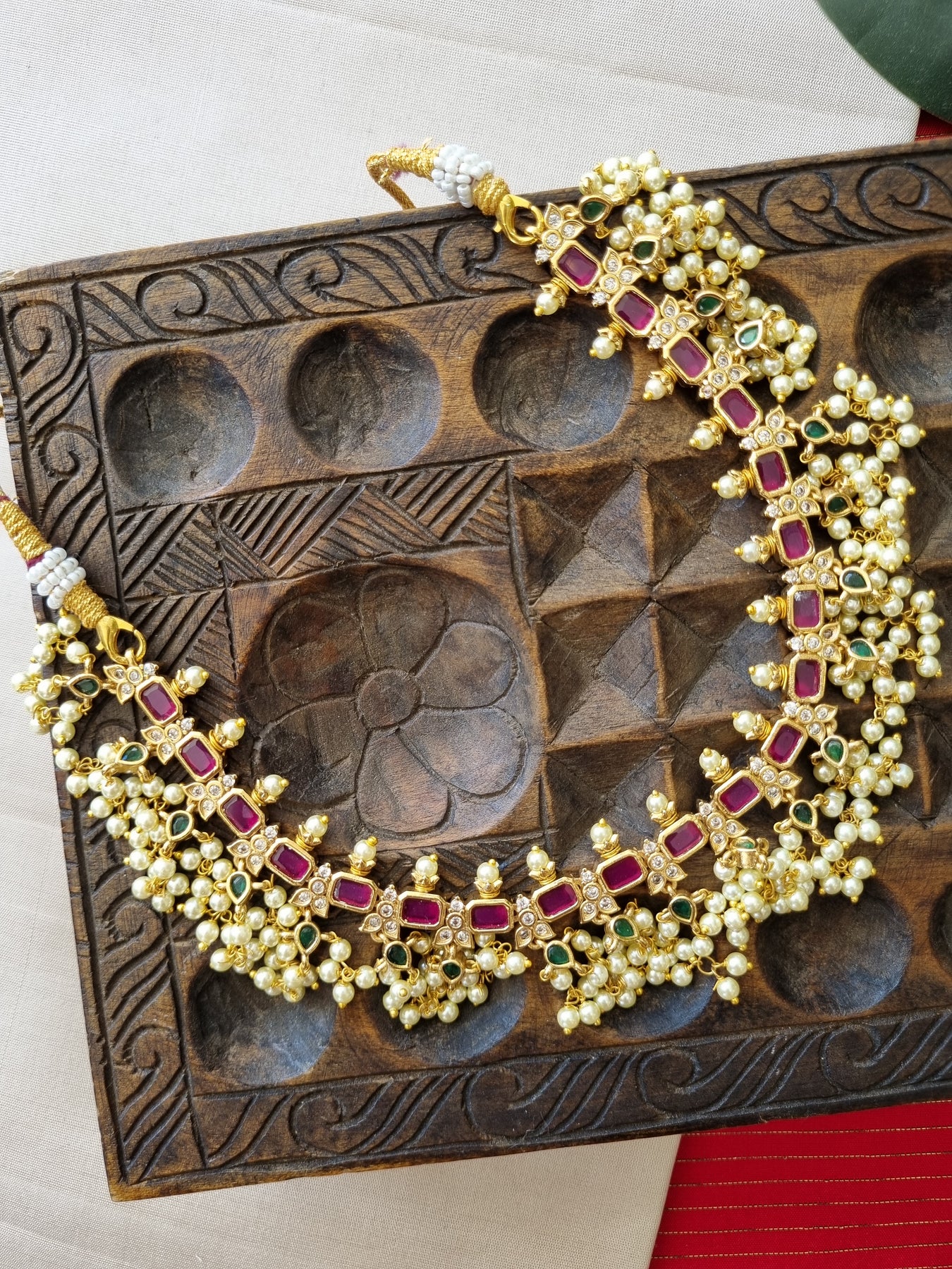 A beautiful necklace ornated with Pink stones and pearls, paired with Earrings