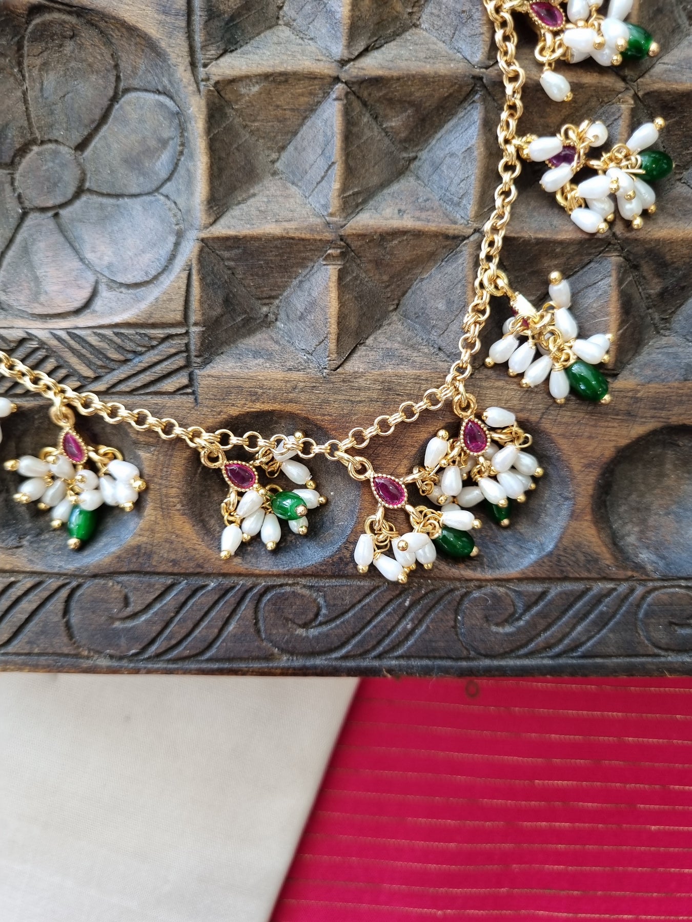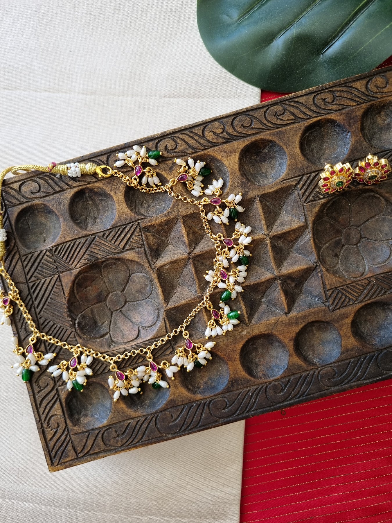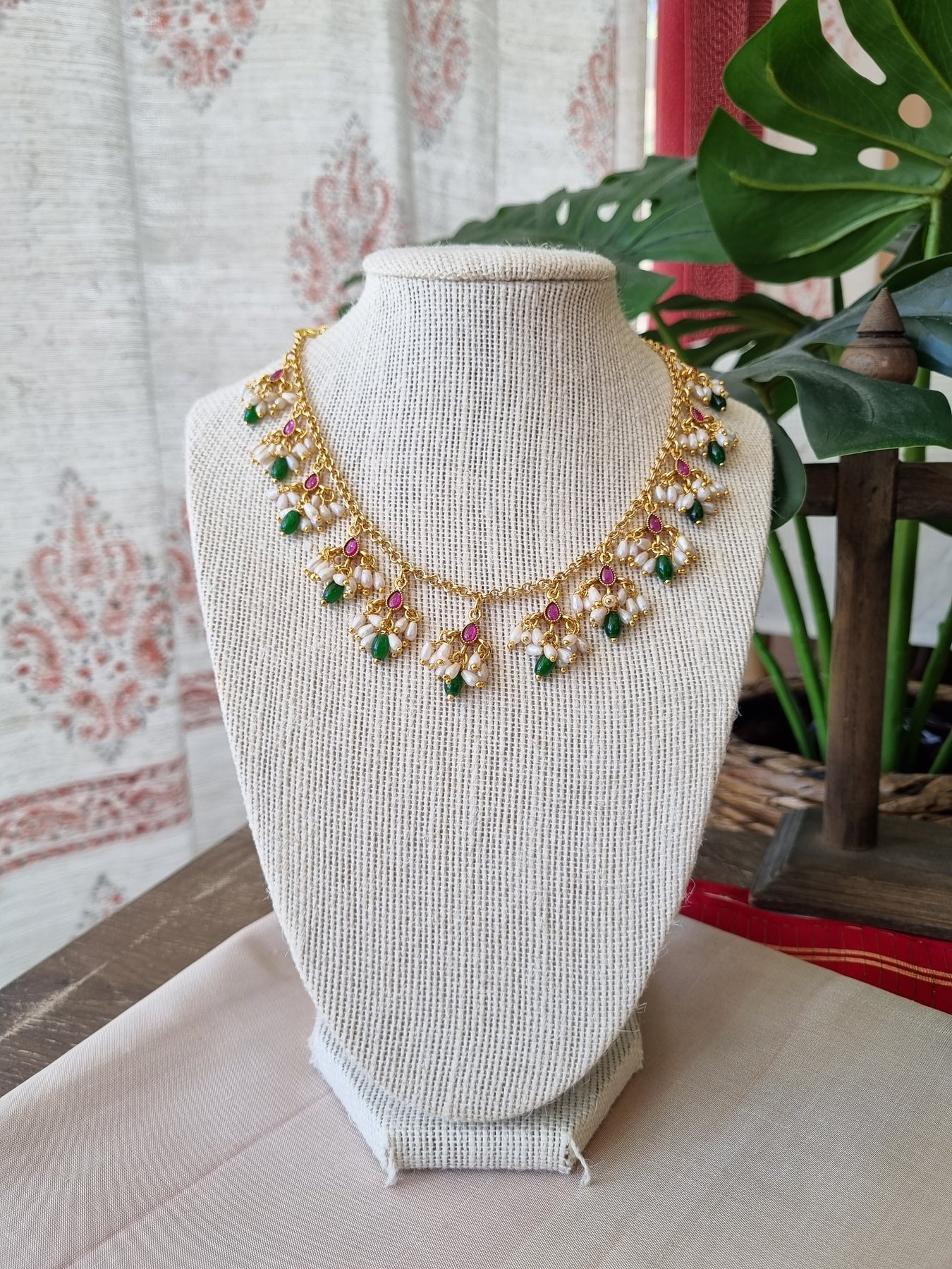 A beautiful necklace ornated with Pink & Green stones and pearls, paired with Earrings