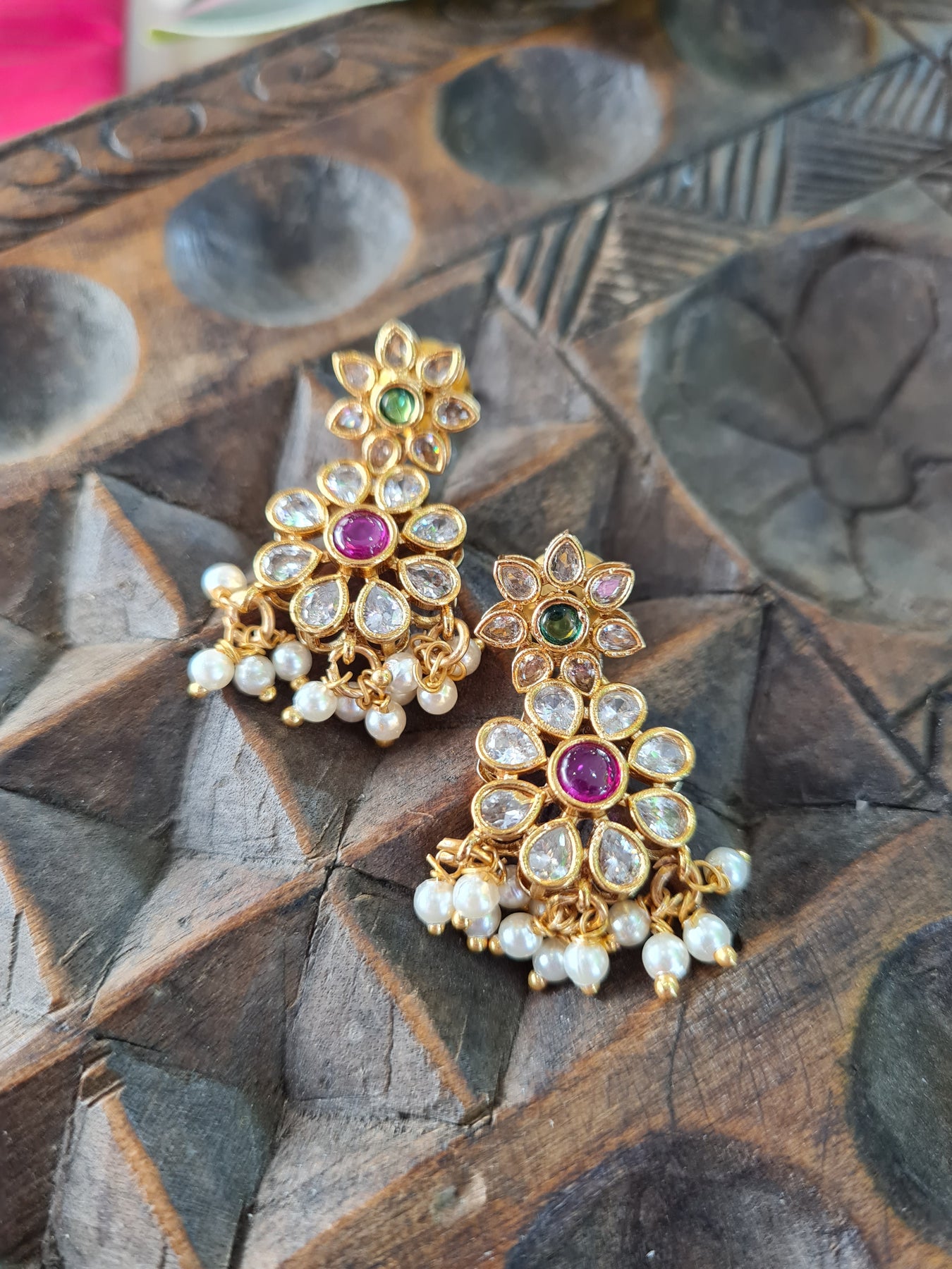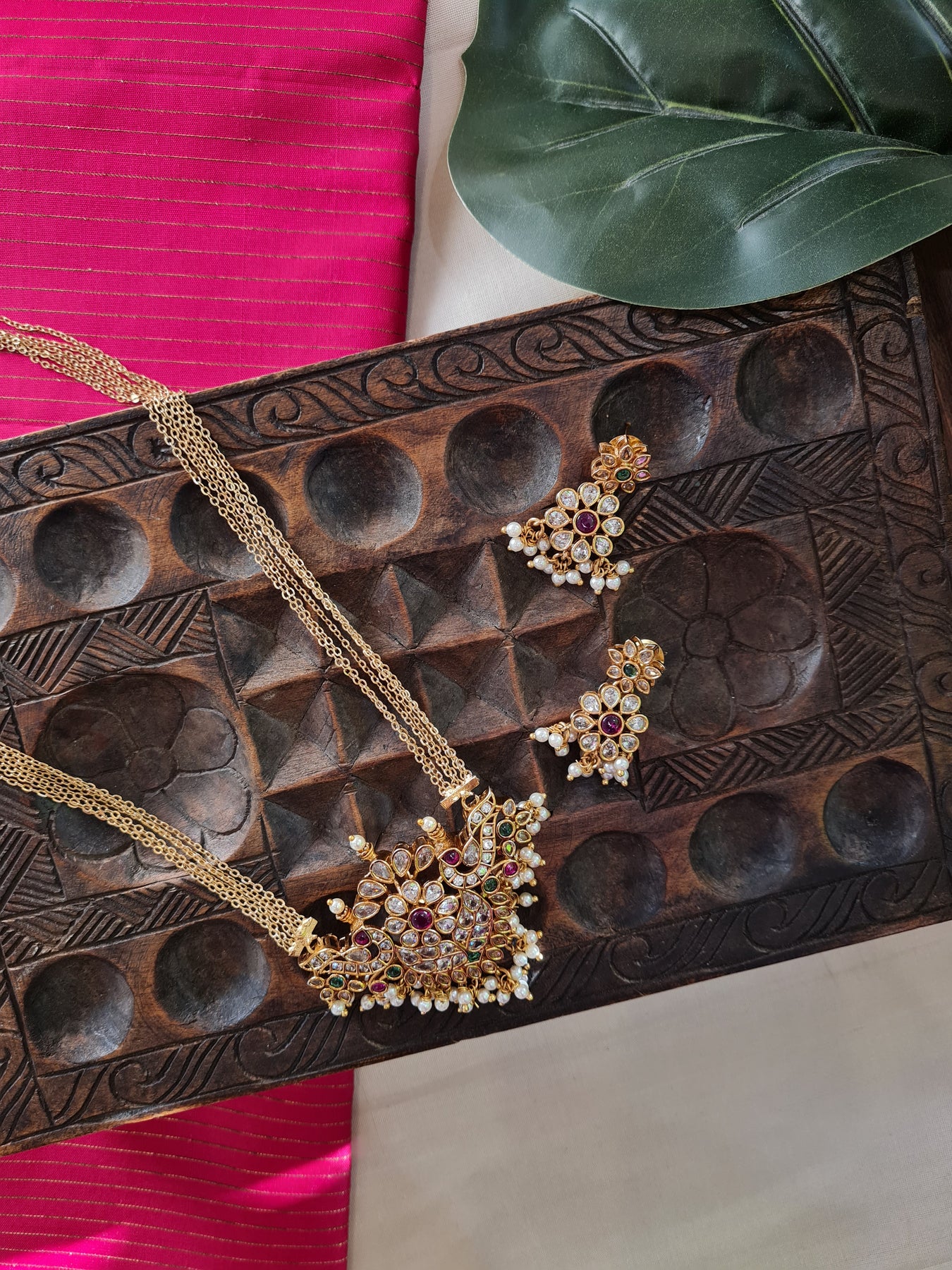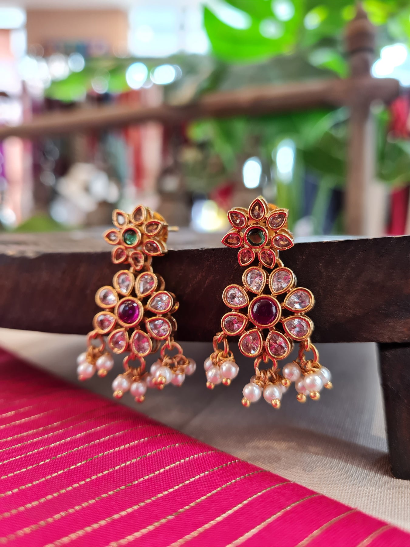 A beautiful necklace ornated with pink, white and green stones, and pearls, paired with matching Earrings