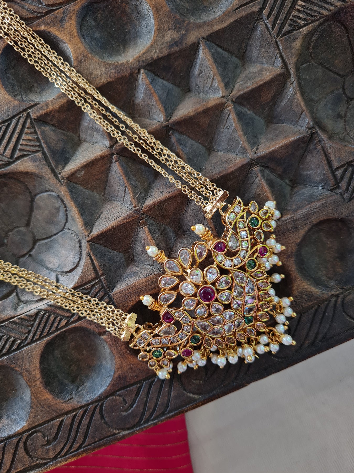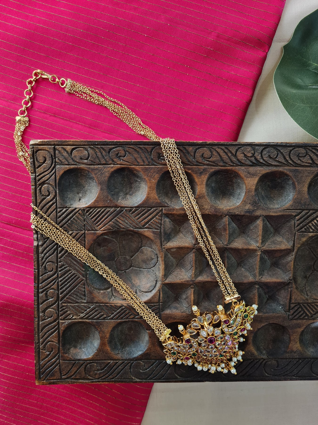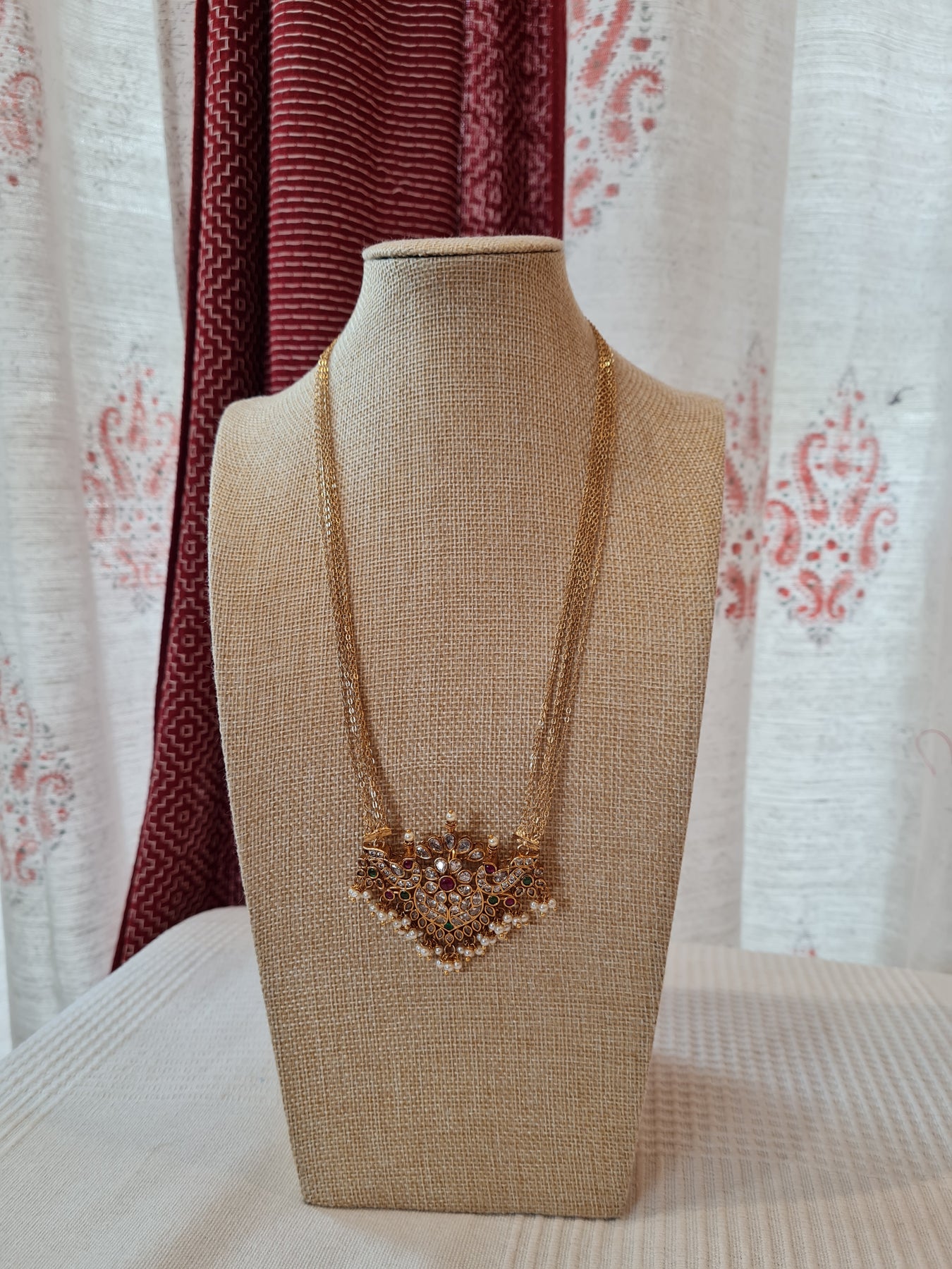 A beautiful necklace ornated with pink, white and green stones, and pearls, paired with matching Earrings