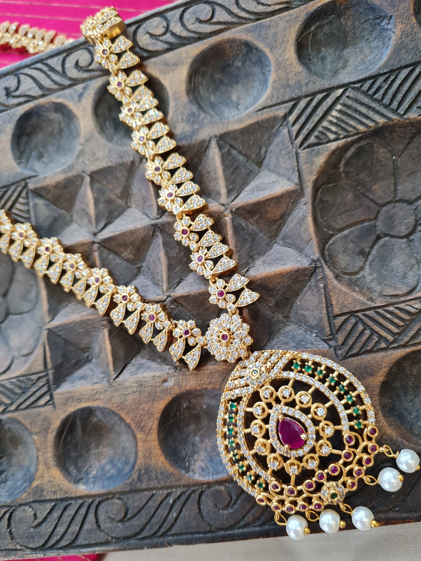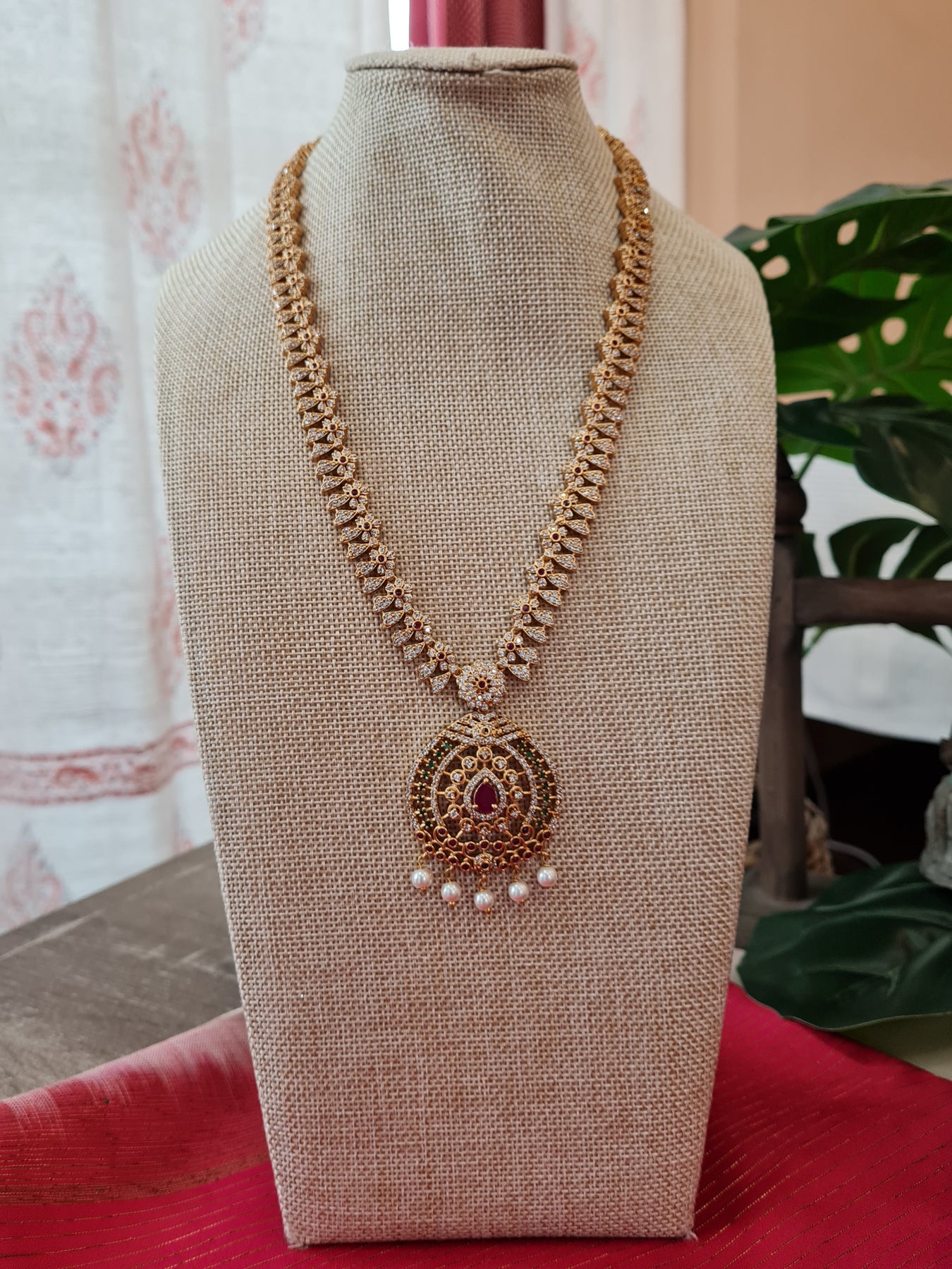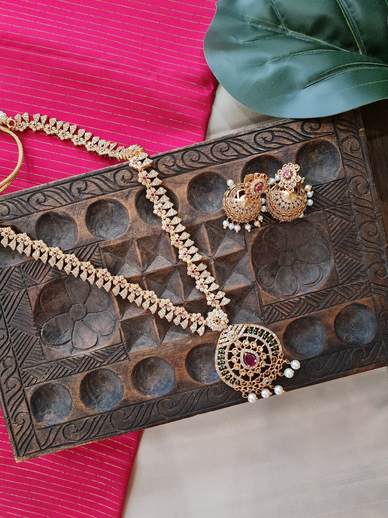 A beautiful necklace ornated with white, pink and green stones, and pearls, paired with matching Earrings