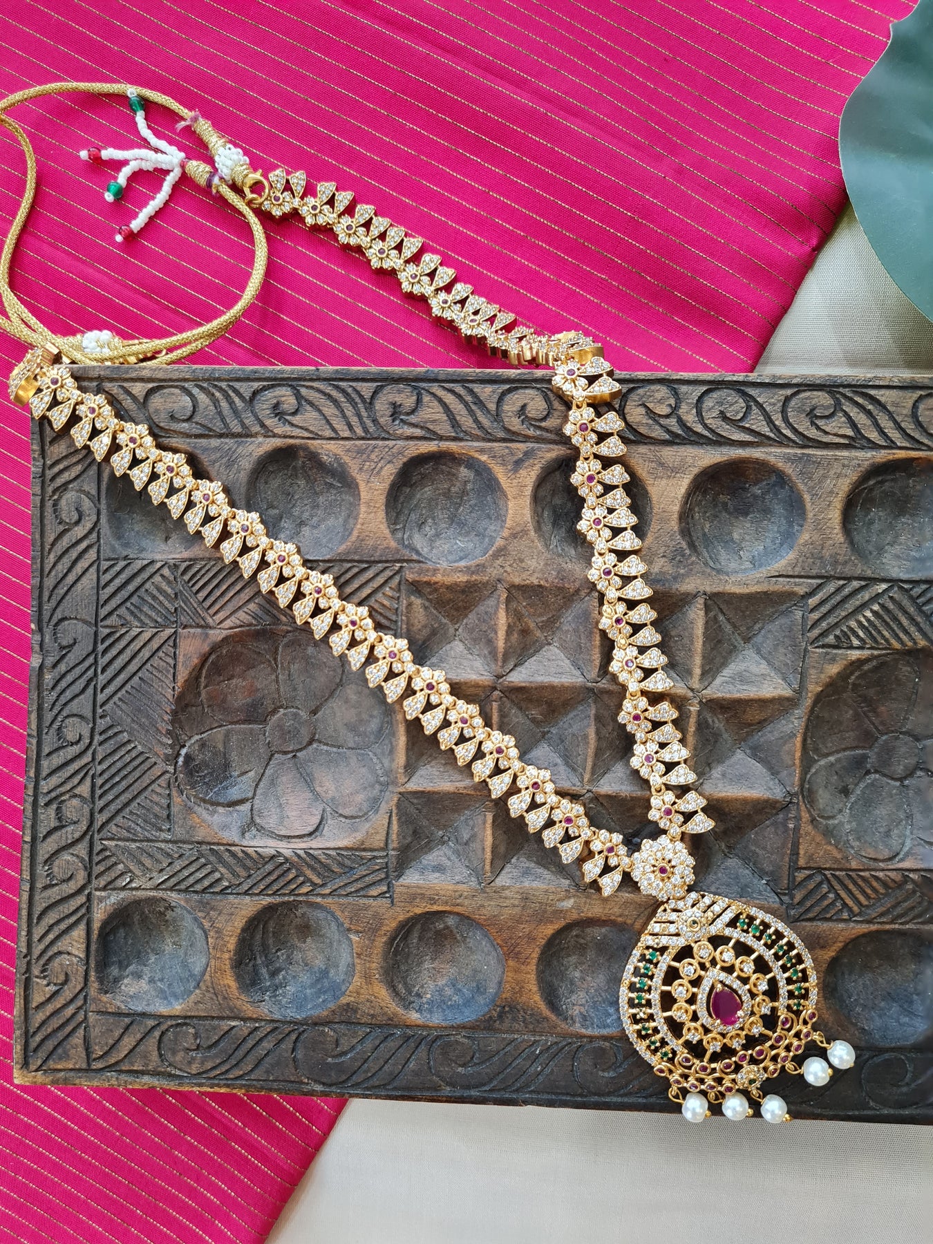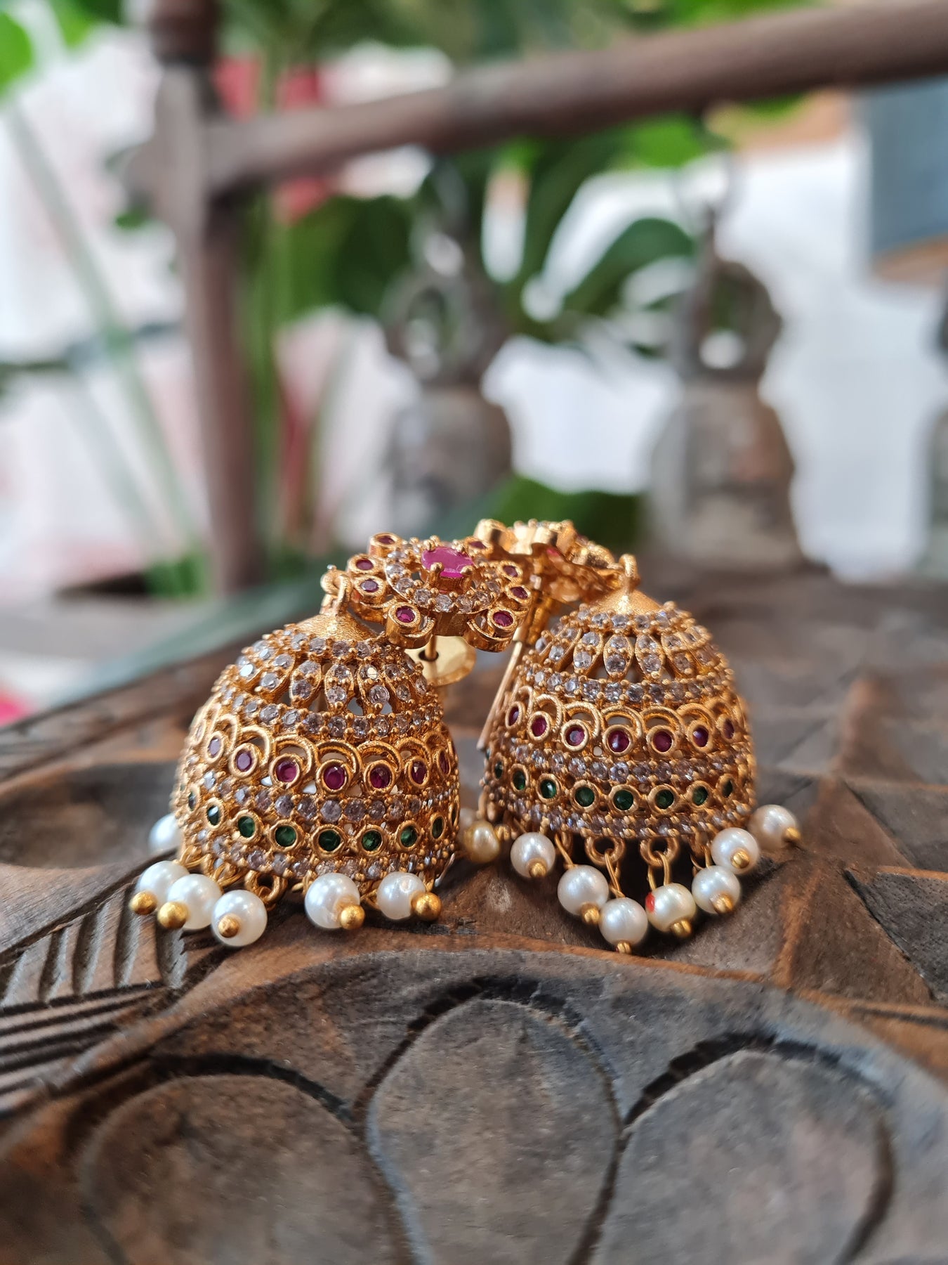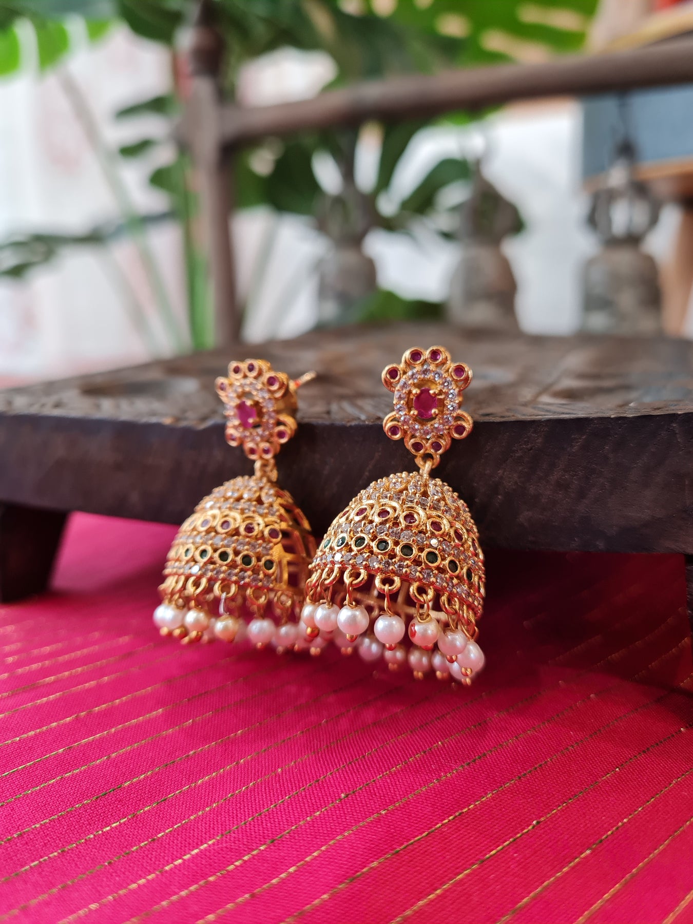 A beautiful necklace ornated with white, pink and green stones, and pearls, paired with matching Earrings