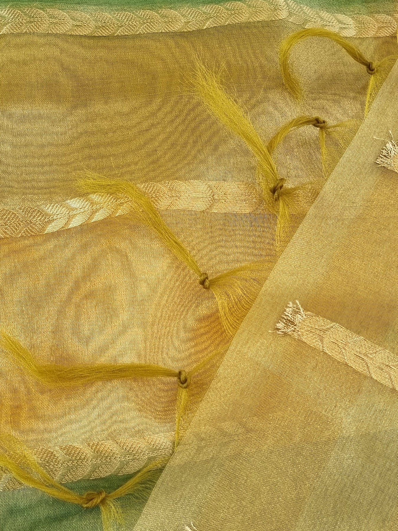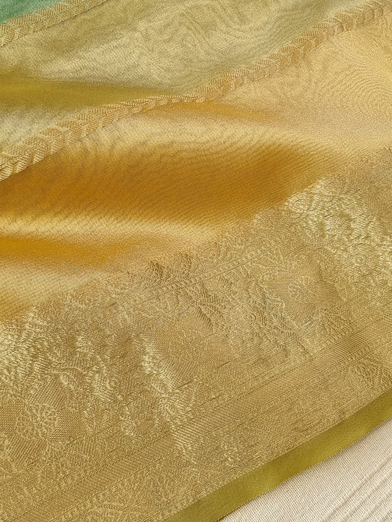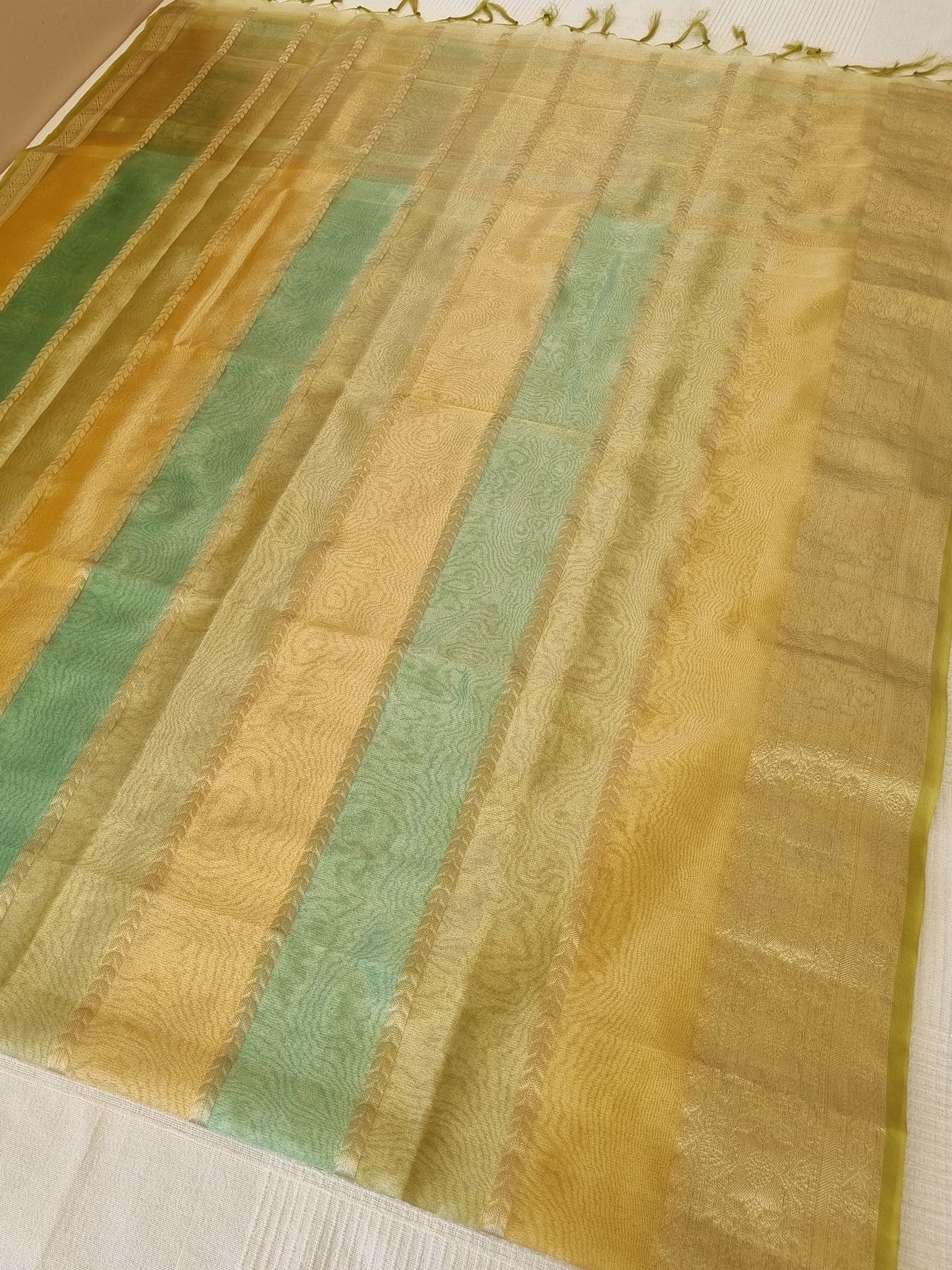 An elegant Green/Yellow Tissue Saree with Gold Borders
