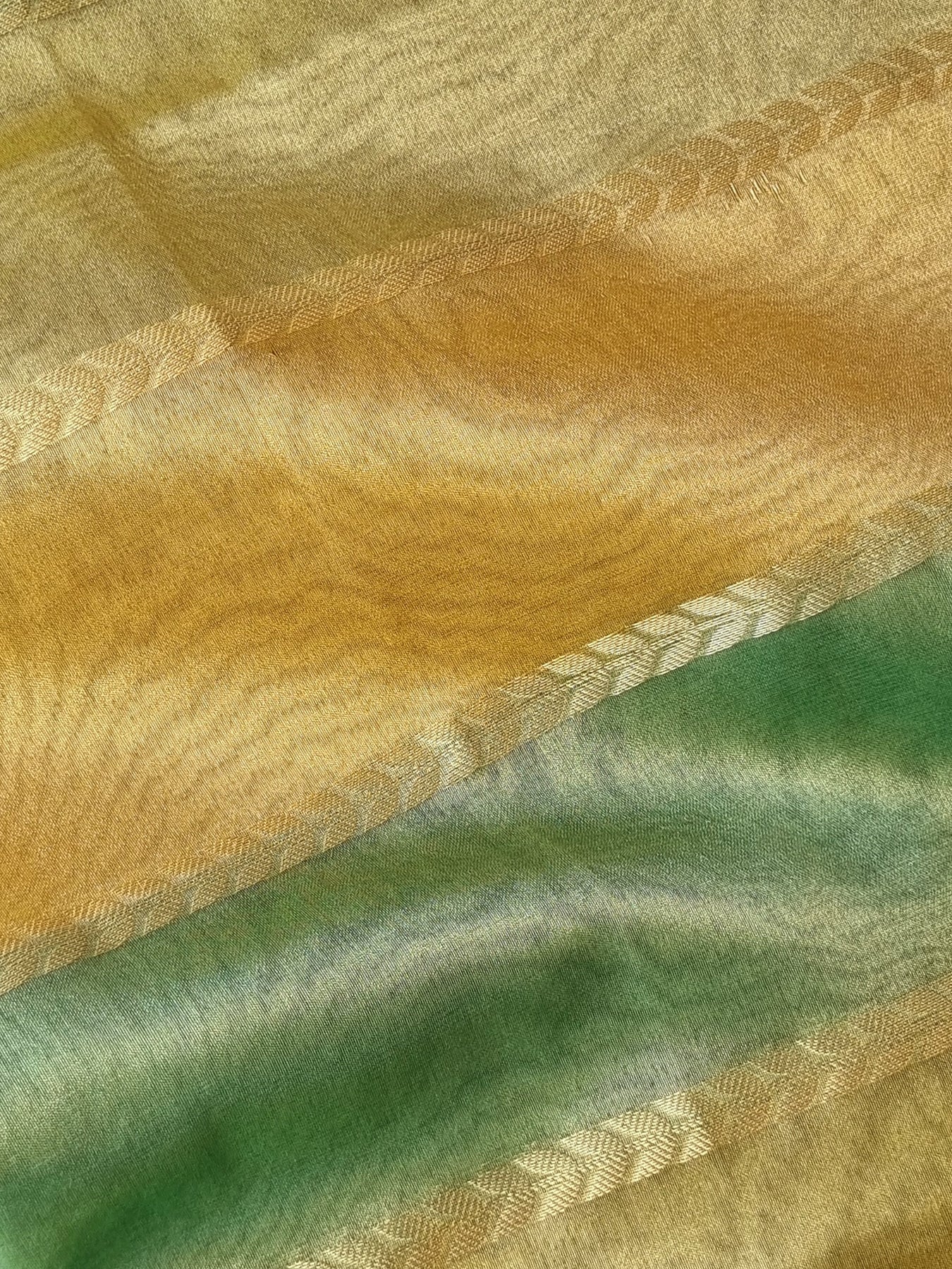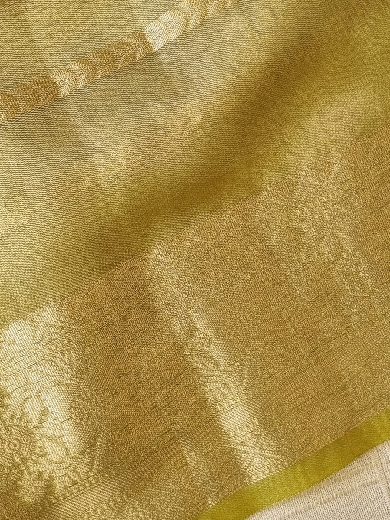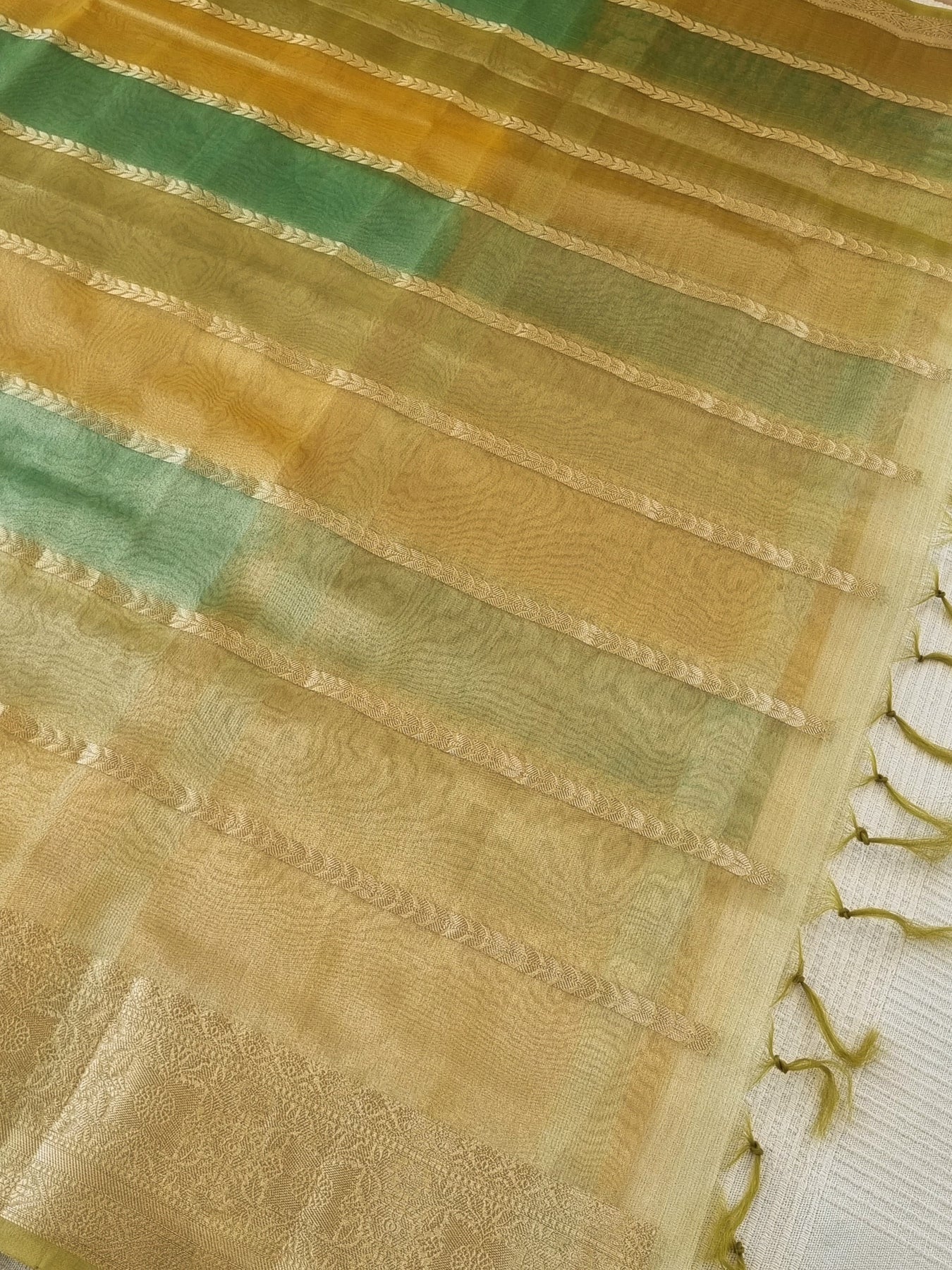 An elegant Green/Yellow Tissue Saree with Gold Borders