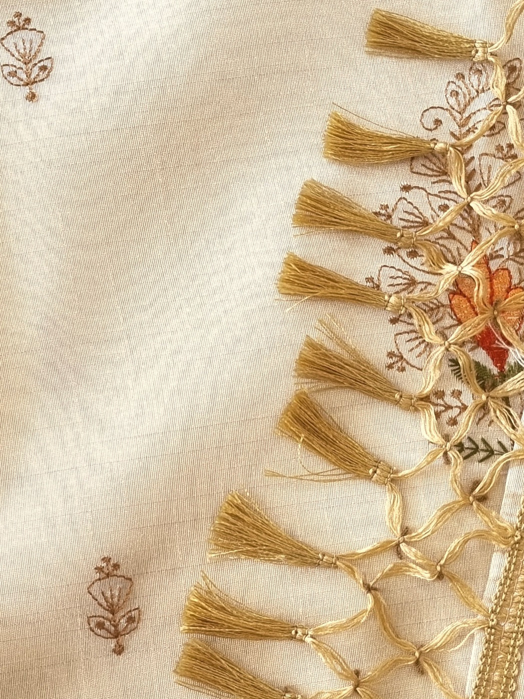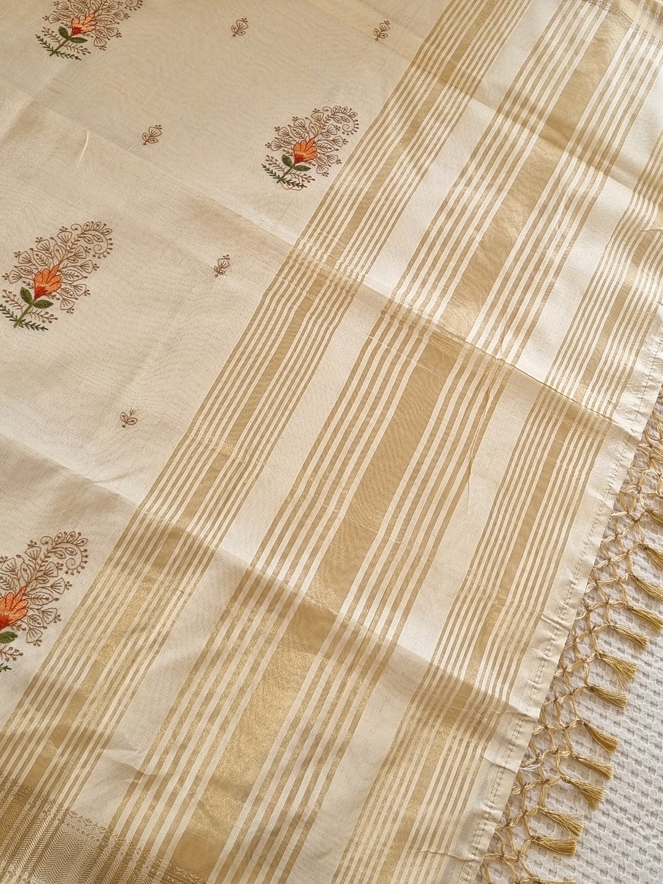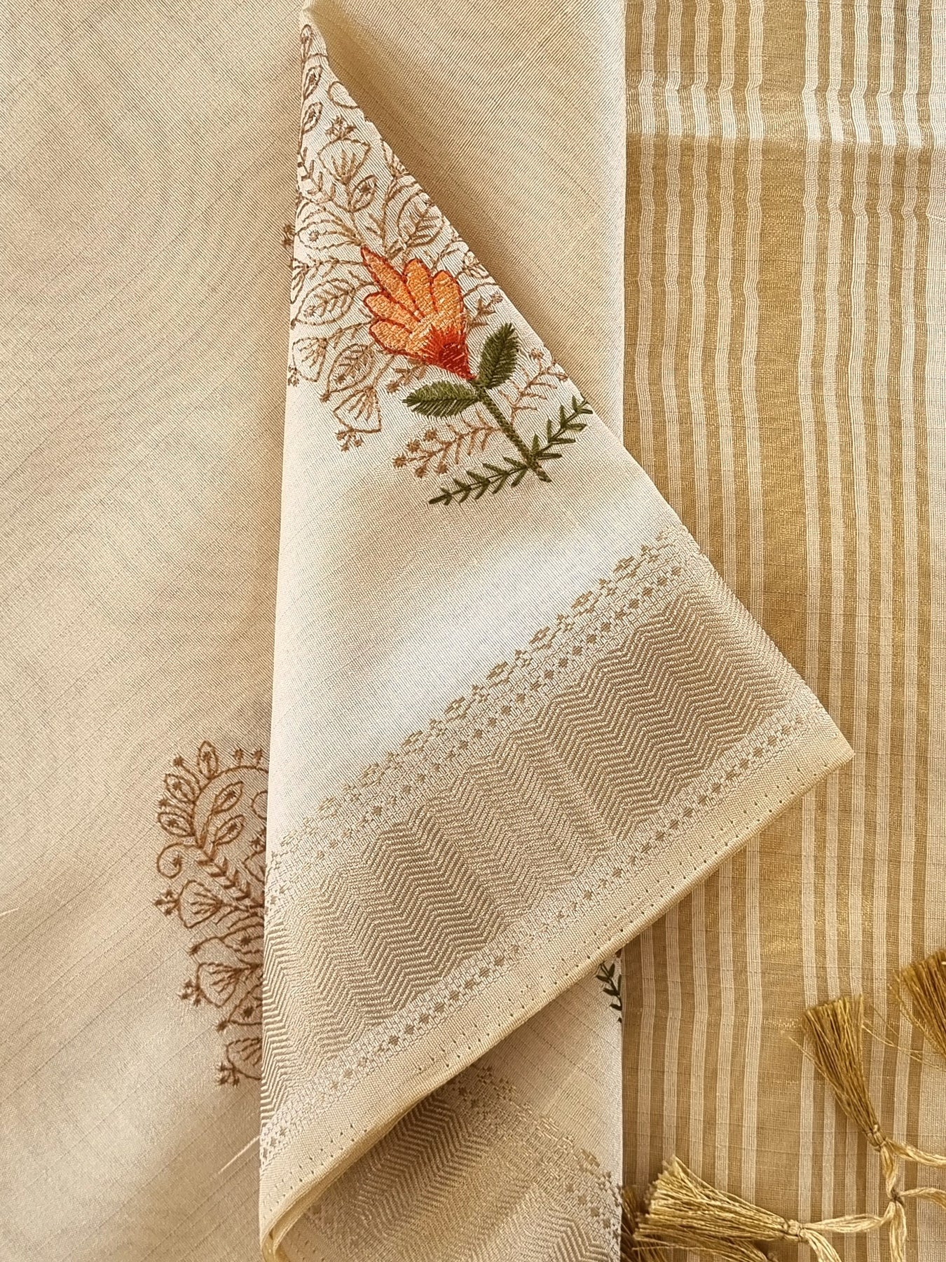 Silk Cotton Saree, with floral Embroidery on the body and striped pallu, beautifully finished with tassels