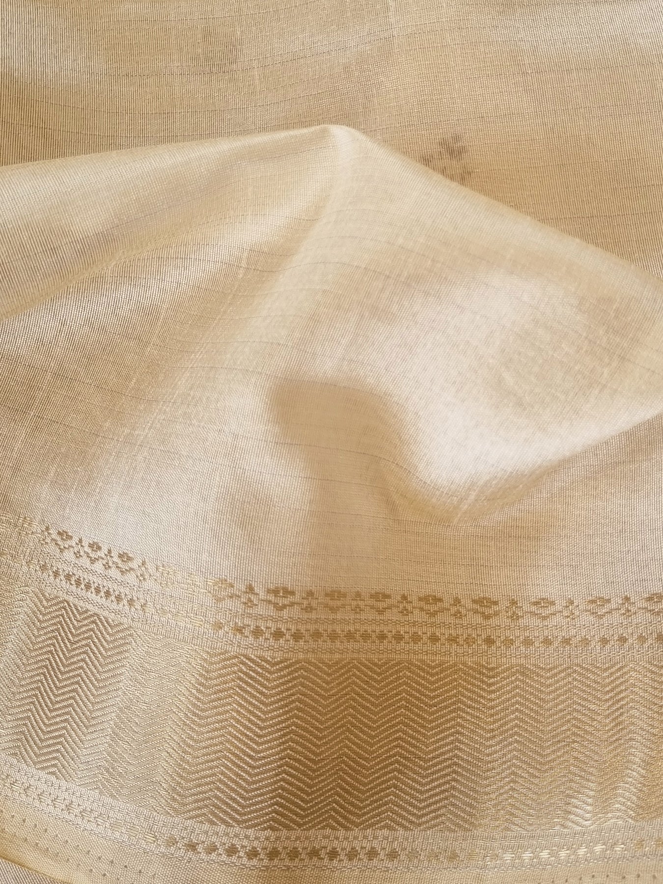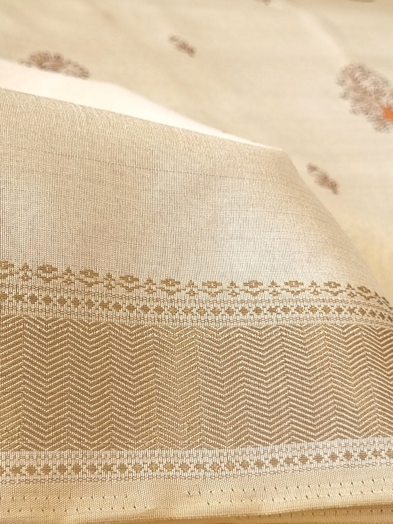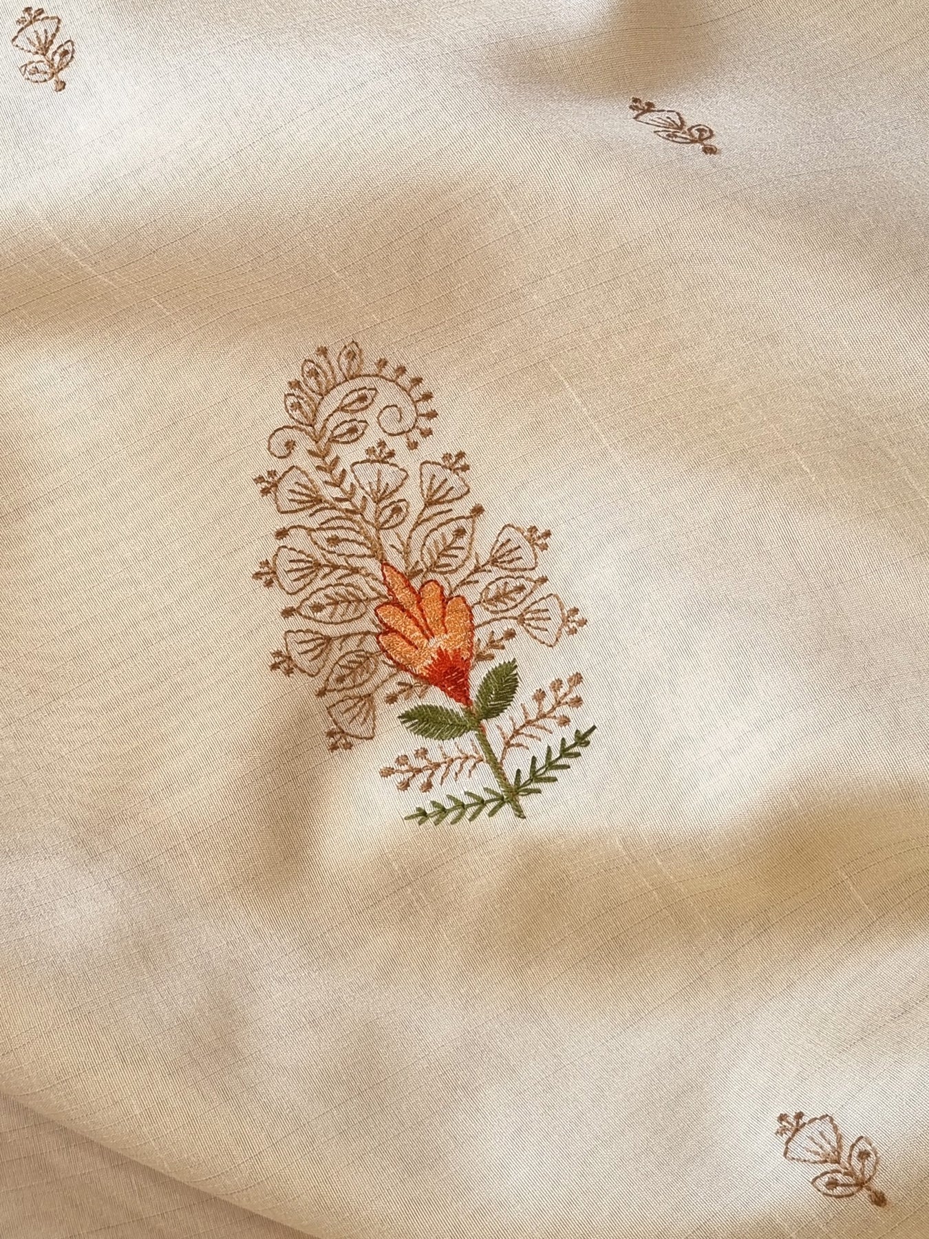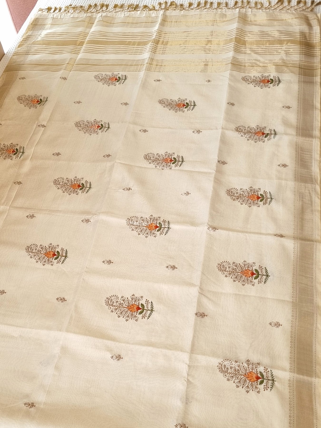 Silk Cotton Saree, with floral Embroidery on the body and striped pallu, beautifully finished with tassels