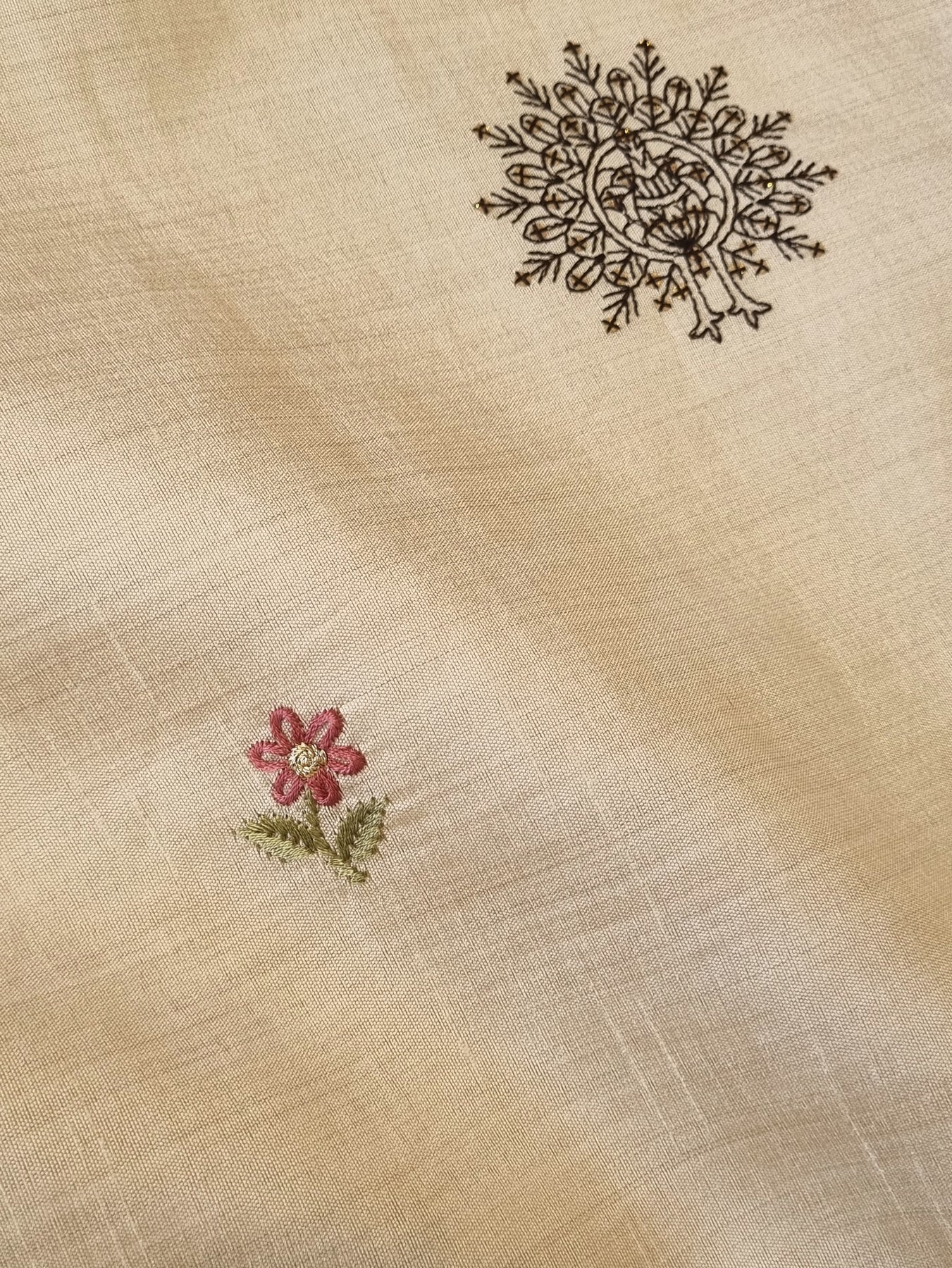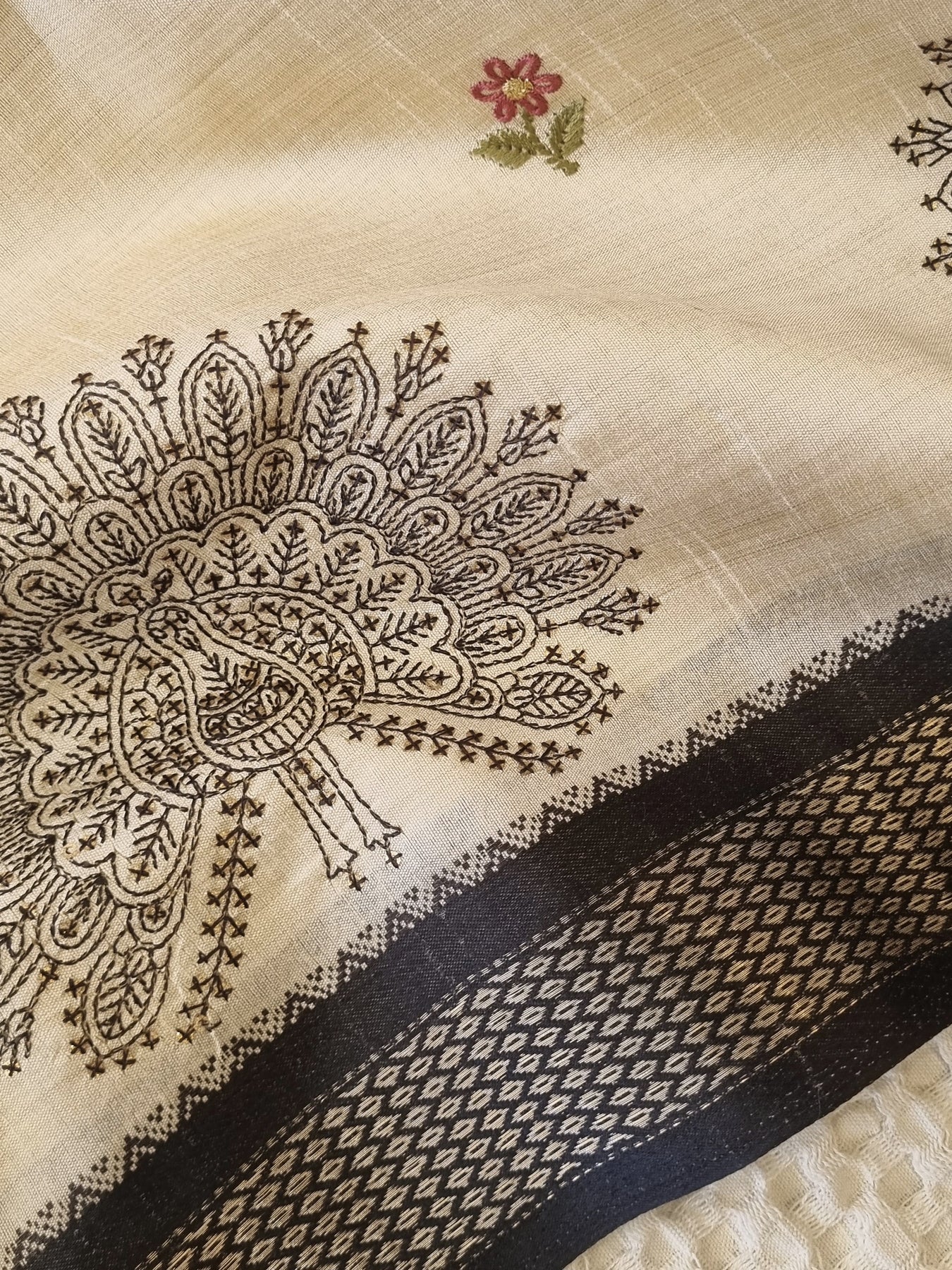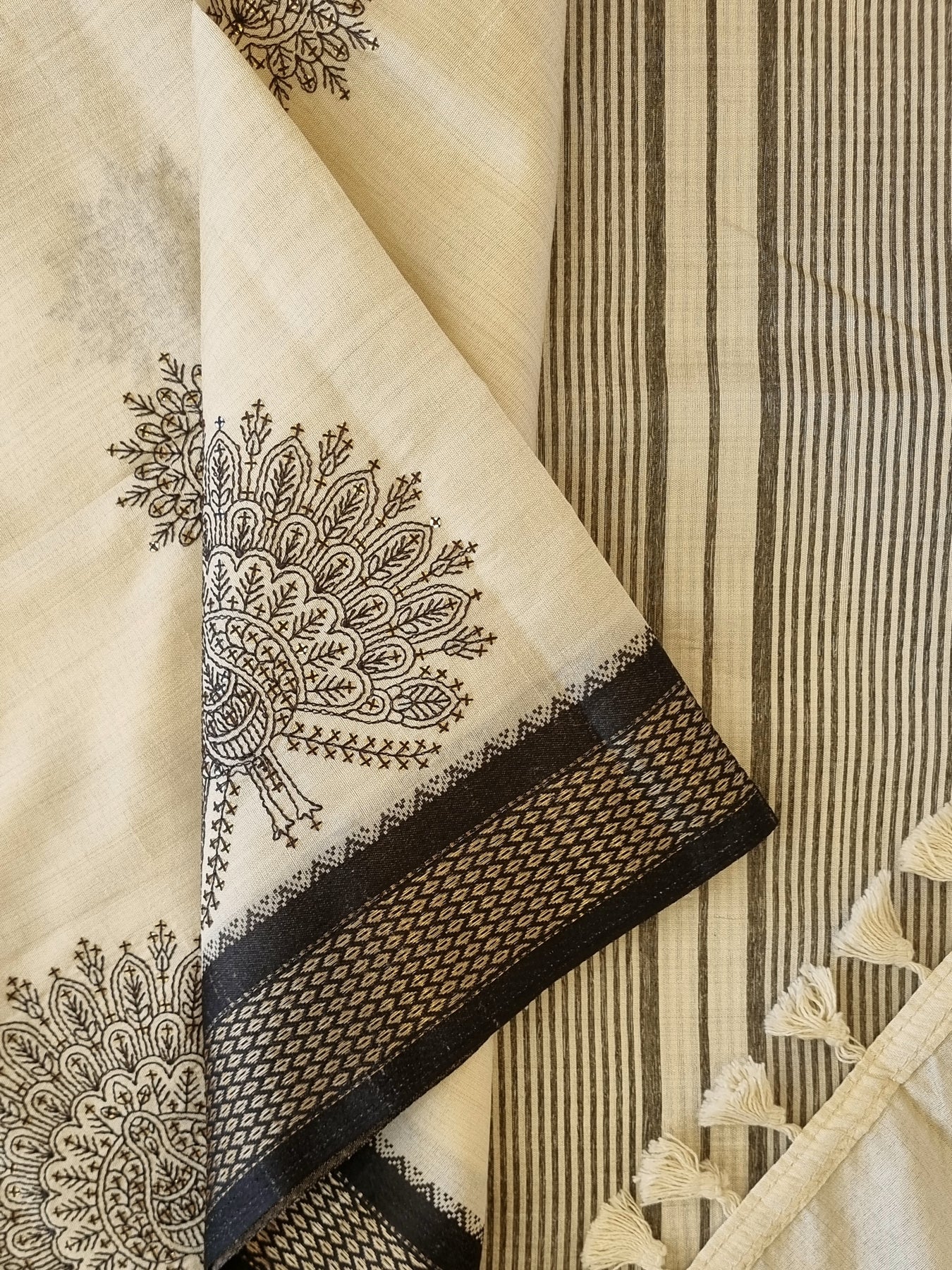 An elegant Semi Tussar silk saree with embroidered Peacock and Floral motifs