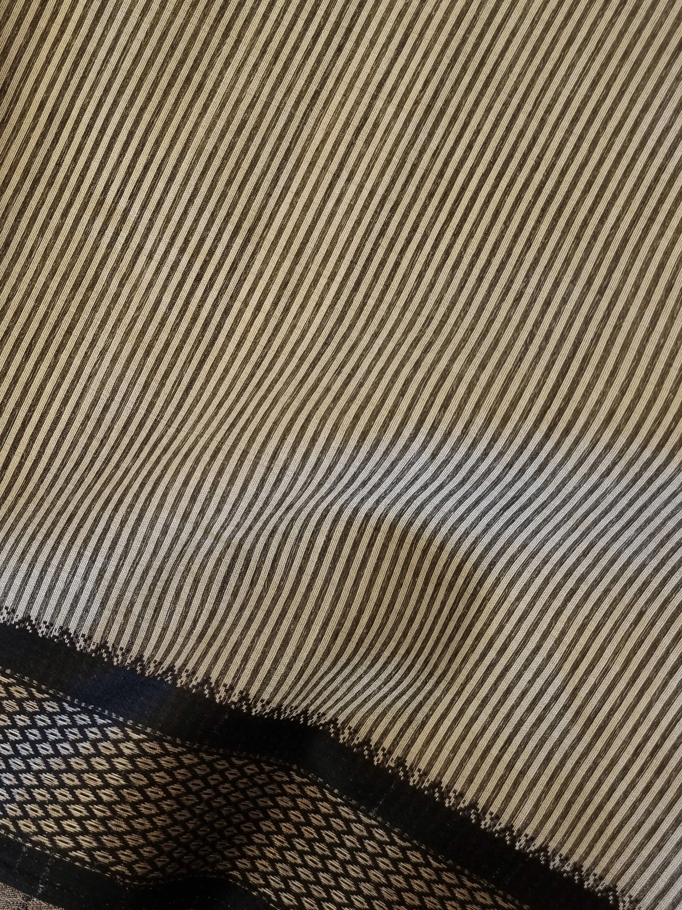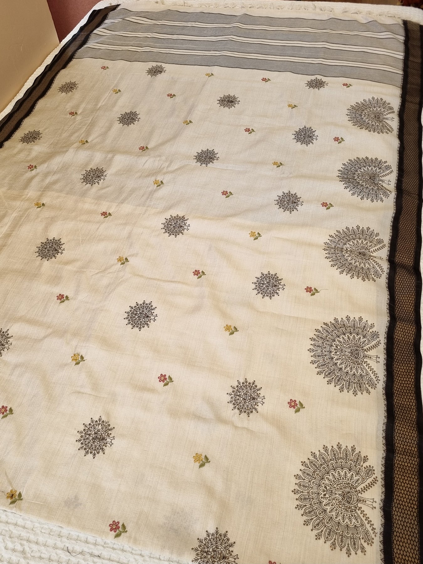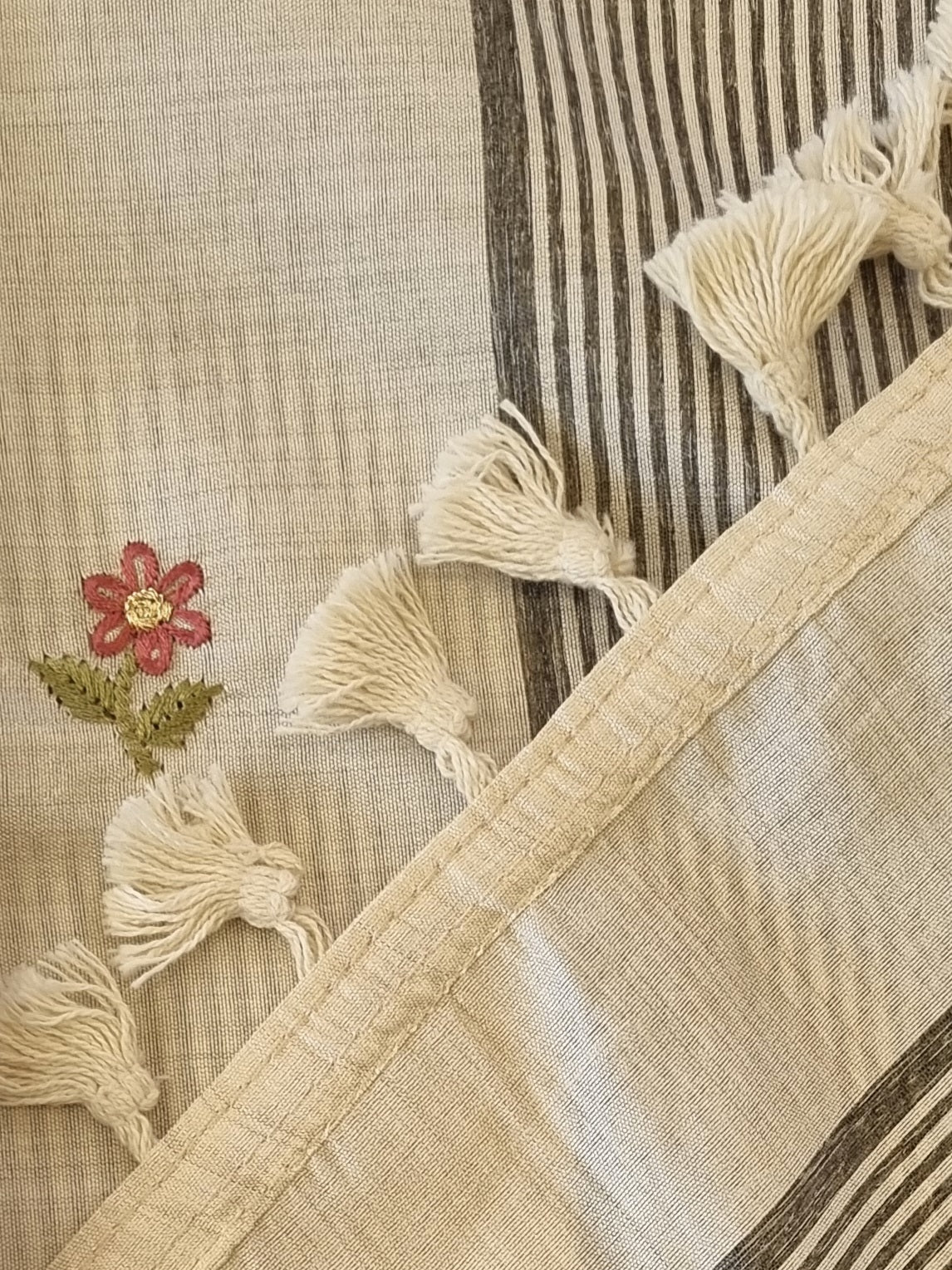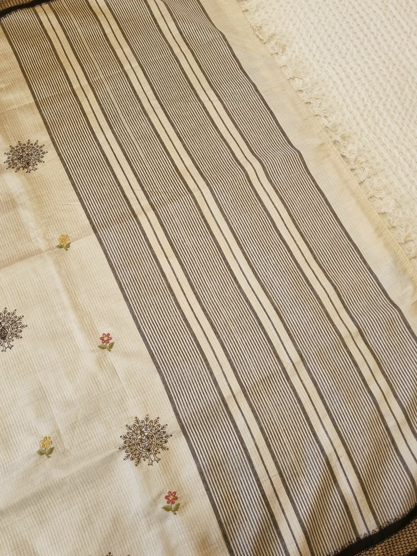 An elegant Semi Tussar silk saree with embroidered Peacock and Floral motifs